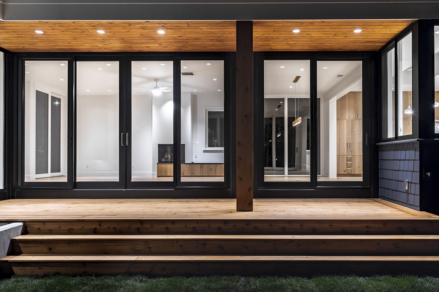 These recessed lights in wood-paneled ceiling at Maple Leaf Project serve as an excellent example of ambient lighting, also referred to as general lighting.