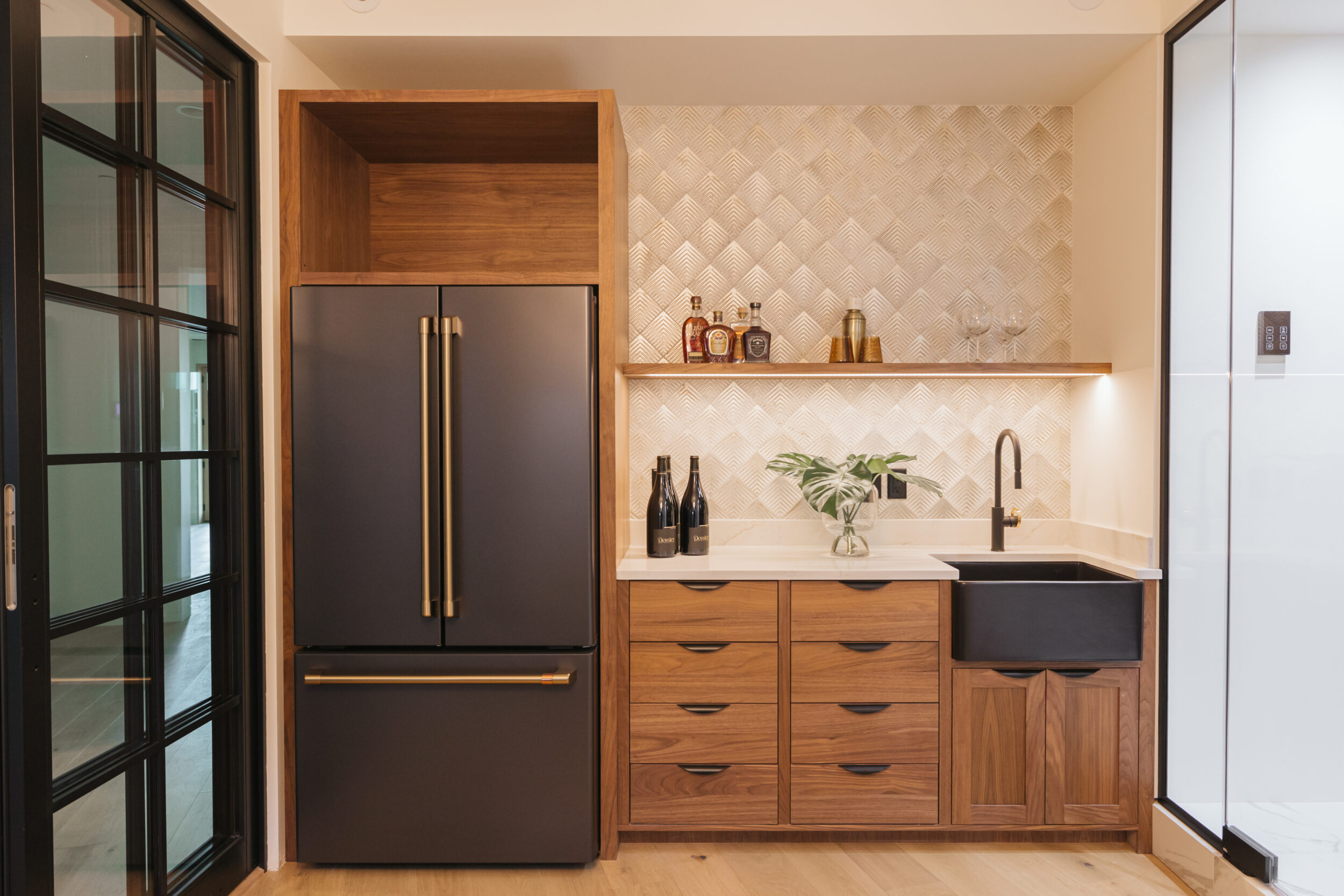 Enhance your wine room design with a sleek, modern wet bar that brings together function and design. Consider clean lines, premium materials, and a smart layout. An addition like this can fit luxuriously into your wine room’s refined atmosphere. Custom cabinetry with soft-close doors and sleek finishes can provide ample storage for glassware, bar tools, and spirits. Consider a durable quartz countertop to offer a chic workspace. A stylish backsplash and LED accent lighting can complete the look, adding elegance without overpowering the space.
