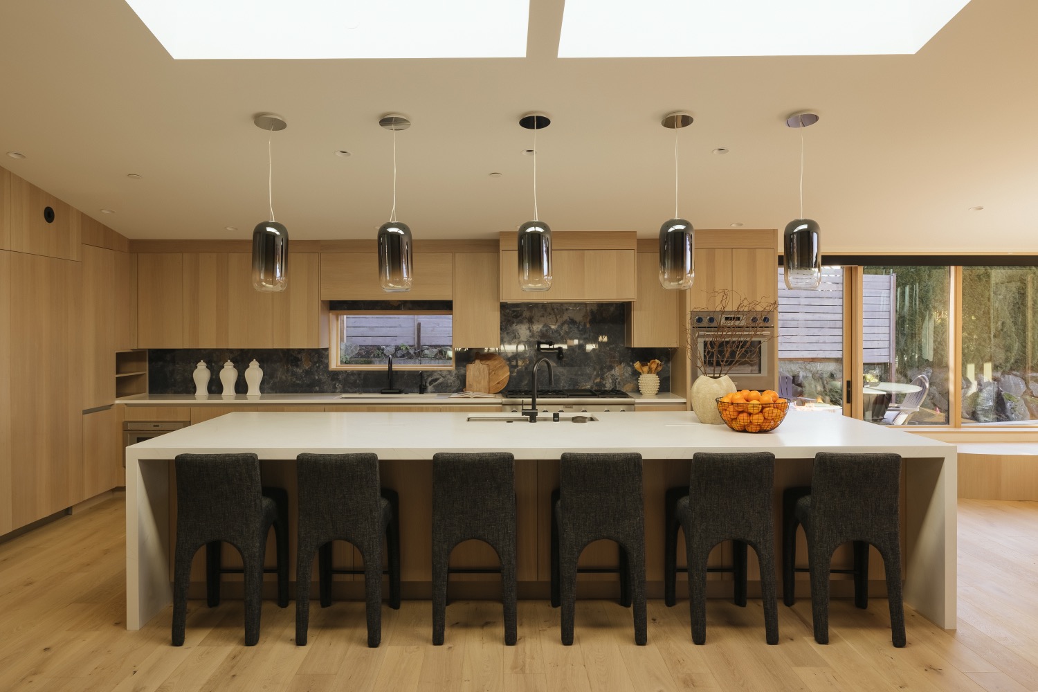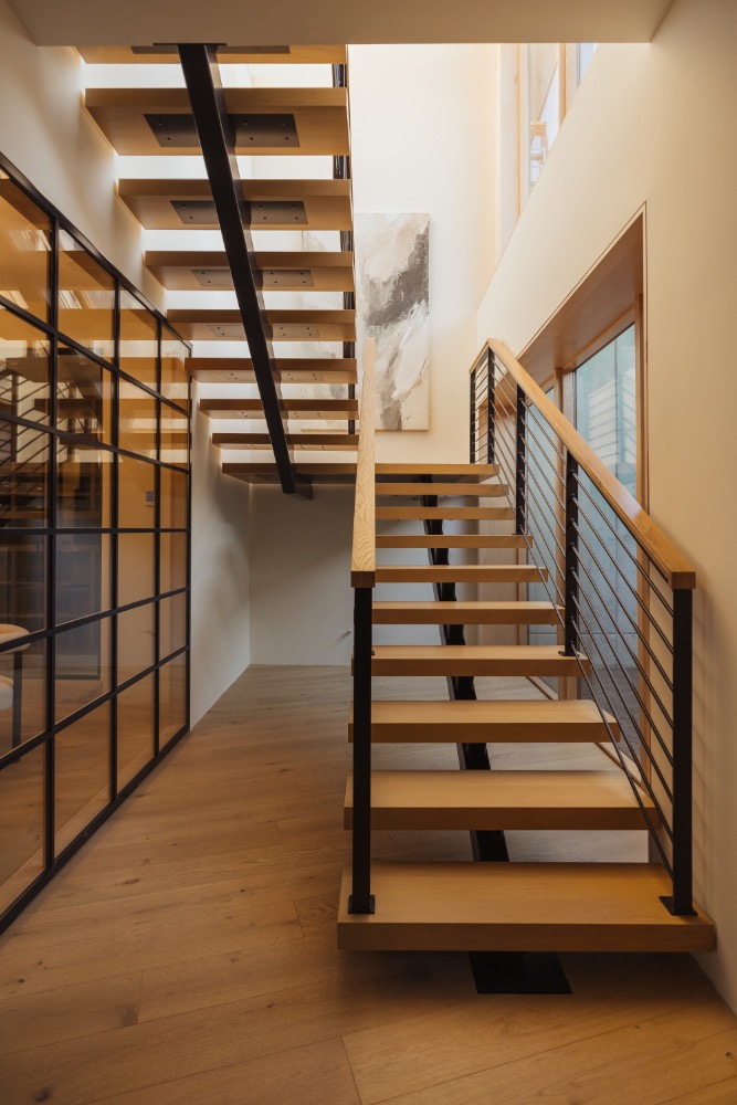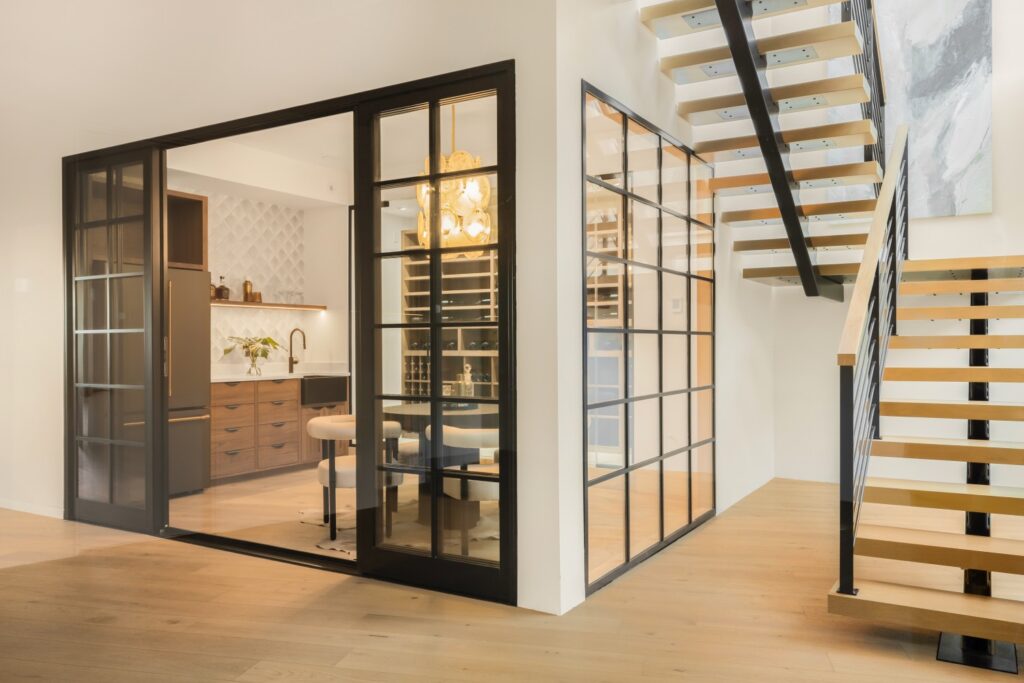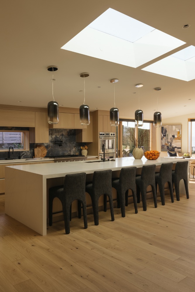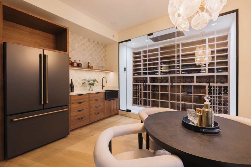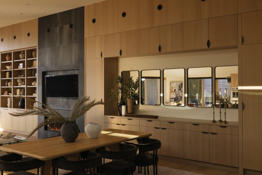 The 6,340 square foot project is made up of two levels. From the main street, the house is placed discreetly with a low-slope gabled roof, that was needed to comply with internal regulations of the neighborhood. A bridge gives access to the main entrance of the house across a sunken patio. In the Great Room, expansive windows with floor-to-ceiling sliding doors are used, which allows each entrance an abundance of natural light. An open kitchen with a custom designed modern banquette allows for extended seating and lounging along with the open elegant dining area and large spacious kitchen island. Taking advantage of the topography of the lot, a lower floor was created where the children’s rooms are located. A family room, and other spaces such as a gym and wine cellar, feature innovative lighting, mixed materials and glass entryways that further highlight the contemporary look of this Mid-century modern constructed home.