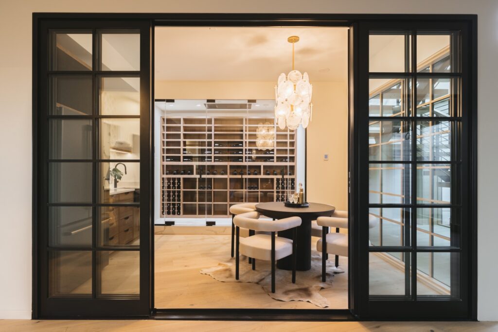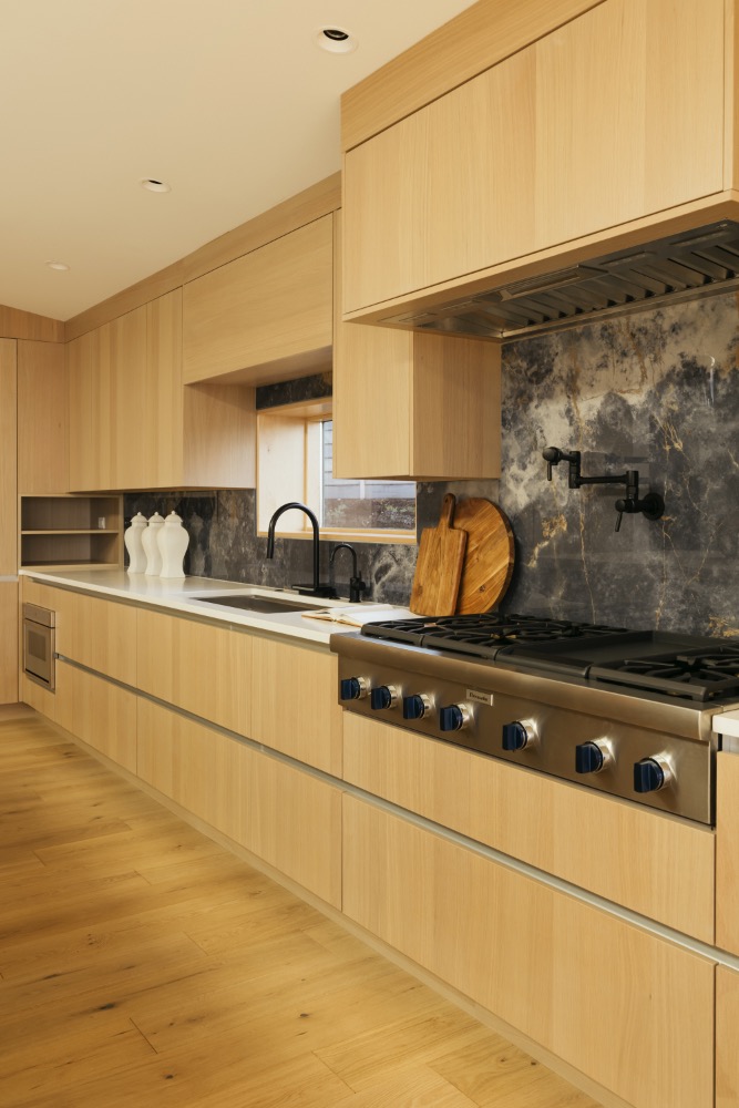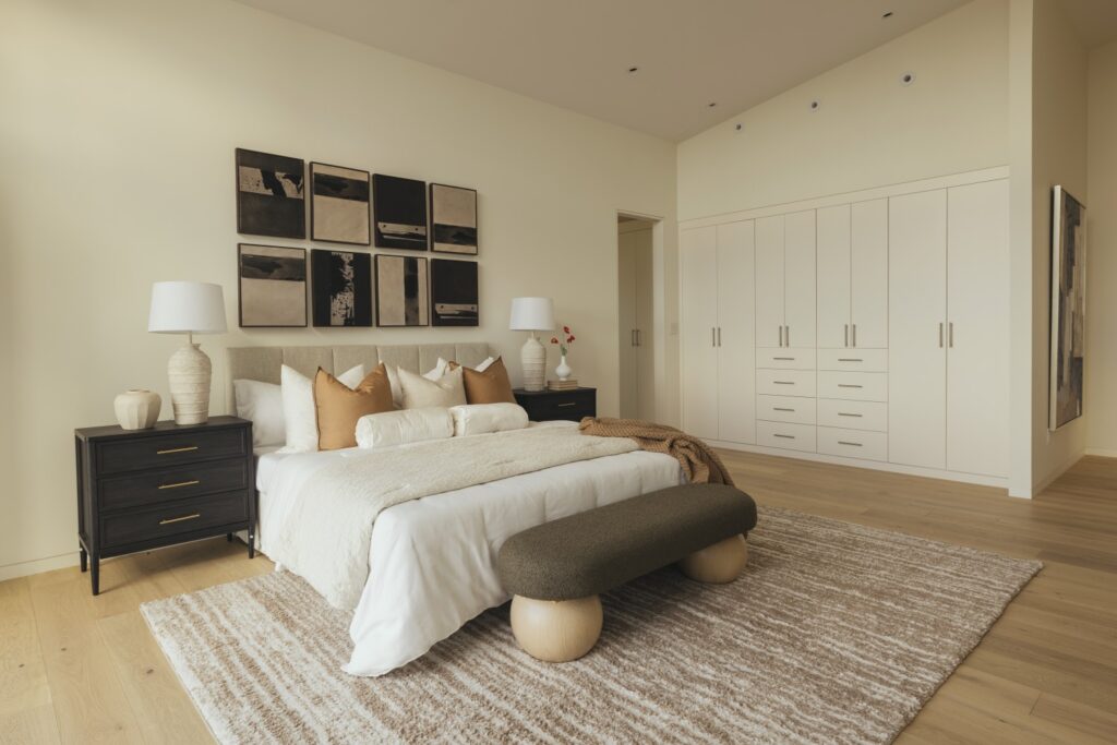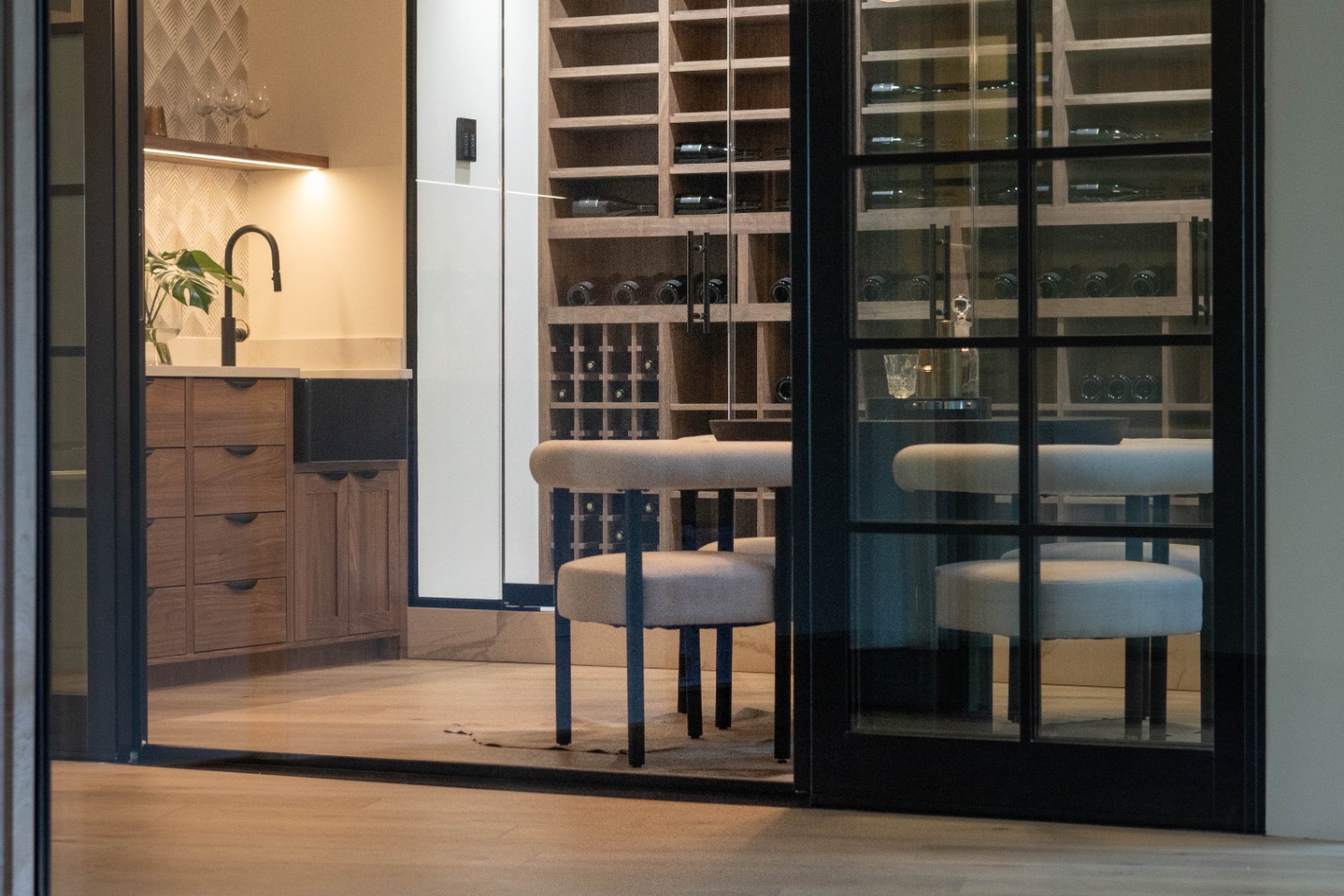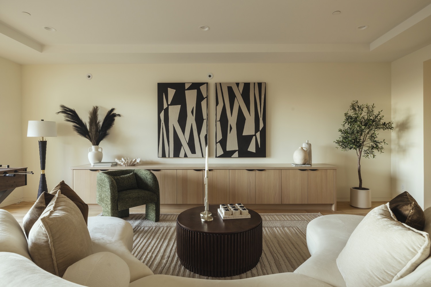 The 6,340 square foot project is made up of two levels. From the main street, the house is placed discreetly with a low-slope gabled roof, that was needed to comply with internal regulations of the neighborhood. A bridge gives access to the main entrance of the house across a sunken patio. In the Great Room, expansive windows with floor-to-ceiling sliding doors are used, which allows each entrance an abundance of natural light. An open kitchen with a custom designed modern banquette allows for extended seating and lounging along with the open elegant dining area and large spacious kitchen island. Taking advantage of the topography of the lot, a lower floor was created where the children’s rooms are located. A family room, and other spaces such as a gym and wine cellar, feature innovative lighting, mixed materials and glass entryways that further highlight the contemporary look of this Mid-century modern constructed home.