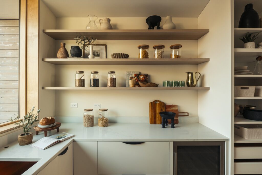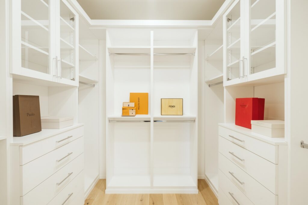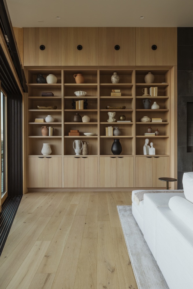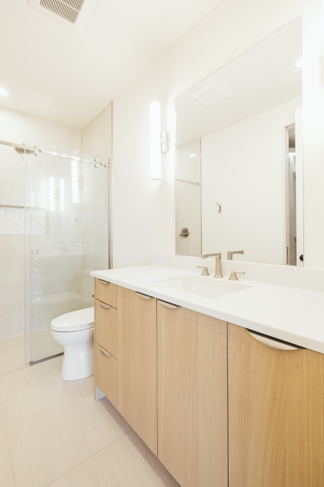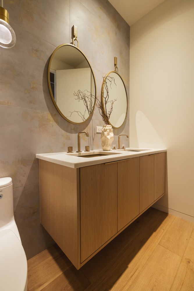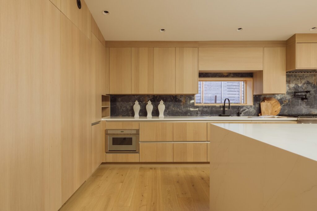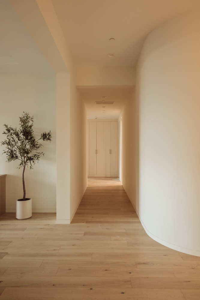 The 6,340 square foot project is made up of two levels. From the main street, the house is placed discreetly with a low-slope gabled roof, that was needed to comply with internal regulations of the neighborhood. A bridge gives access to the main entrance of the house across a sunken patio. In the Great Room, expansive windows with floor-to-ceiling sliding doors are used, which allows each entrance an abundance of natural light. An open kitchen with a custom designed modern banquette allows for extended seating and lounging along with the open elegant dining area and large spacious kitchen island. Taking advantage of the topography of the lot, a lower floor was created where the children’s rooms are located. A family room, and other spaces such as a gym and wine cellar, feature innovative lighting, mixed materials and glass entryways that further highlight the contemporary look of this Mid-century modern constructed home.