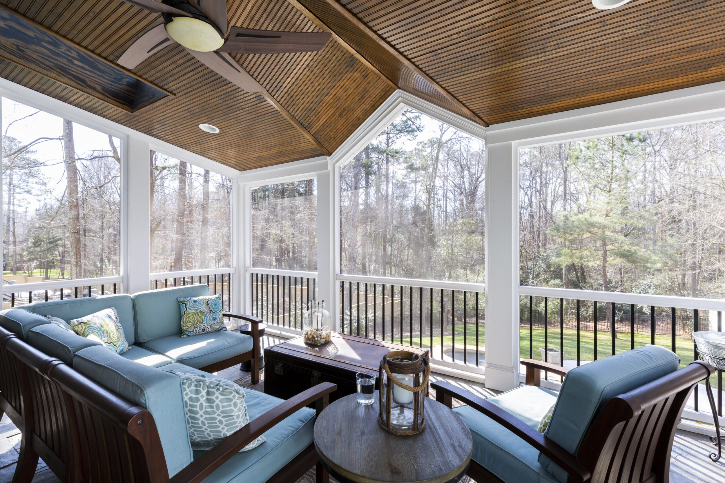 Covered porches and patios have continued to increase in popularity and have become an extension of our interiors providing more space to socialize and unwind with family and friends. For a cozy feel that mimics indoor living, consider incorporating similar design elements such as rugs, furniture, and pillows to create a cozy atmosphere.
