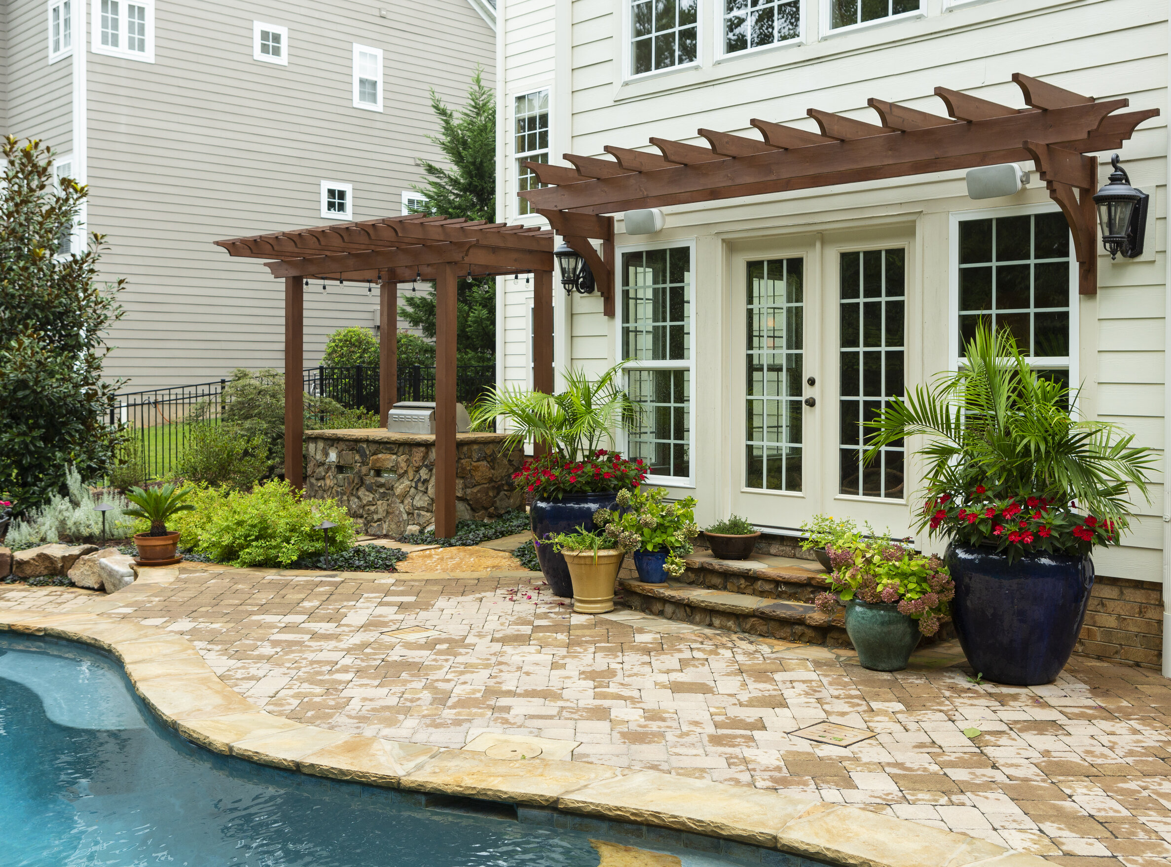 An ongoing trend that we continue to design and incorporate in outdoor living spaces are fully-functional outdoor kitchens. Thinking beyond just a grilling station, and putting a greater focus on entertaining, homeowners are looking to design their outdoor kitchens with special elements like a wood fired pizza oven, wine and beverage cooler, and high end wet bars.