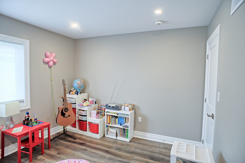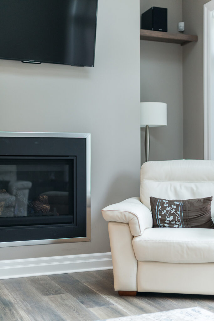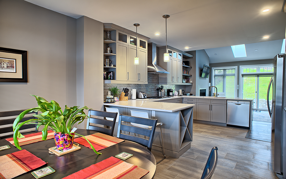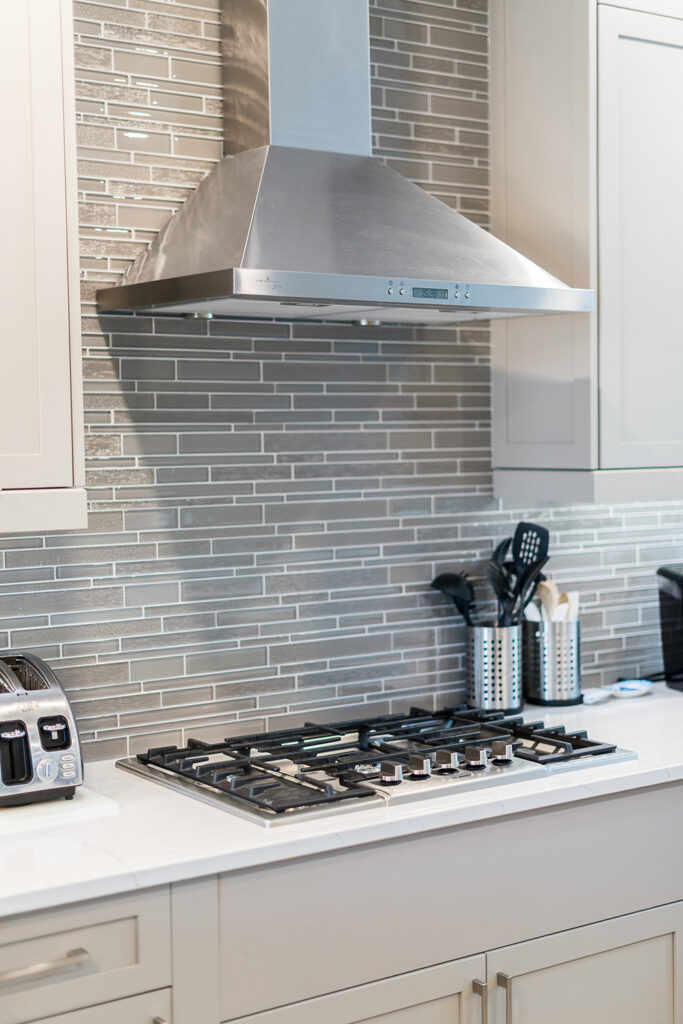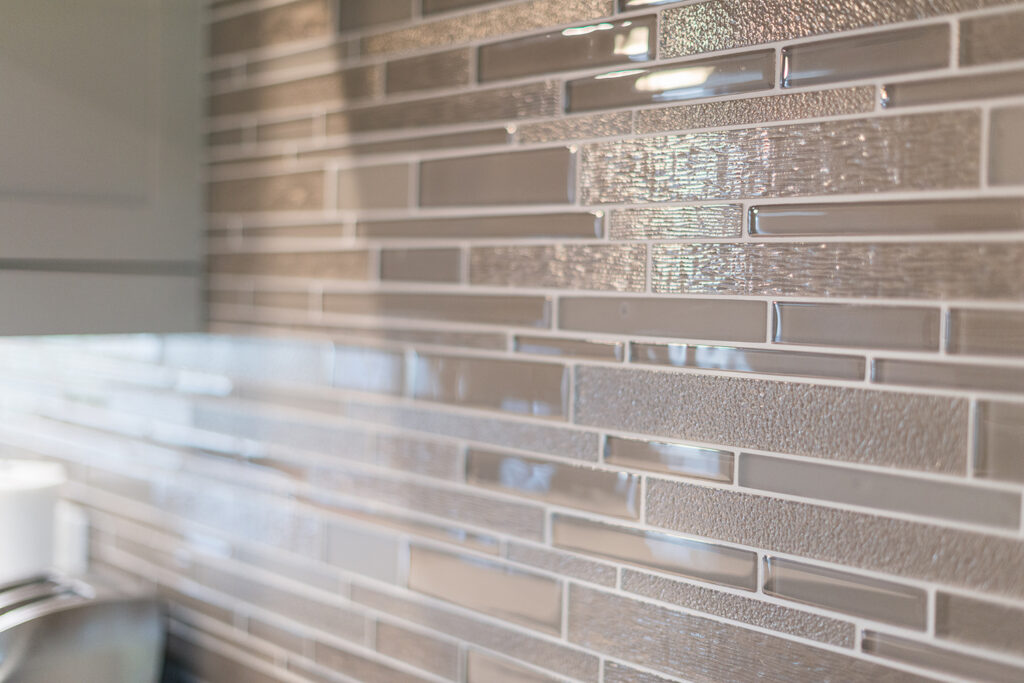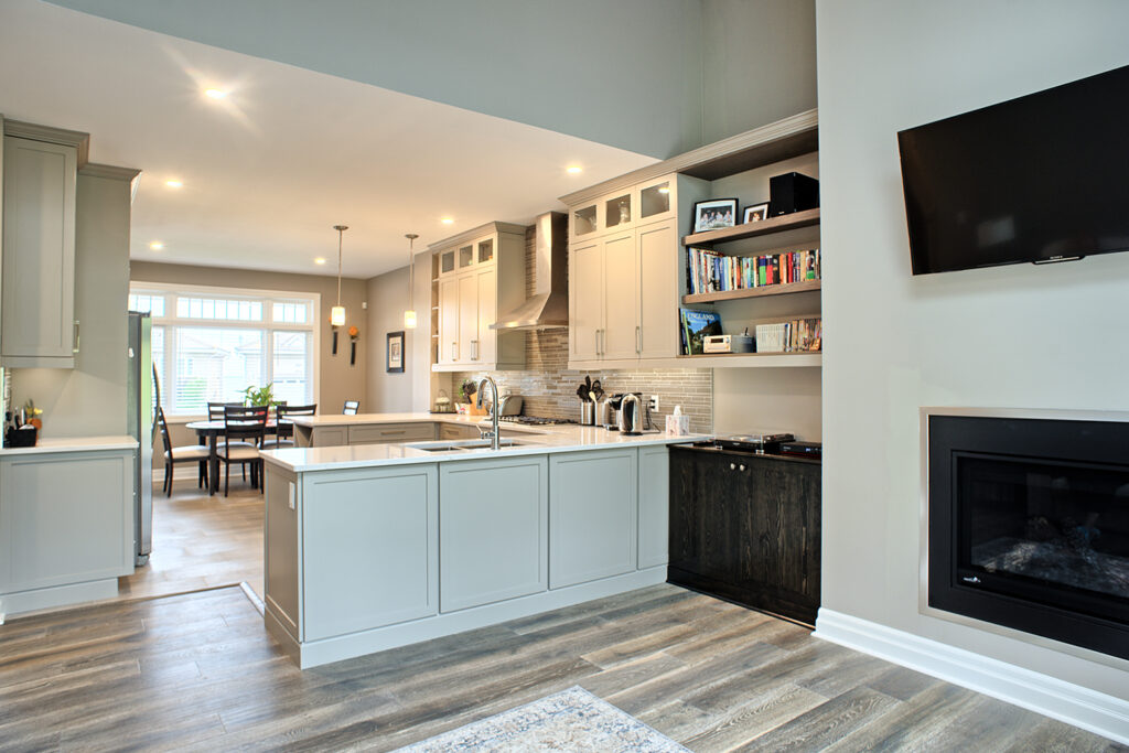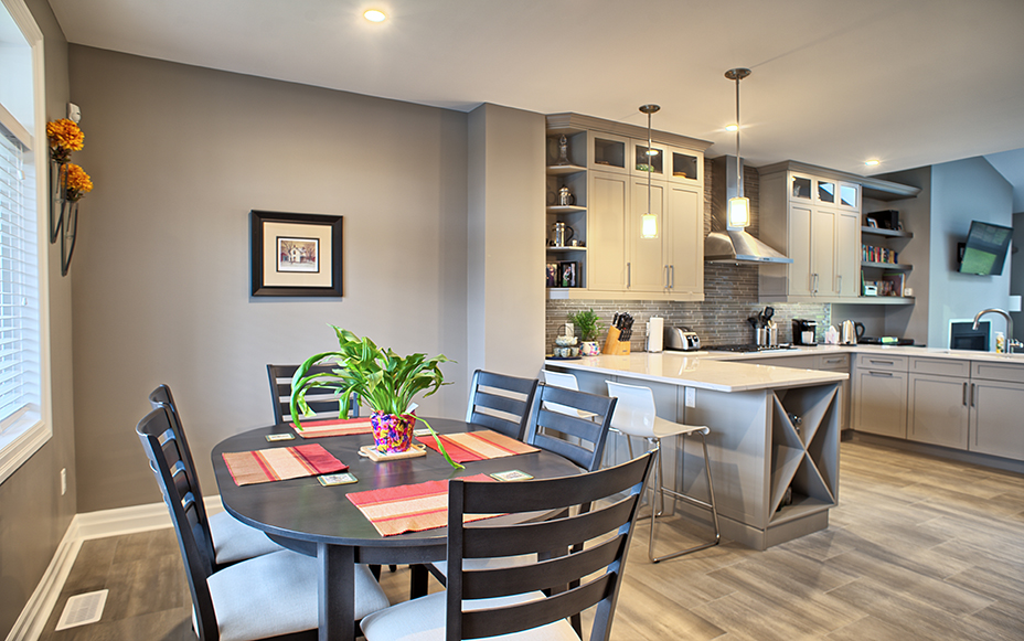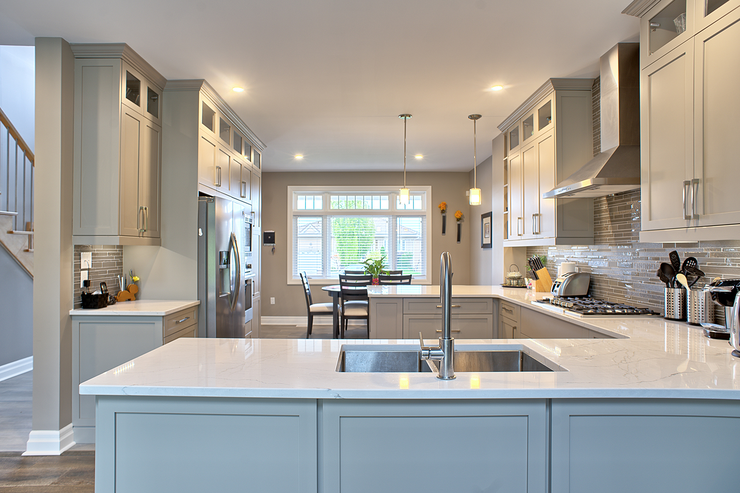 This custom home features an open-concept great room; joining the kitchen, dining, and living room together for a bright and open feel. The light greys and whites, coupled with glass tile backsplash in the kitchen, and other high-end finishes, brings together this modern design.