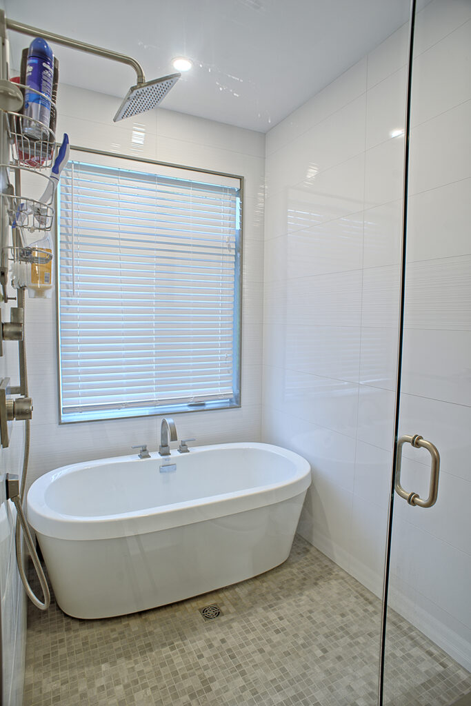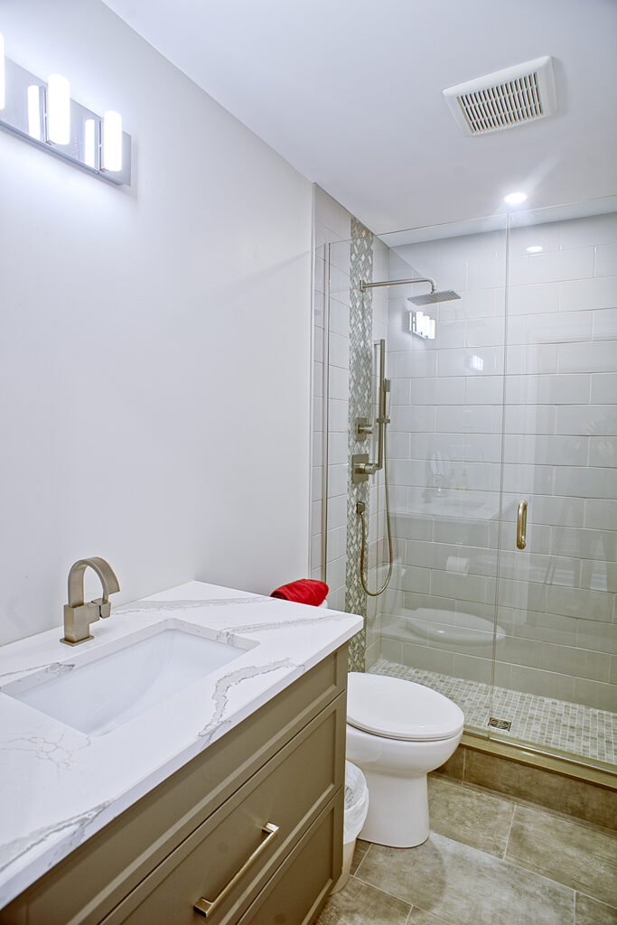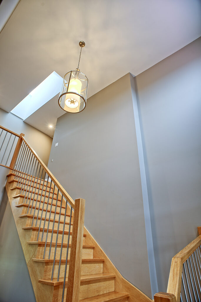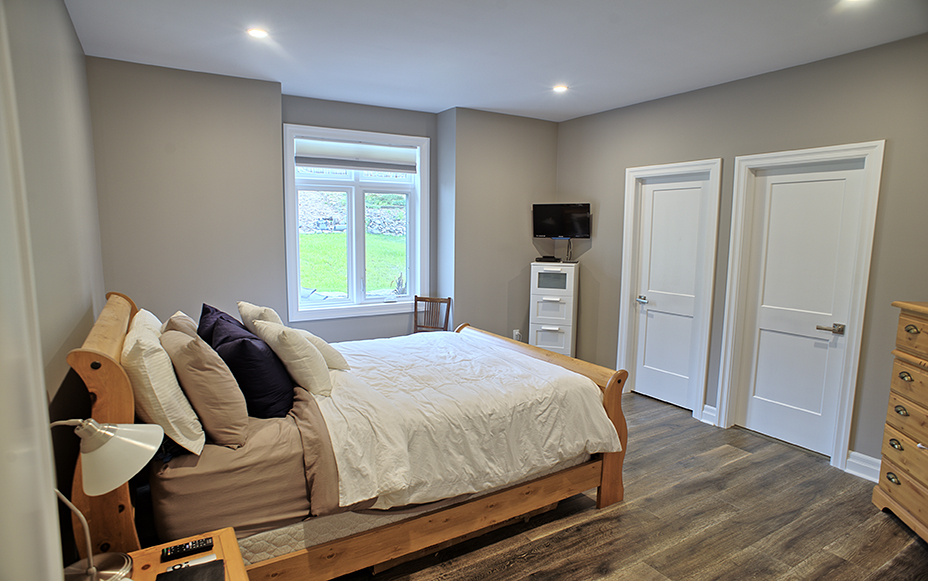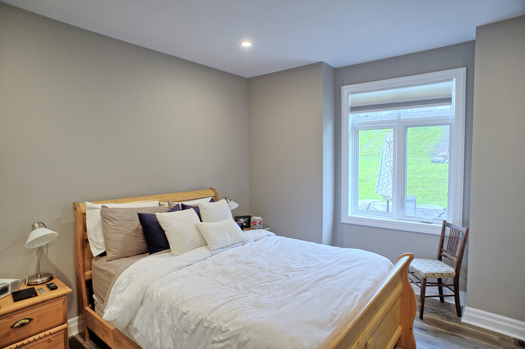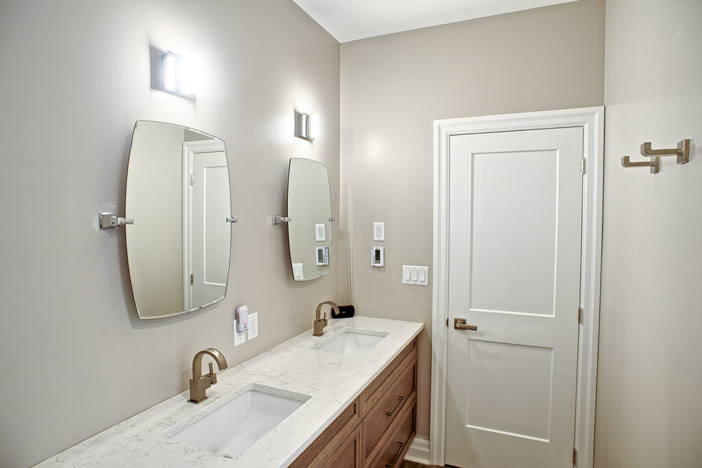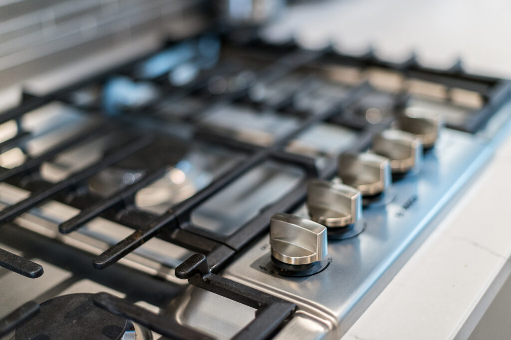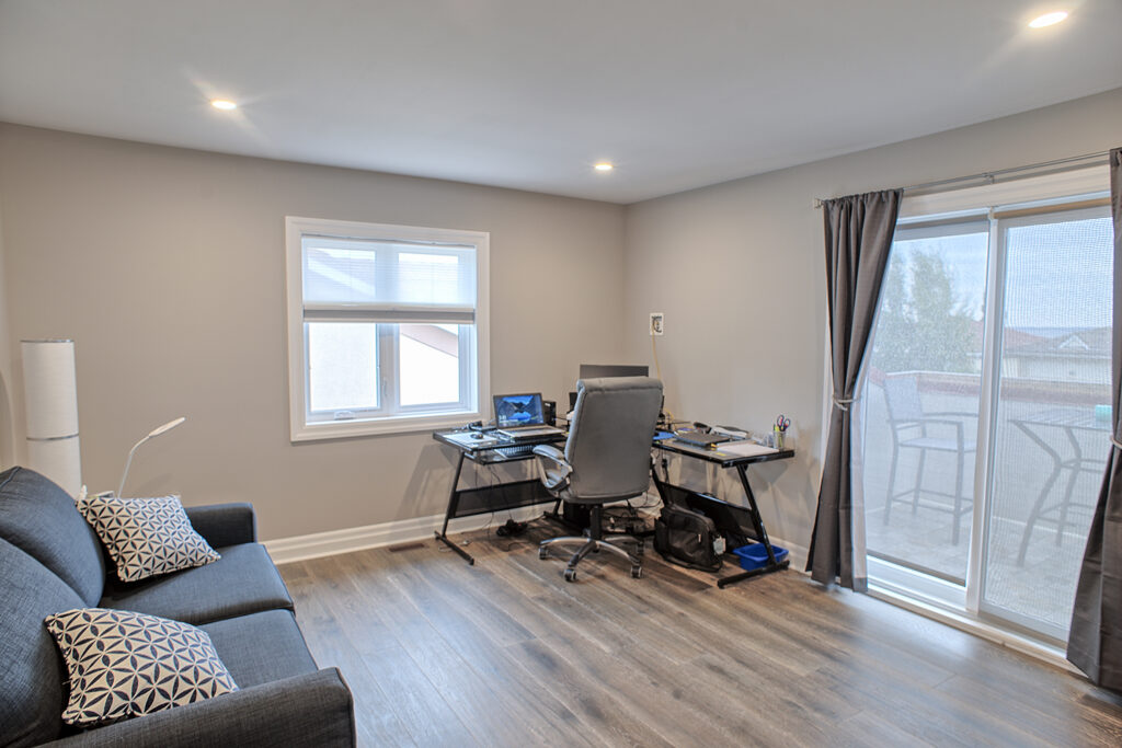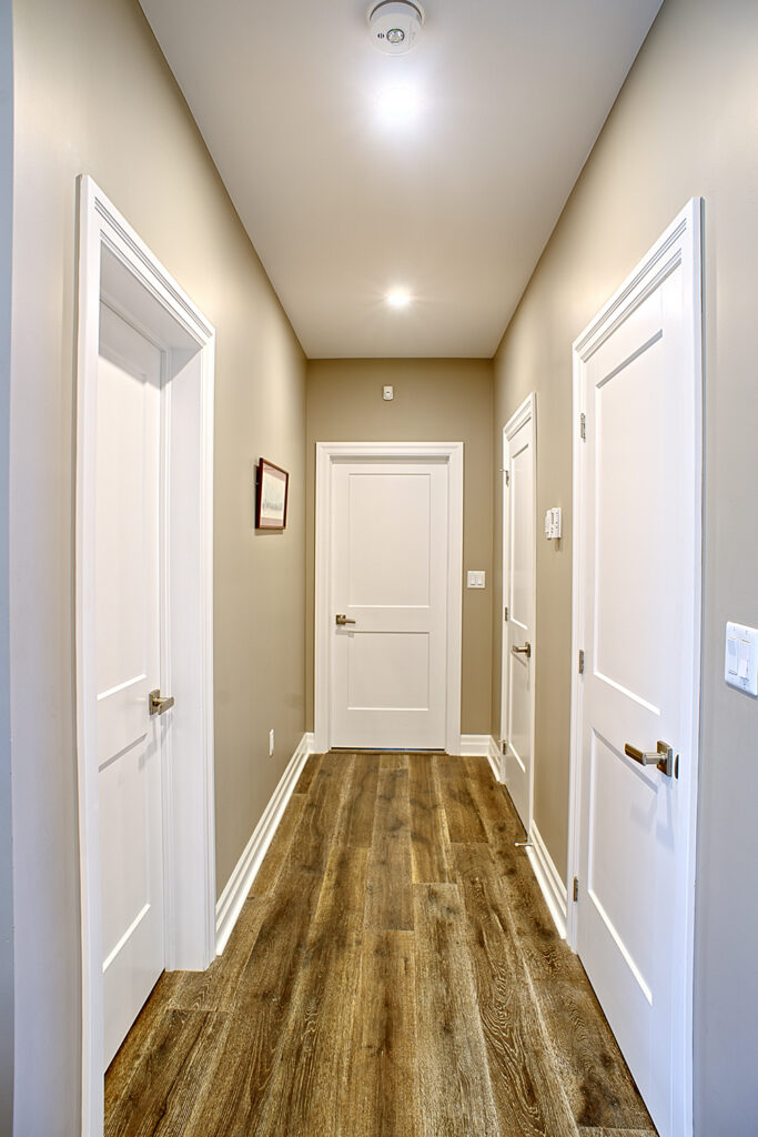 This custom home features an open-concept great room; joining the kitchen, dining, and living room together for a bright and open feel. The light greys and whites, coupled with glass tile backsplash in the kitchen, and other high-end finishes, brings together this modern design.