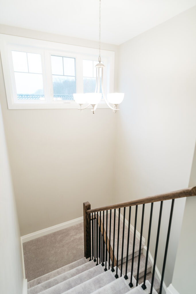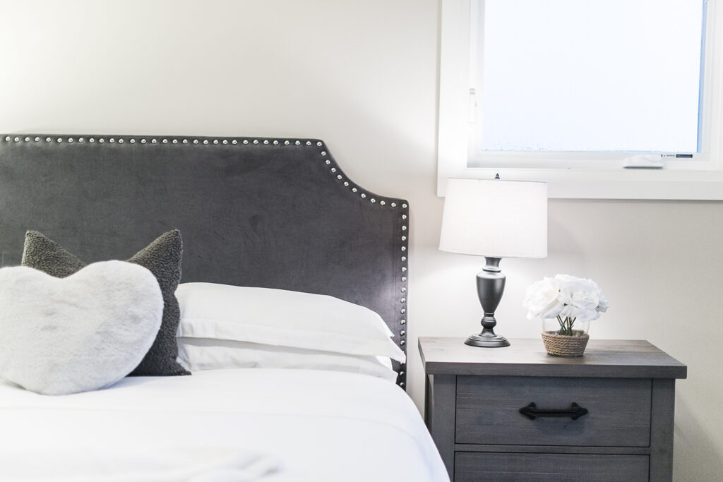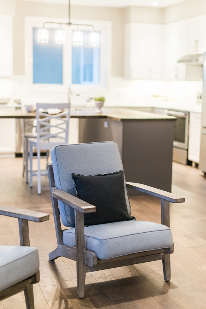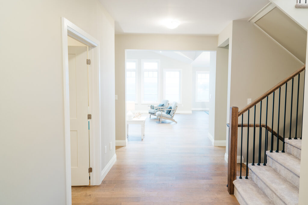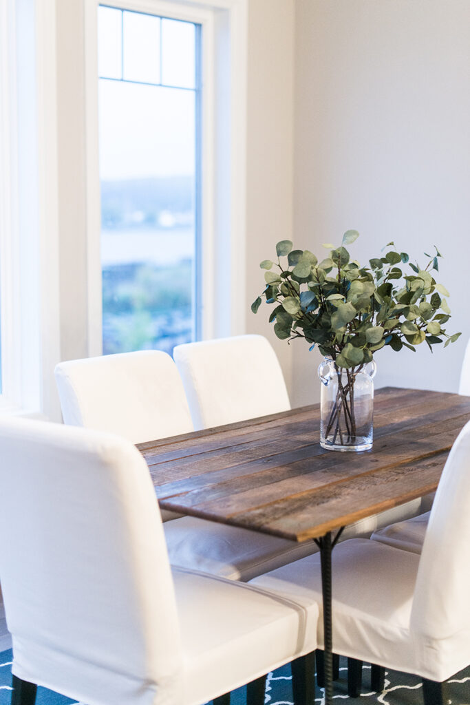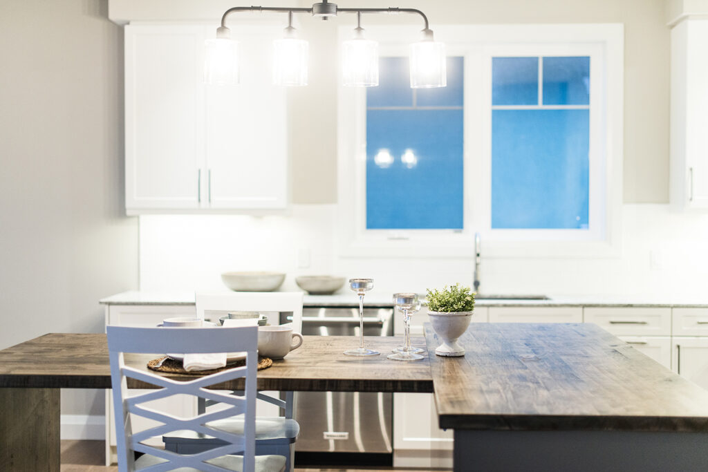 This 4 bedroom, 2.5 bath custom home features an open-concept layout with vaulted ceilings and hardwood floors throughout. The kitchen and living room features a blend of rustic and modern design elements – distressed wood counters and finishes, white cabinets and chairs, and stainless-steel appliances create a cozy and sophisticated atmosphere. The wood stove in the living room adds to the rustic charm of the space.