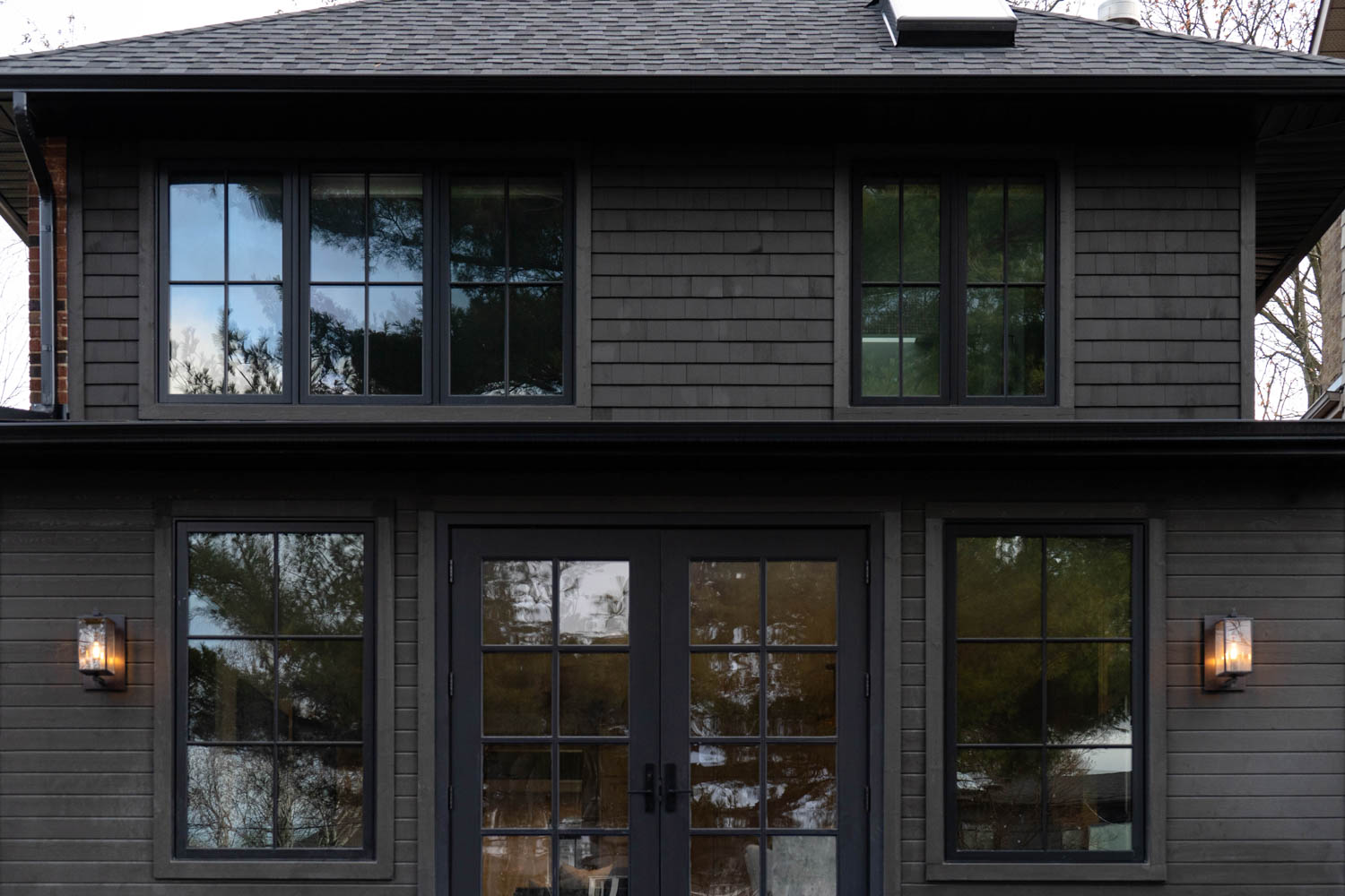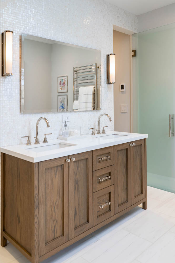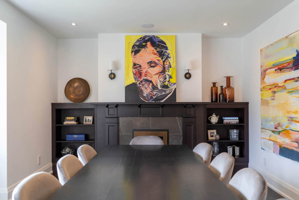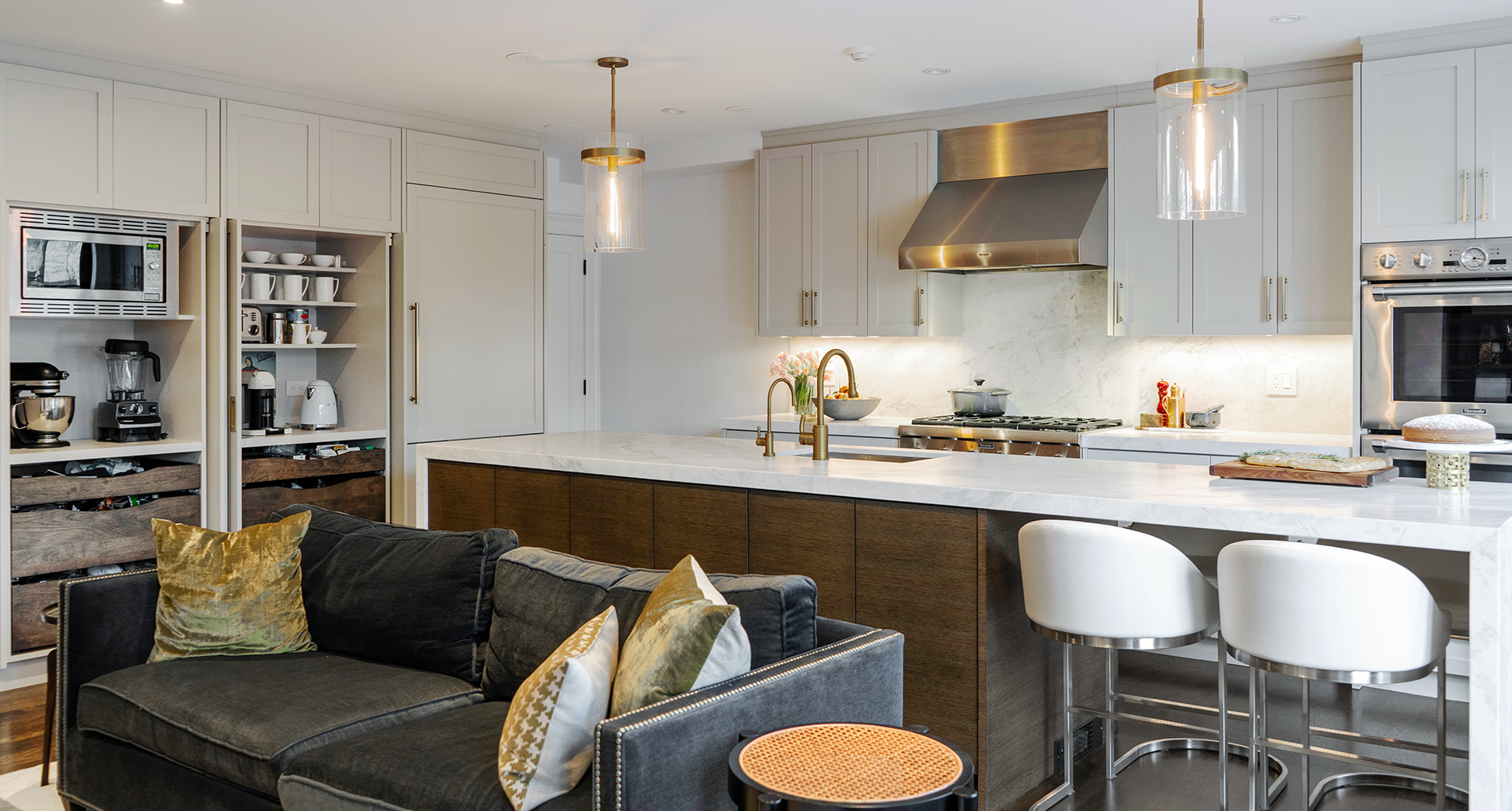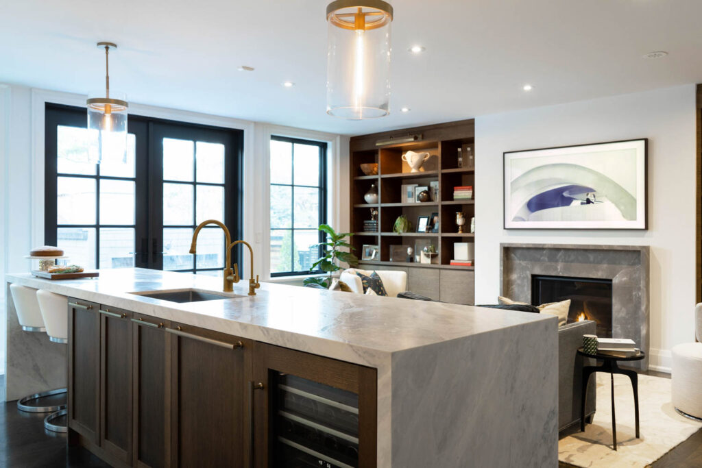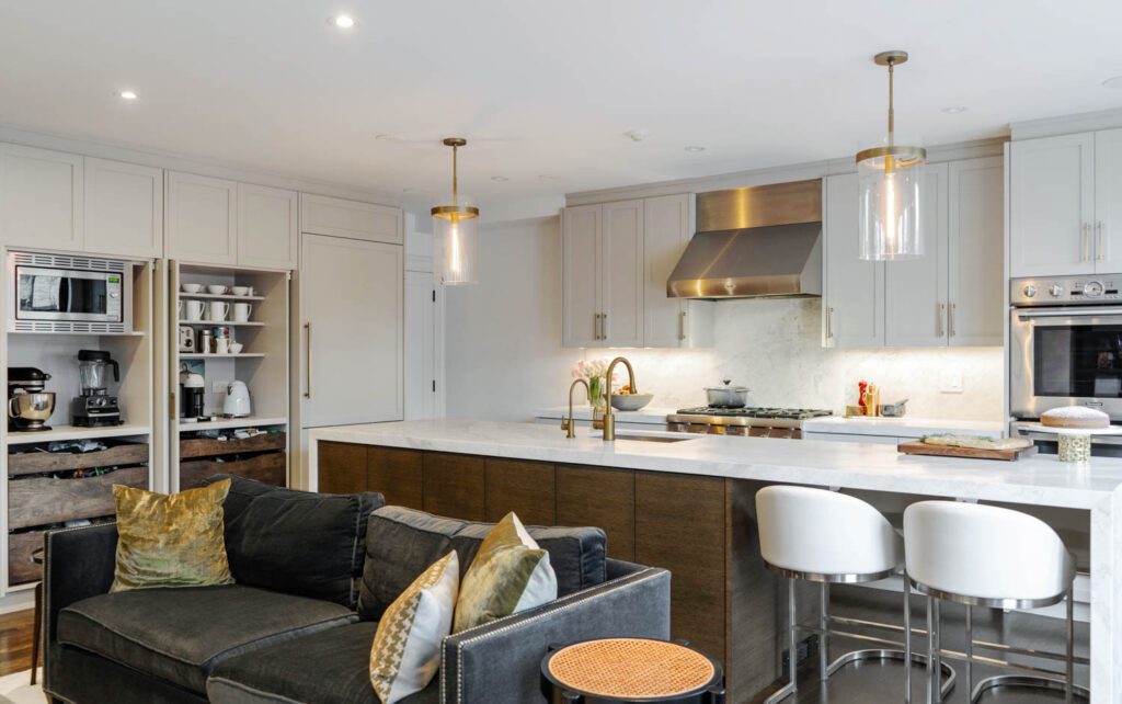 This major renovation and addition features an open concept kitchen and living room, with a seated kitchen island and distressed wood drawers. The stained glass windows of this home were preserved.