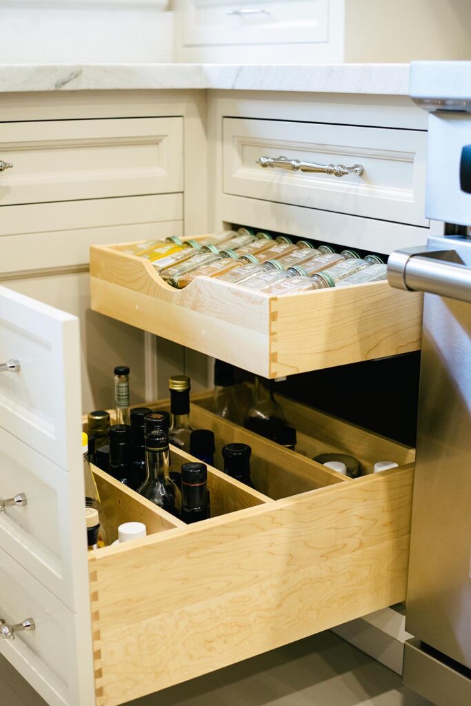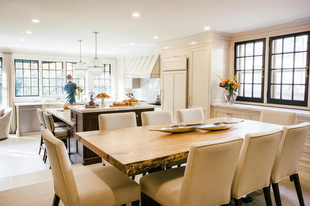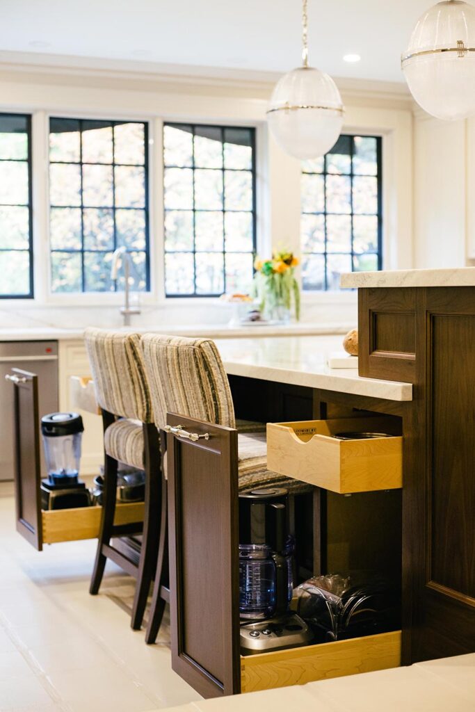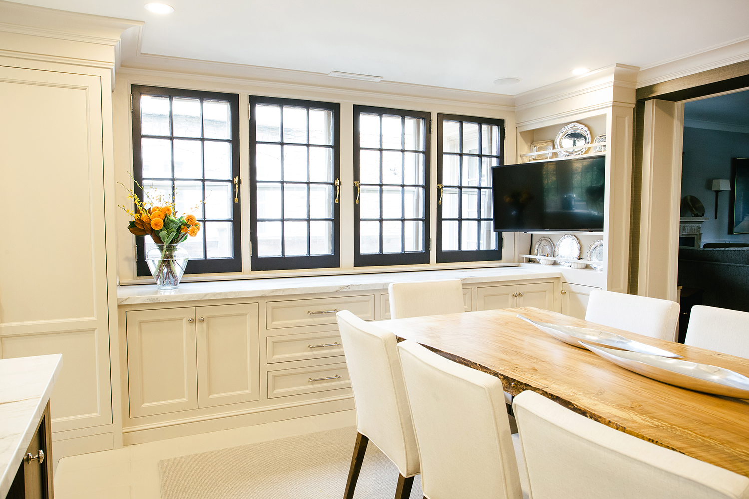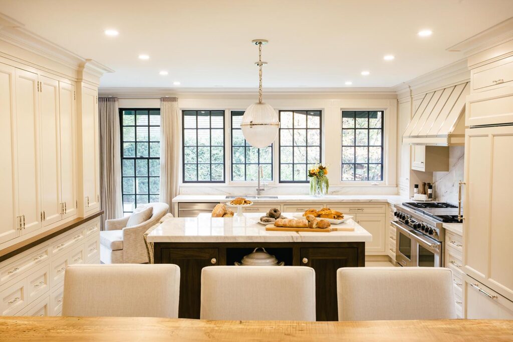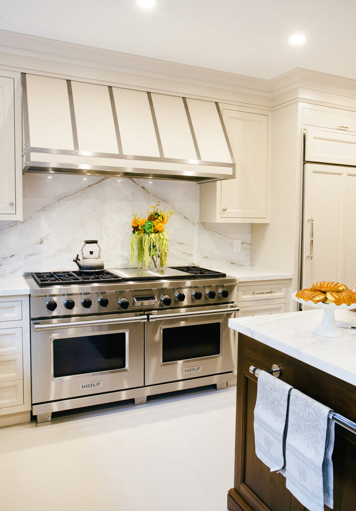 We gutted and extended the main floor of this Rosedale beauty to include a traditional framed kitchen fit for royalty. The kitchen was outfitted with framed cabinetry, in a hand brushed finish, with stainless steel banding on a decorative range hood. The kitchen also featured smart details like custom oil & spice pullouts, custom cutlery drawers, and a hidden appliance garage. The space was finished with in-floor heating and a 60” range with dual exhaust hood.