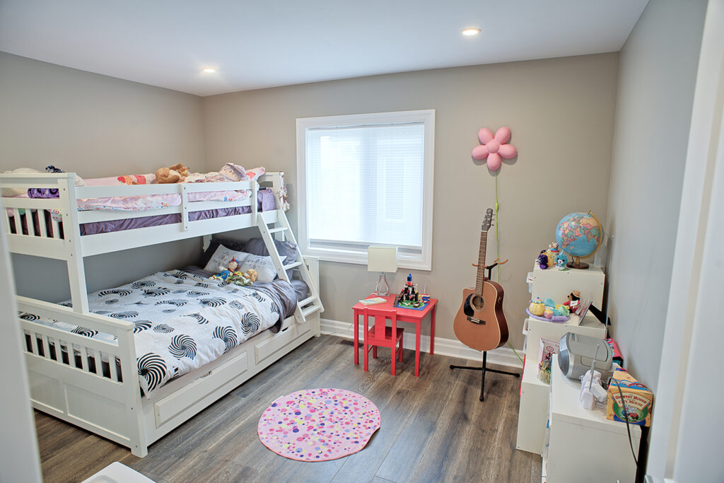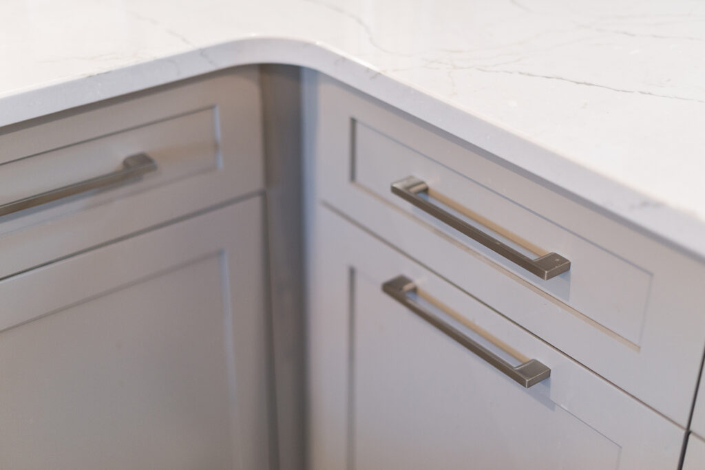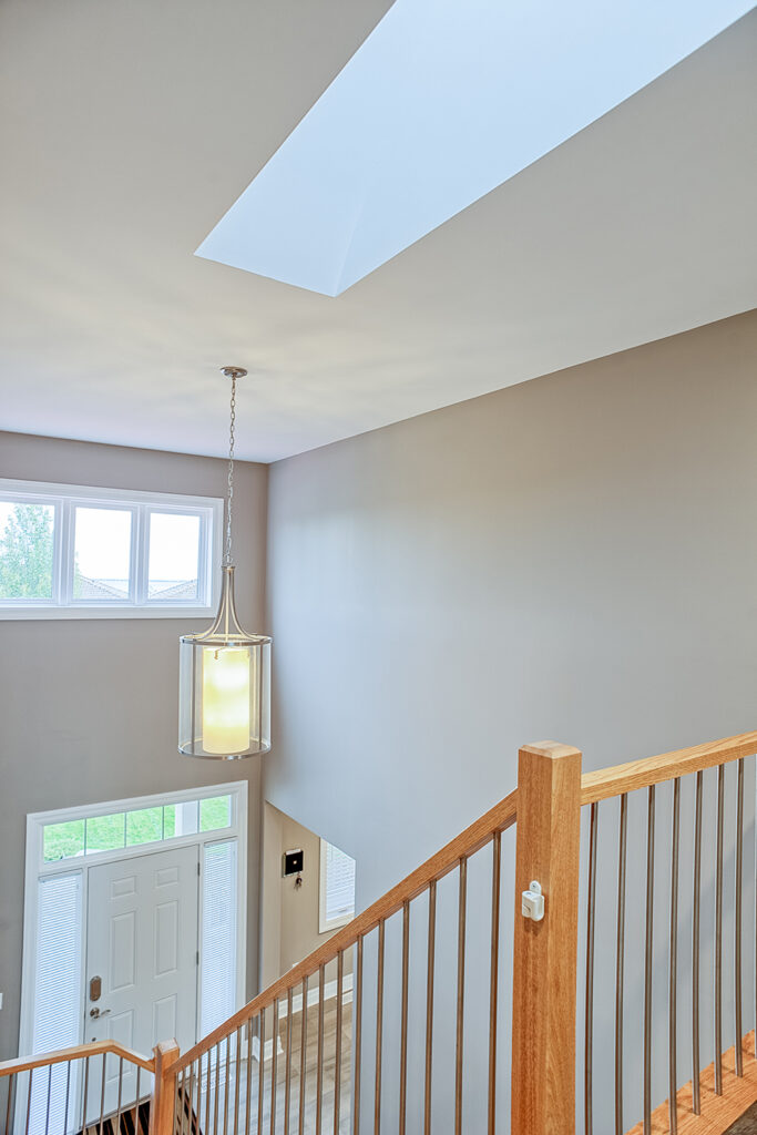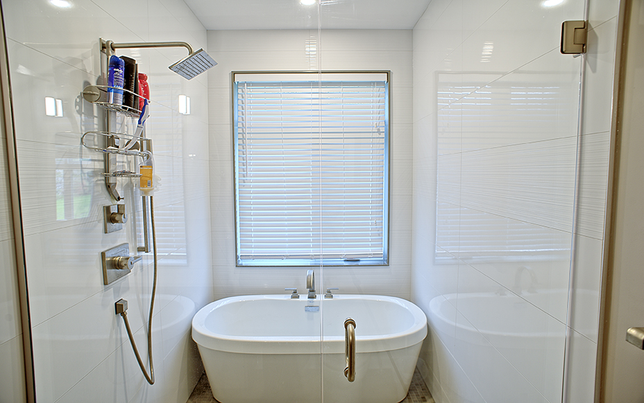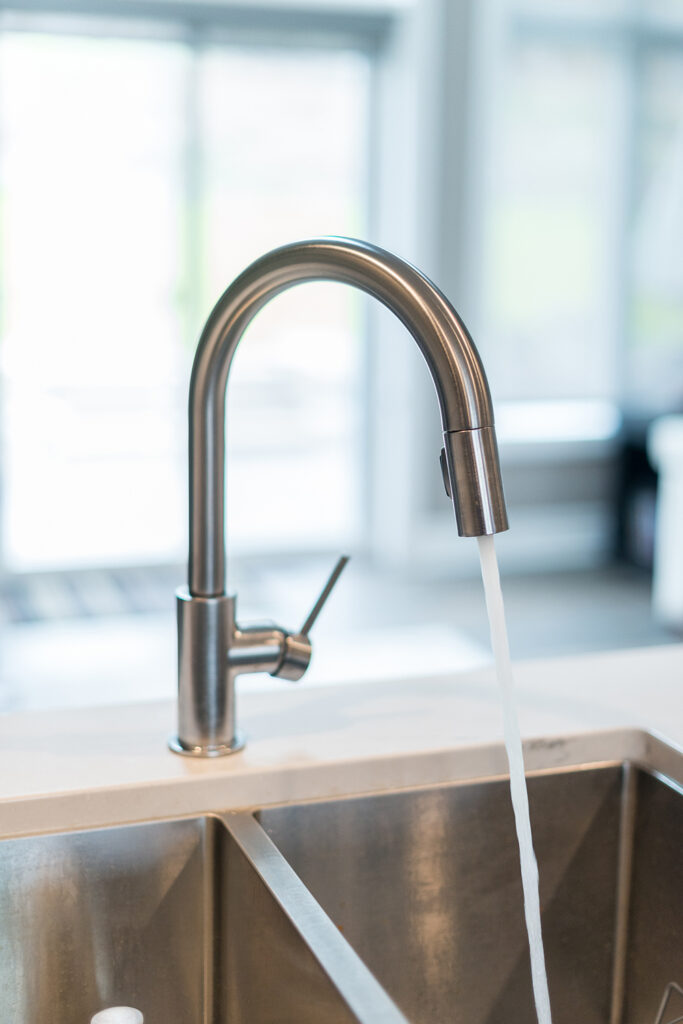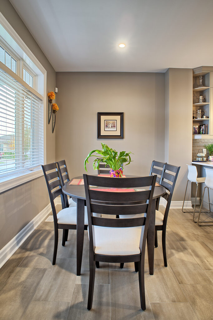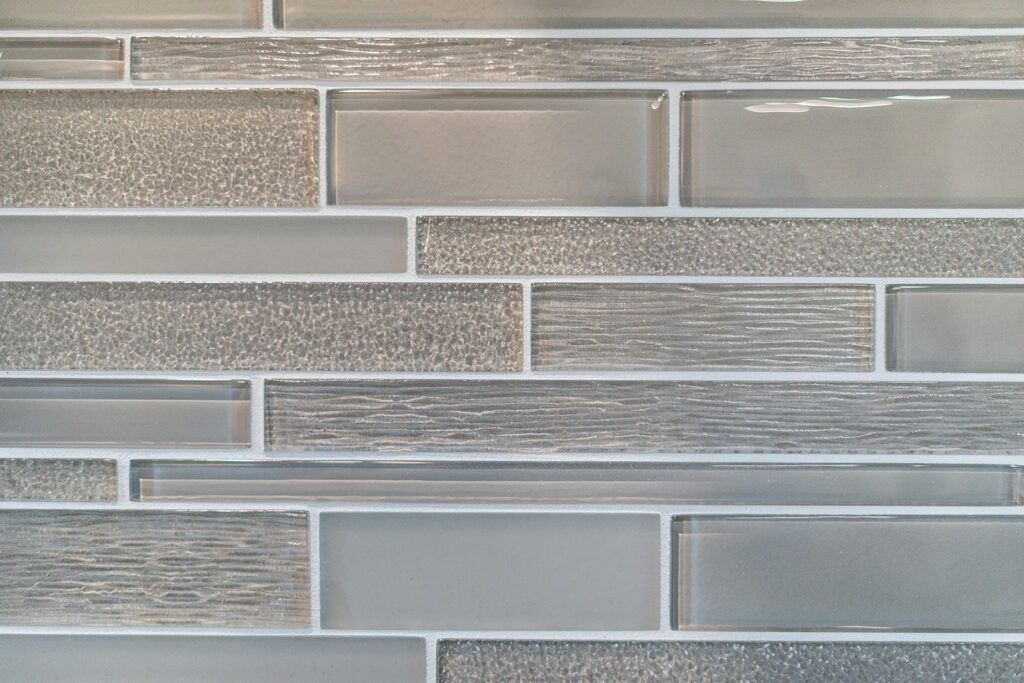 This custom home features an open-concept great room; joining the kitchen, dining, and living room together for a bright and open feel. The light greys and whites, coupled with glass tile backsplash in the kitchen, and other high-end finishes, brings together this modern design.