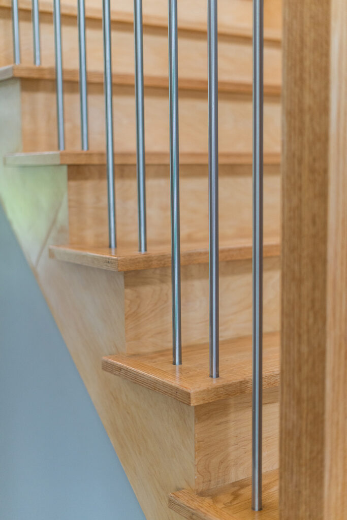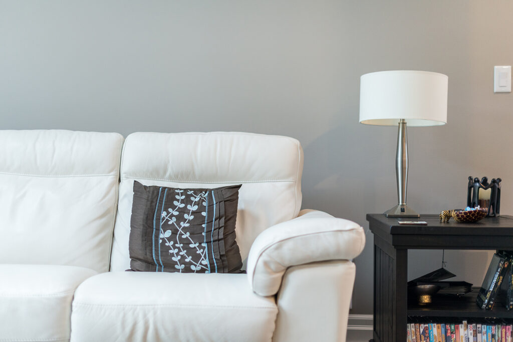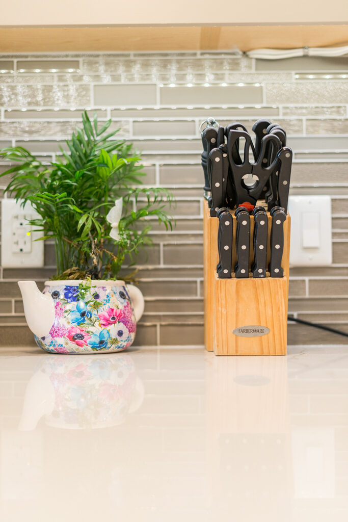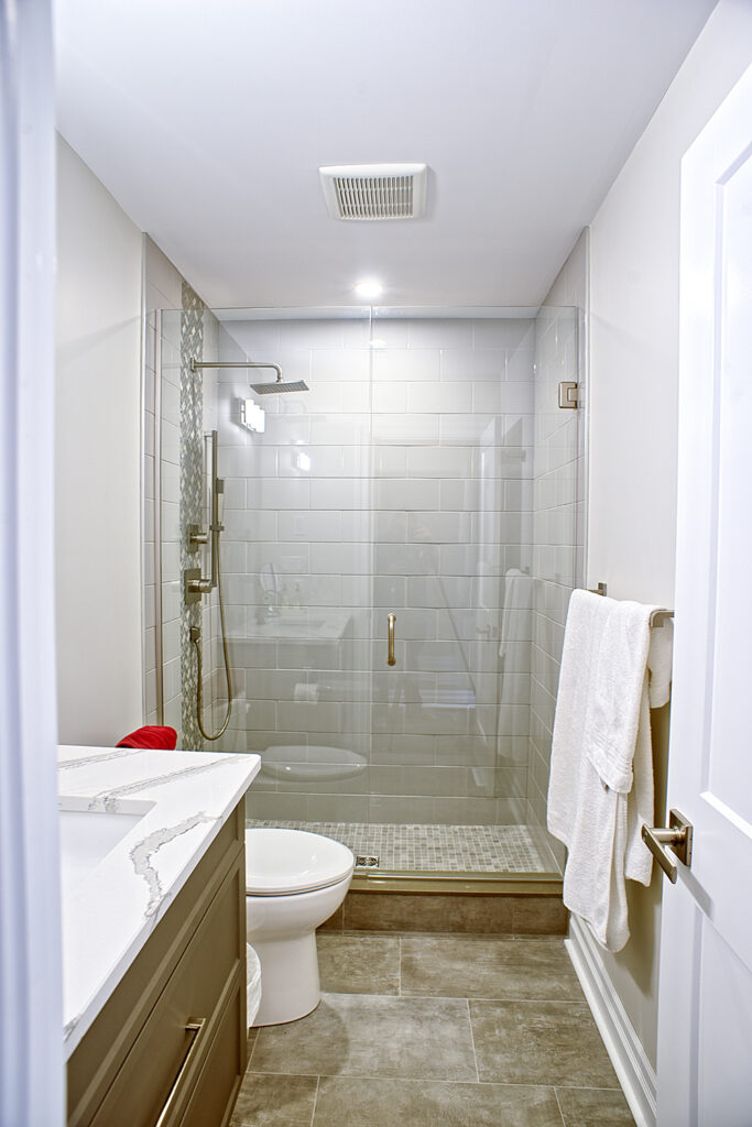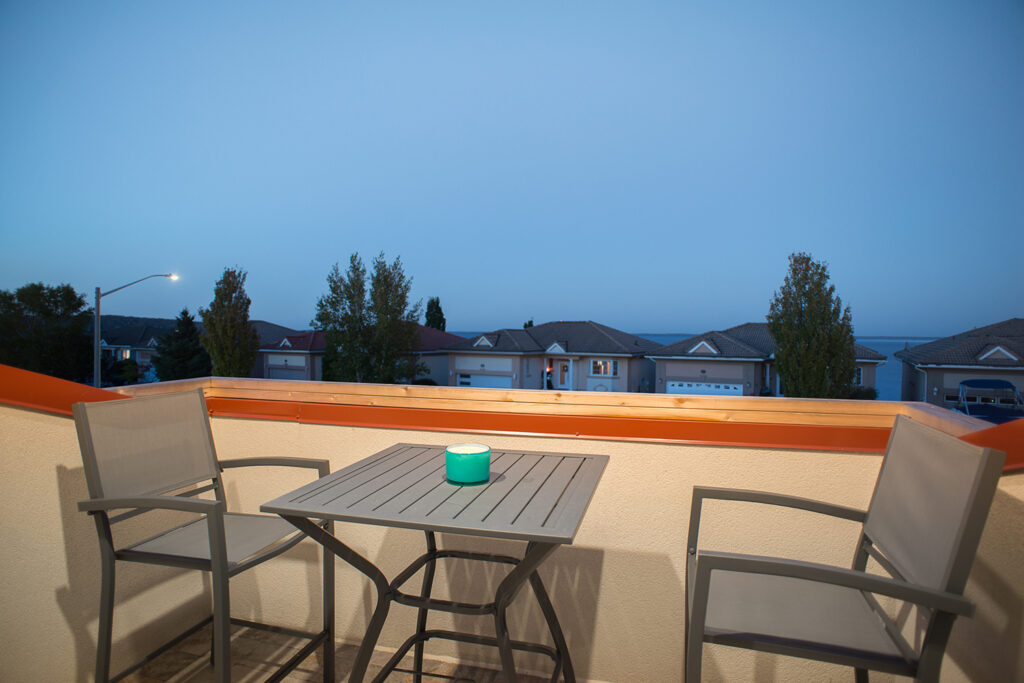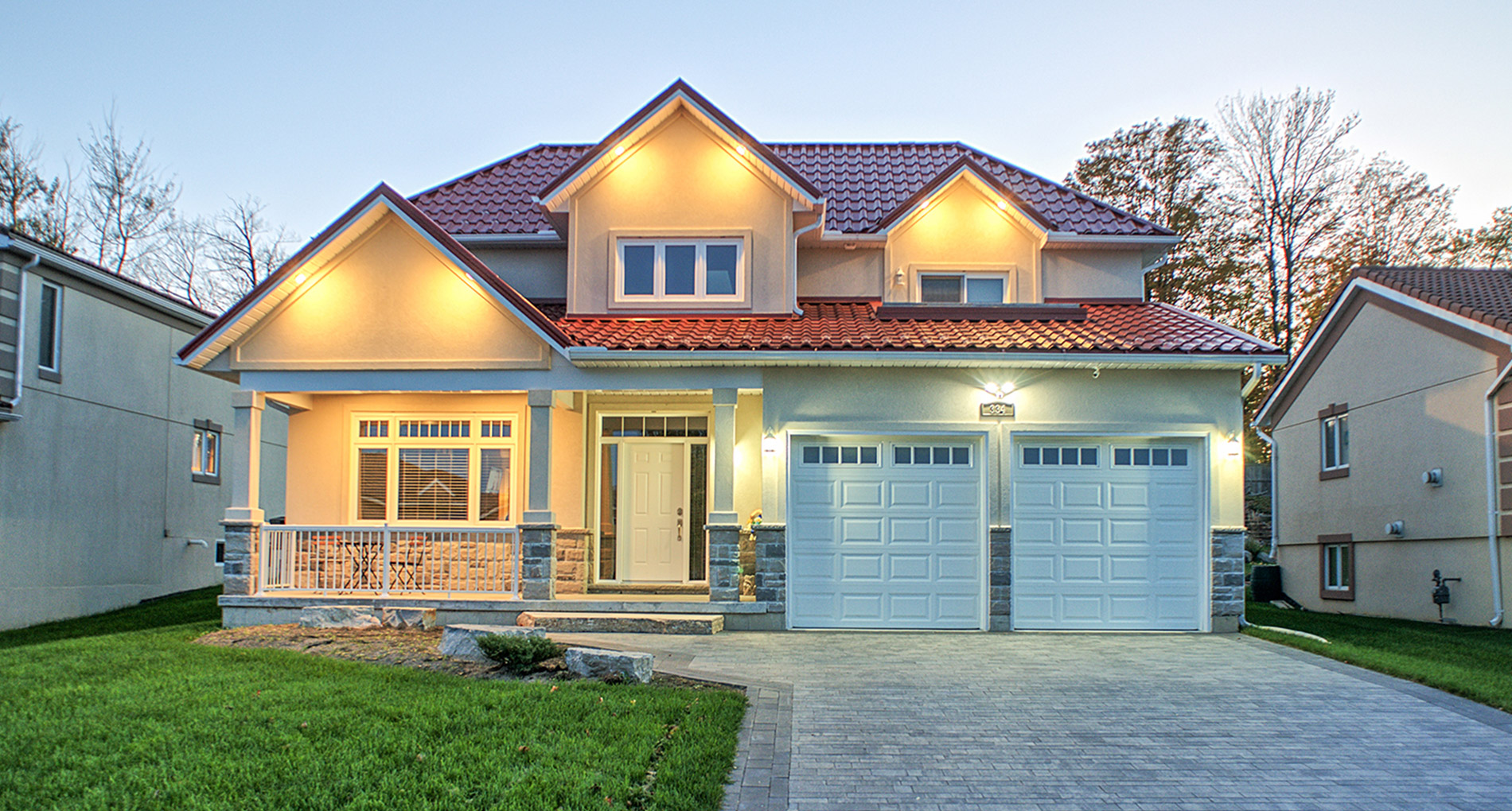 This custom home features an open-concept great room; joining the kitchen, dining, and living room together for a bright and open feel. The light greys and whites, coupled with glass tile backsplash in the kitchen, and other high-end finishes, brings together this modern design.