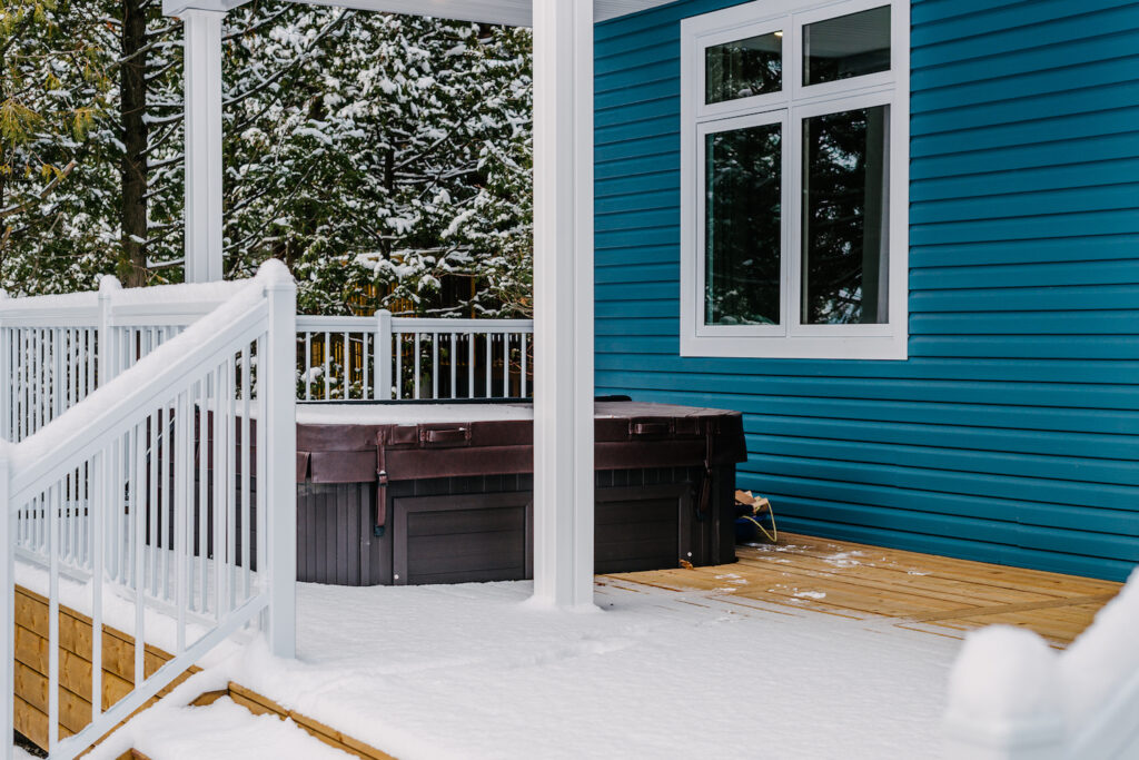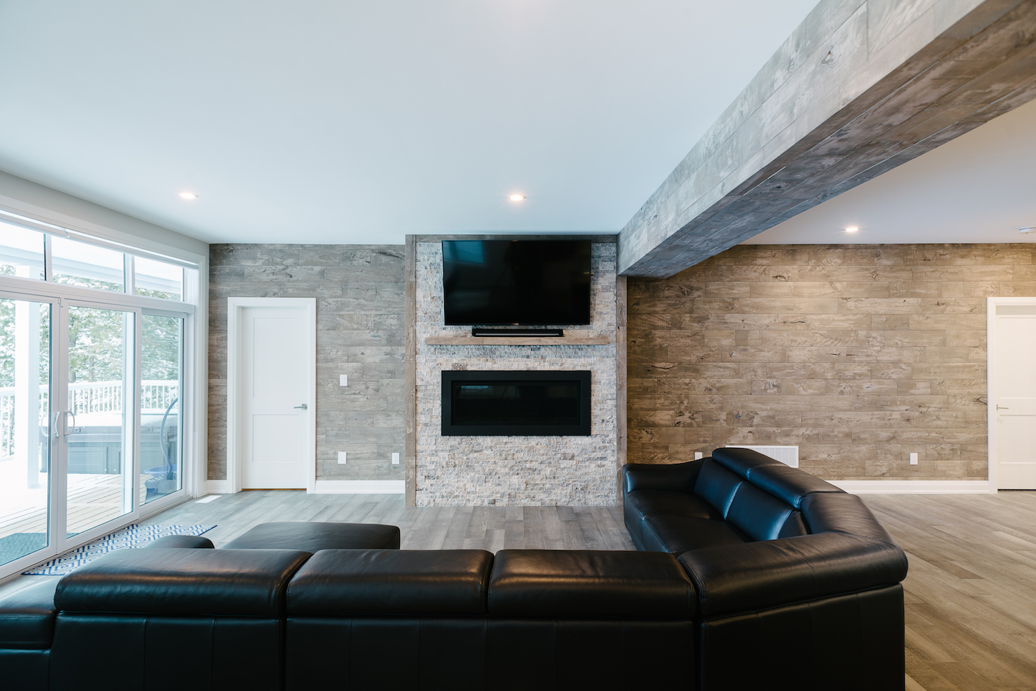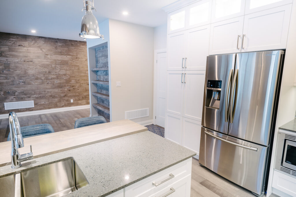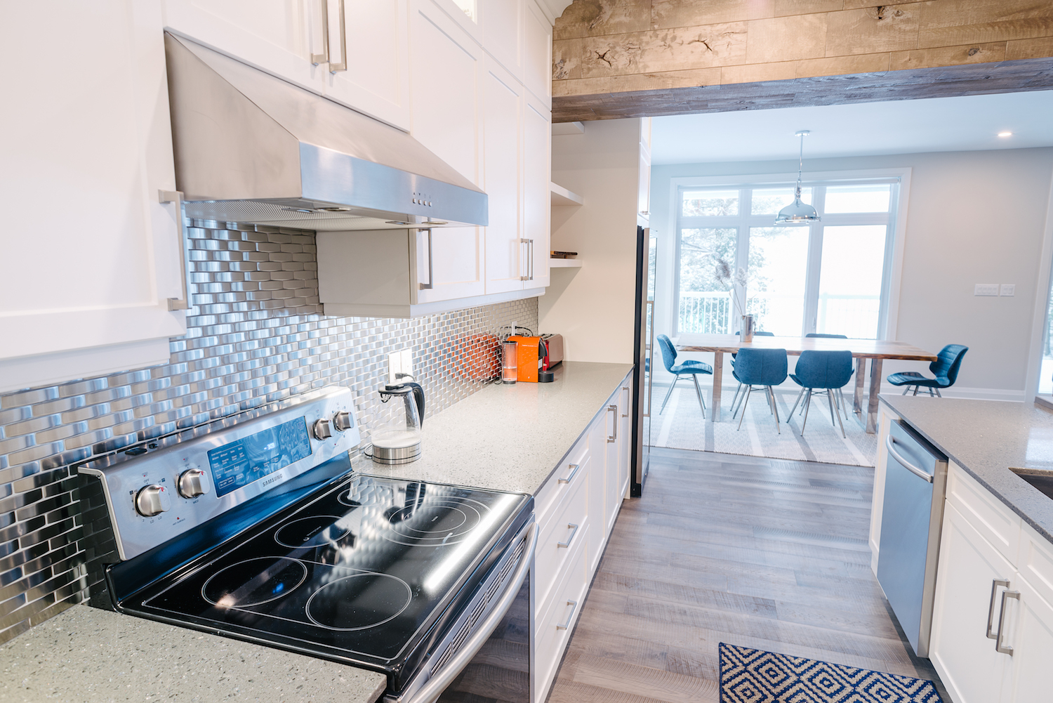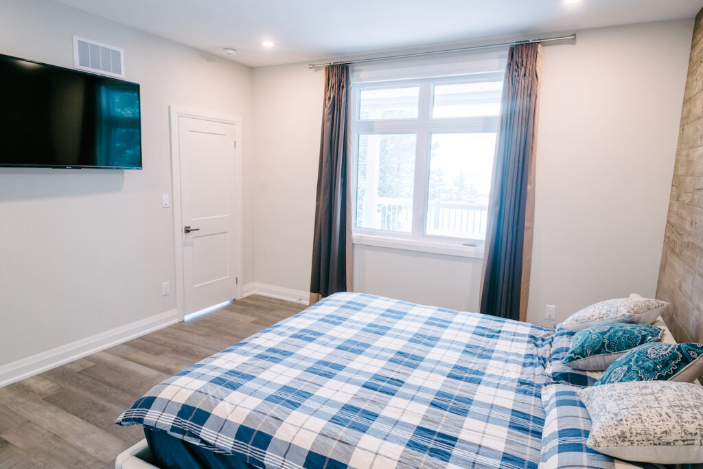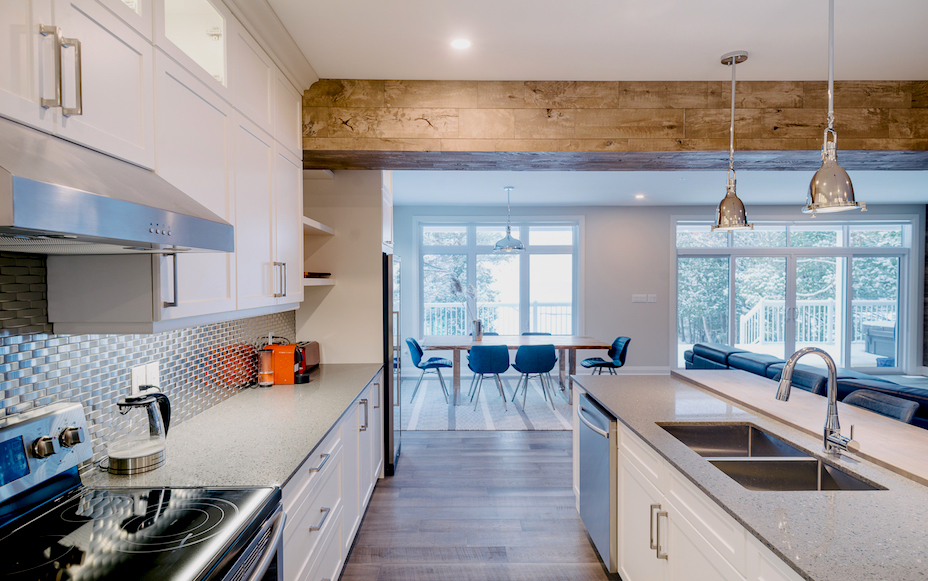 This Georgian Bay waterfront beach home is 4,500 sqft and features 5 bedrooms, 3.5 baths, office, gym, media room, main floor and upper floor great rooms with vaulted ceilings and a custom kitchen.