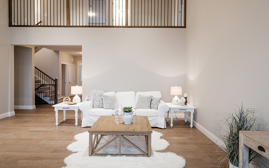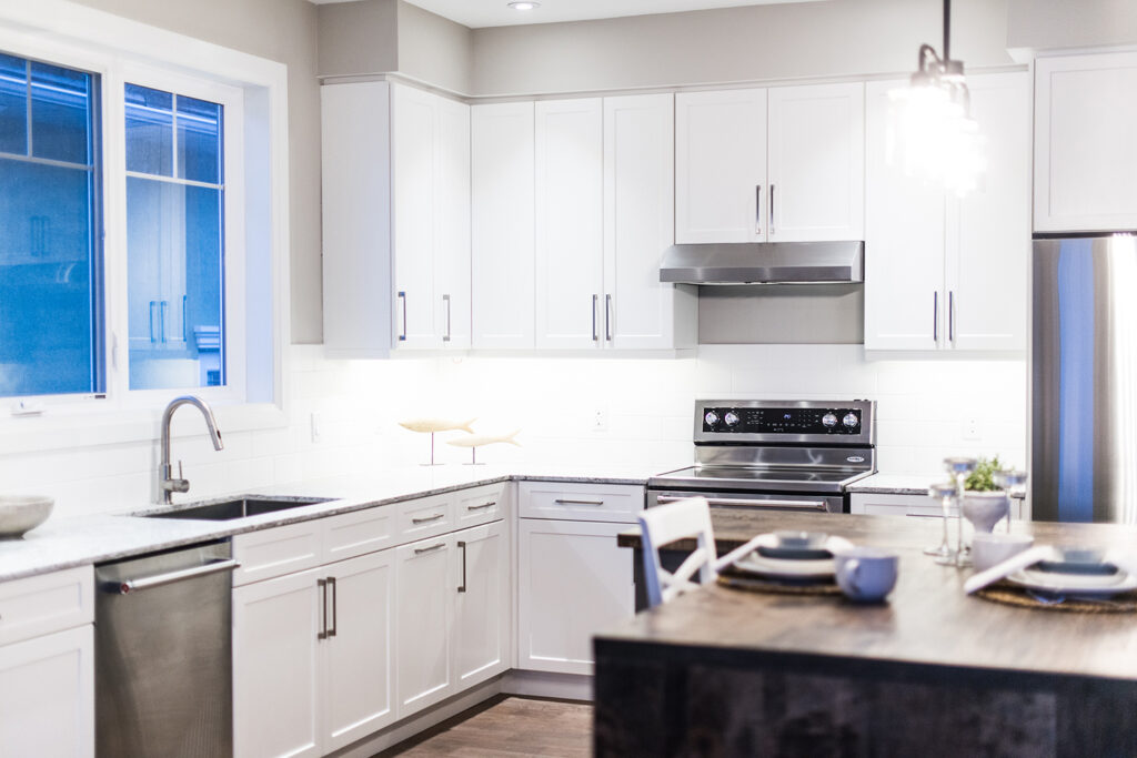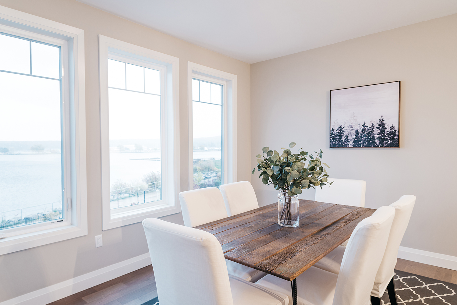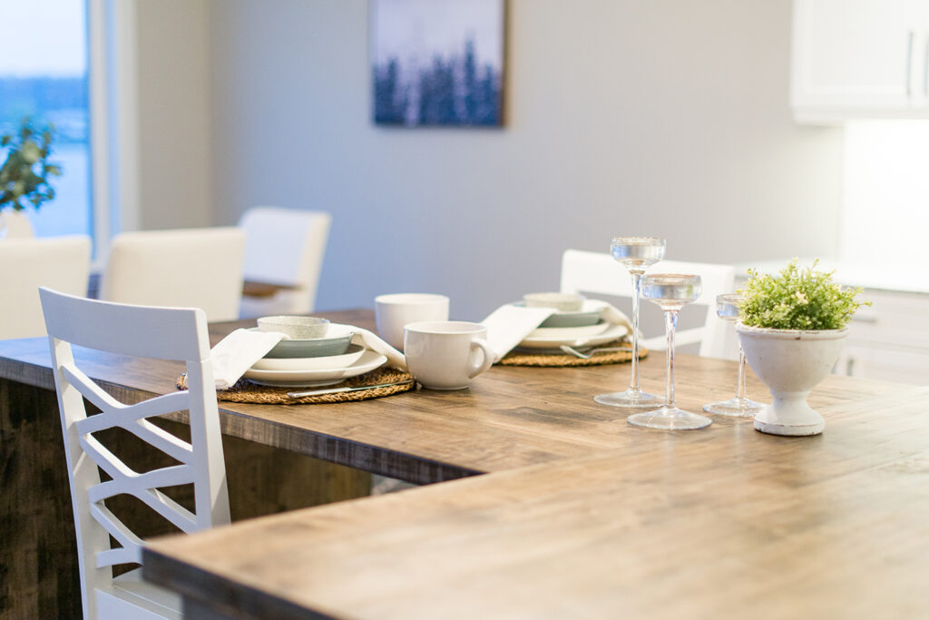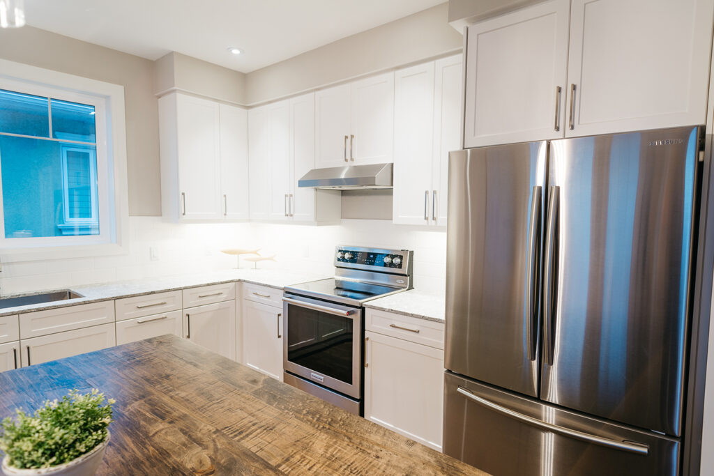 This 4 bedroom, 2.5 bath custom home features an open-concept layout with vaulted ceilings and hardwood floors throughout. The kitchen and living room features a blend of rustic and modern design elements – distressed wood counters and finishes, white cabinets and chairs, and stainless-steel appliances create a cozy and sophisticated atmosphere. The wood stove in the living room adds to the rustic charm of the space.