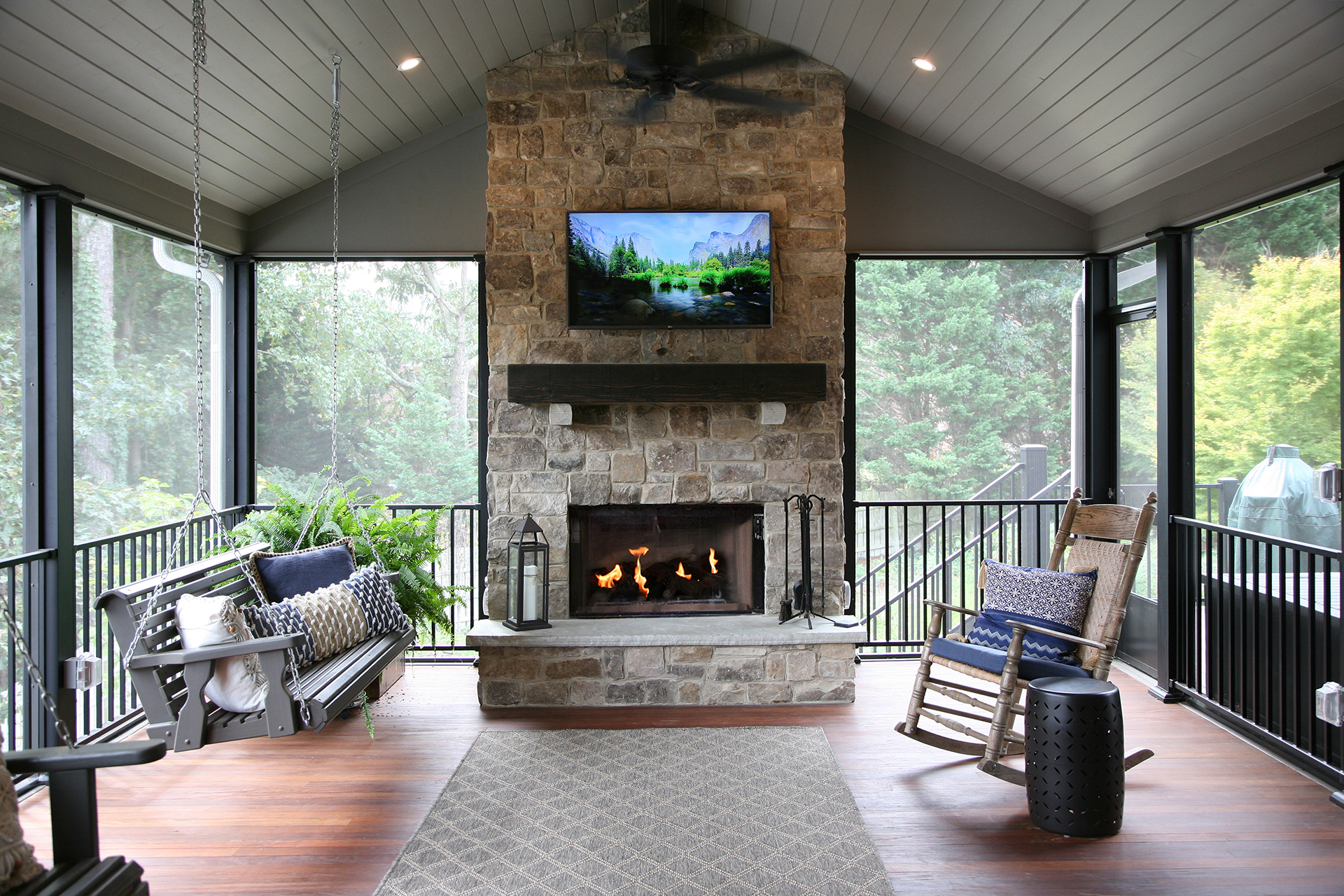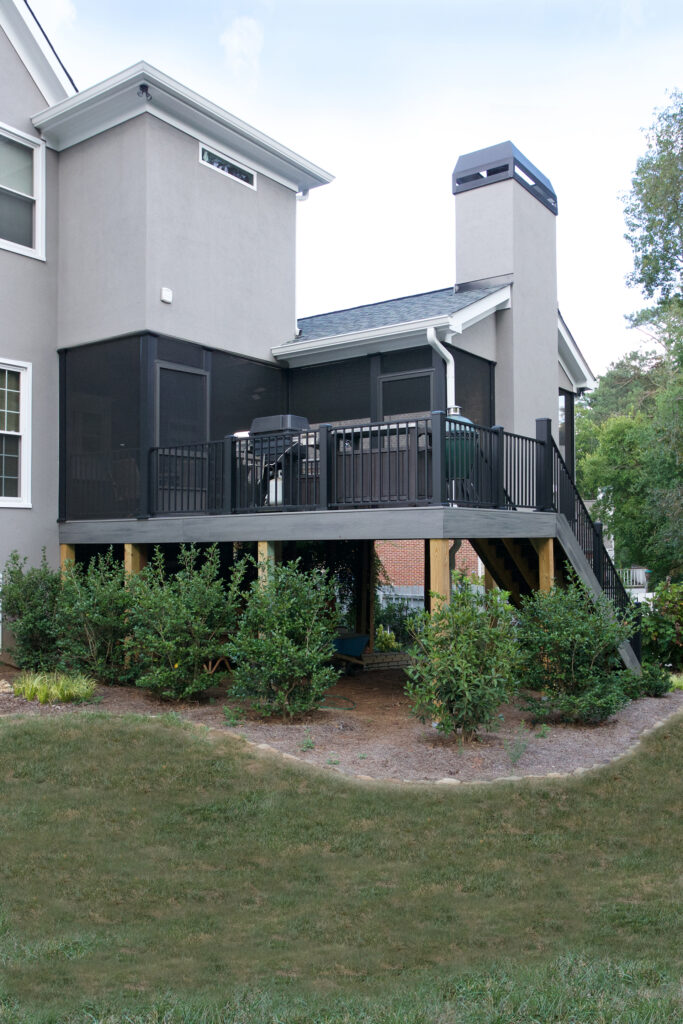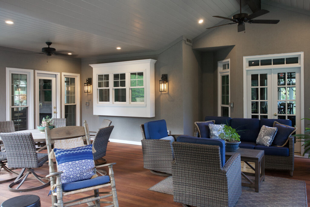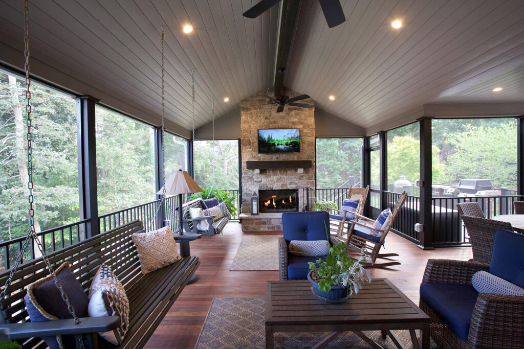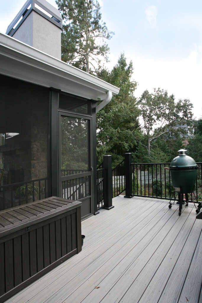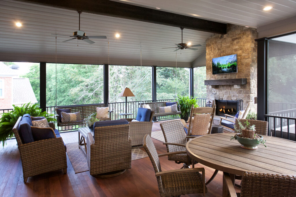 Client Comments: “Our porch remodel accomplished all of our goals by expanding the existing screened porch in two directions – further out from the house in order to add a beautiful stone fireplace and toward the breakfast area (enclosing part of the existing deck) in order to connect the porch directly to the house. The increase in the size of the porch made it possible to have two porch swings, two adjacent sitting areas, and a 60” round table that will accommodate six swivel chairs. Expanding the porch also involved “relocating” the deck where we keep our grills; and, as a bonus, the larger porch made it possible to have two doors to access the deck – one close to the fireplace (convenient for bringing in firewood) and one close to the kitchen (convenient for grilling out). Additionally, we changed the flooring on the porch from old indoor/outdoor carpet to beautiful Ipe hardwoods, and on the deck, we changed from splintery wood to Hardy plank type flooring – both were huge improvements, functionally and visually.”