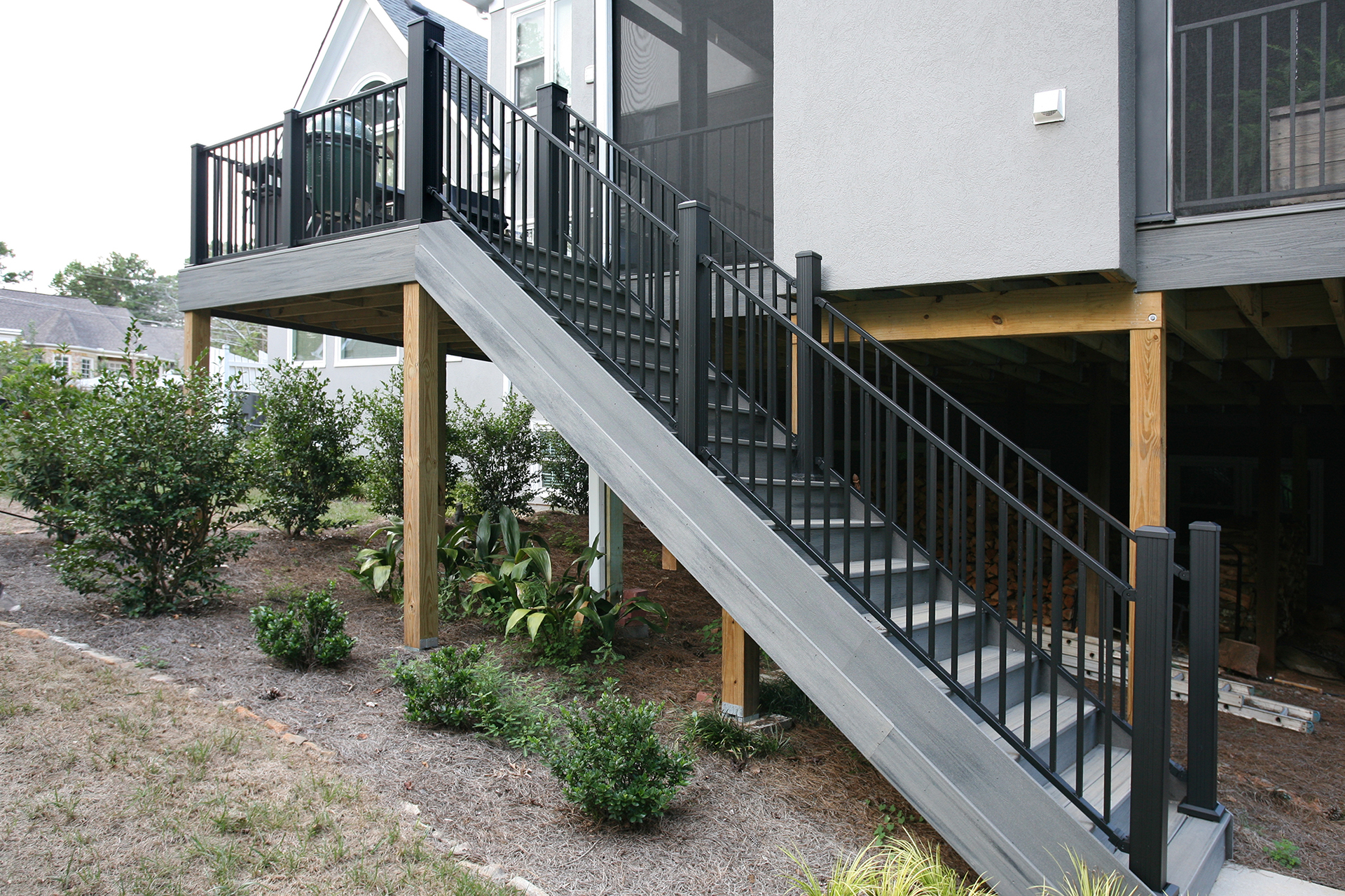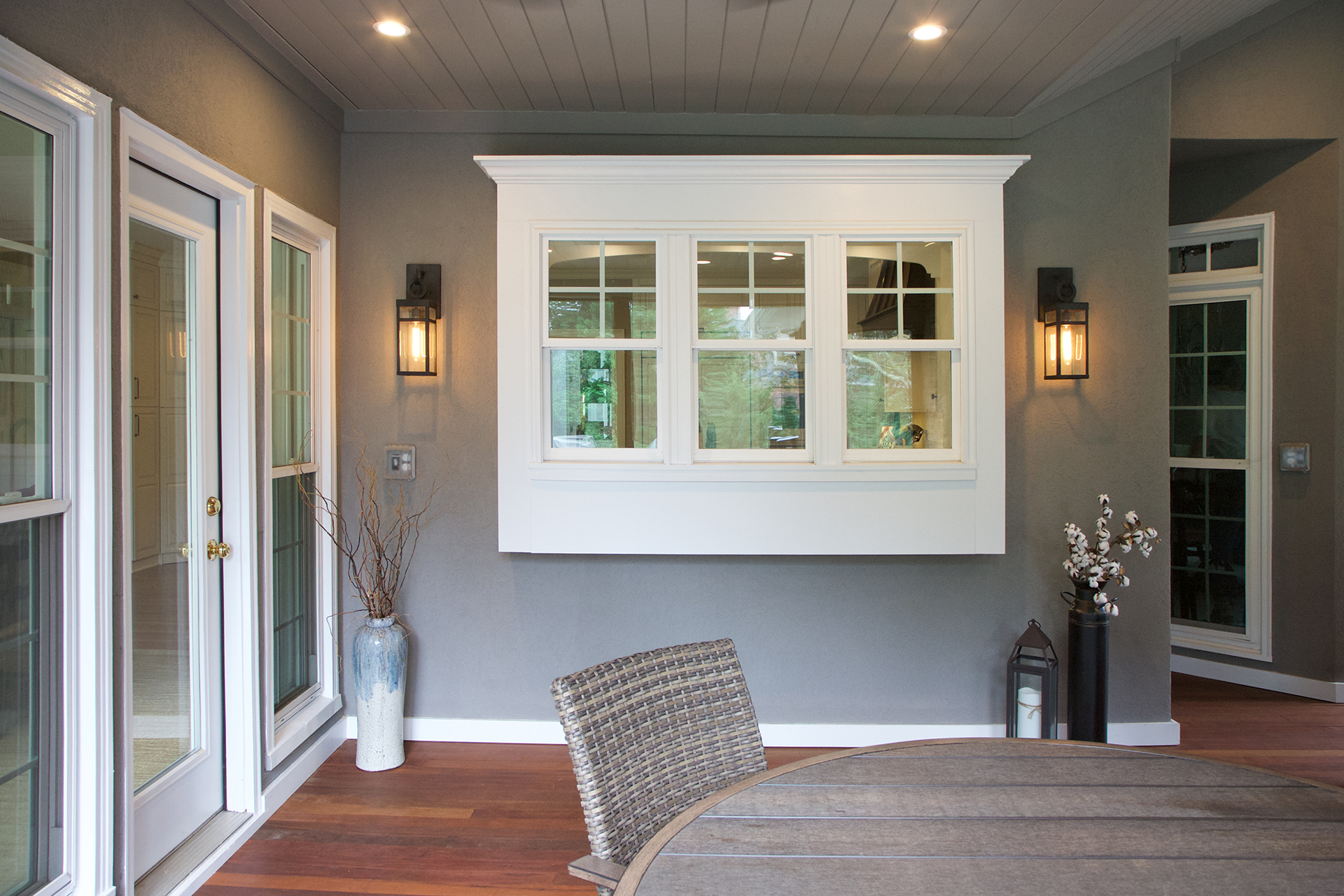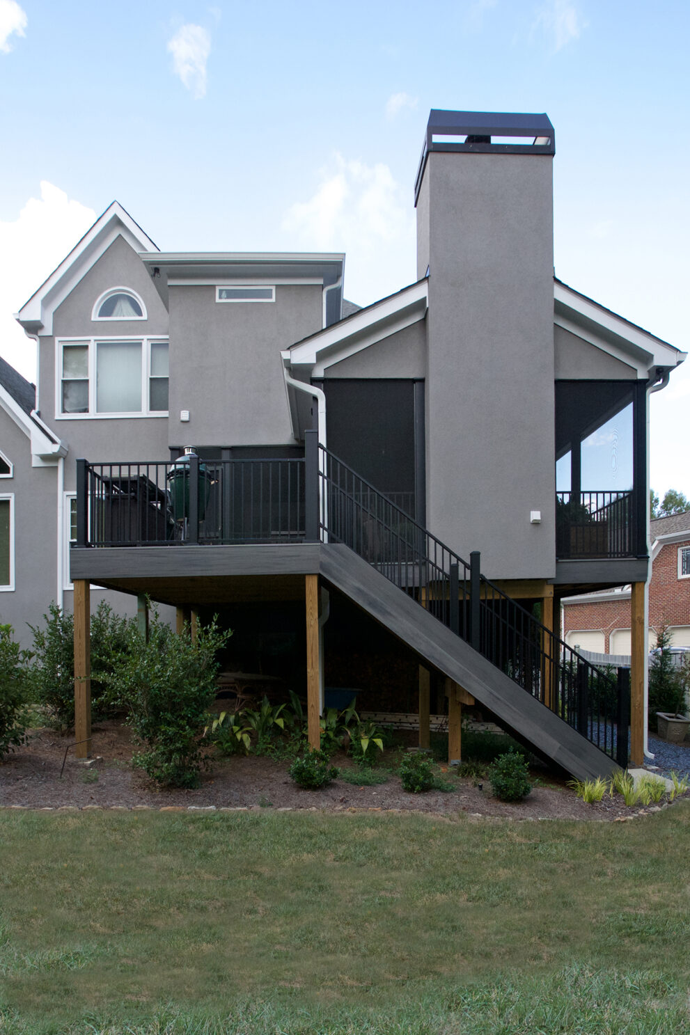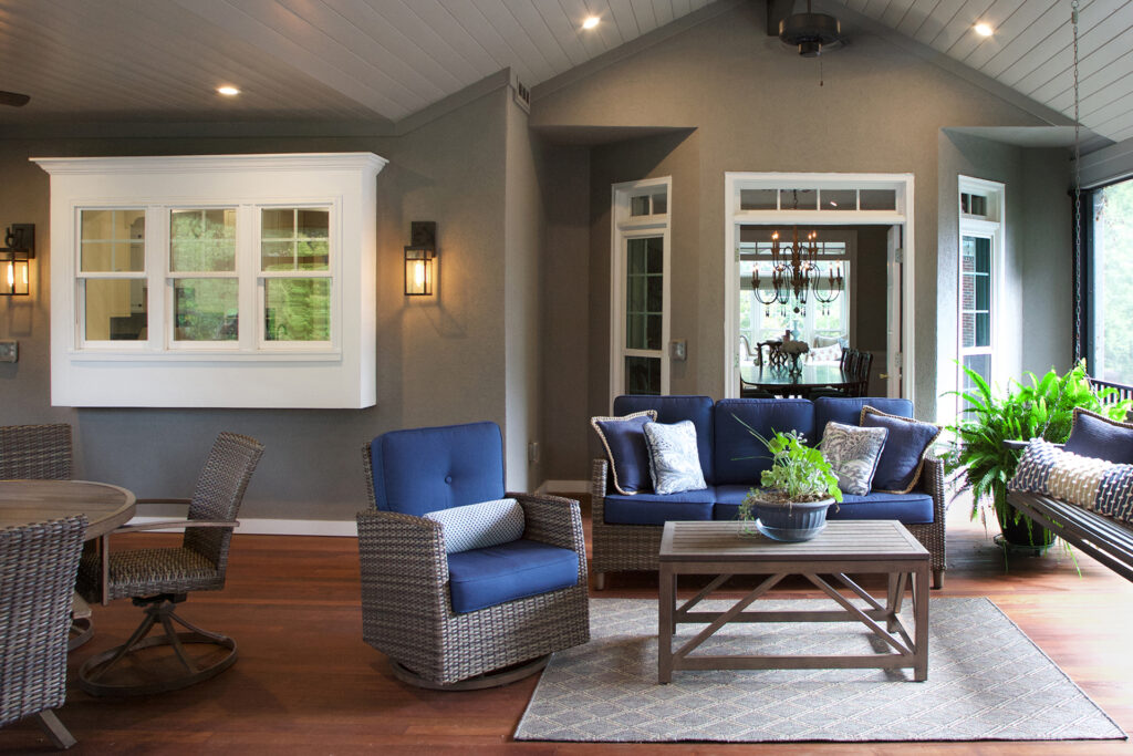 Client Comments: “Our porch remodel accomplished all of our goals by expanding the existing screened porch in two directions – further out from the house in order to add a beautiful stone fireplace and toward the breakfast area (enclosing part of the existing deck) in order to connect the porch directly to the house. The increase in the size of the porch made it possible to have two porch swings, two adjacent sitting areas, and a 60” round table that will accommodate six swivel chairs. Expanding the porch also involved “relocating” the deck where we keep our grills; and, as a bonus, the larger porch made it possible to have two doors to access the deck – one close to the fireplace (convenient for bringing in firewood) and one close to the kitchen (convenient for grilling out). Additionally, we changed the flooring on the porch from old indoor/outdoor carpet to beautiful Ipe hardwoods, and on the deck, we changed from splintery wood to Hardy plank type flooring – both were huge improvements, functionally and visually.”