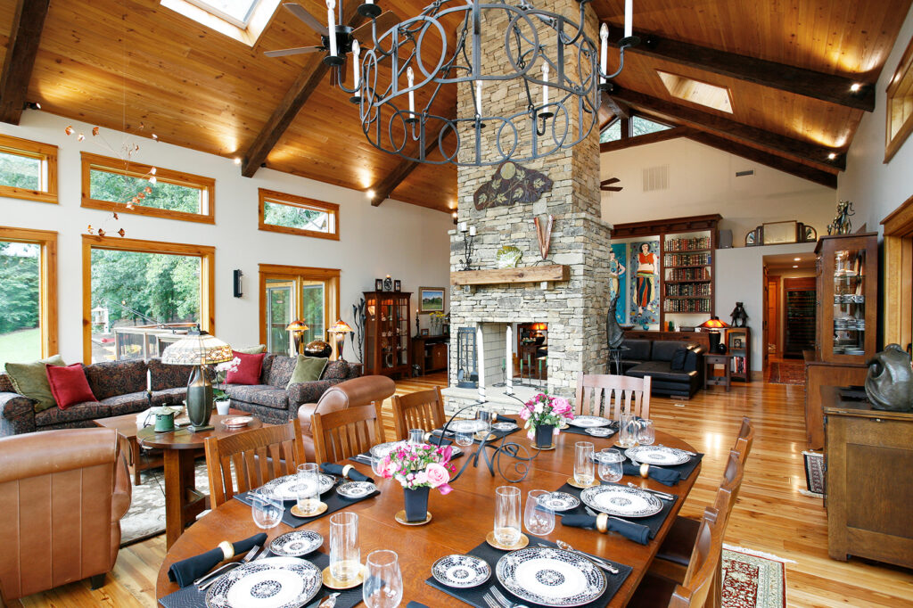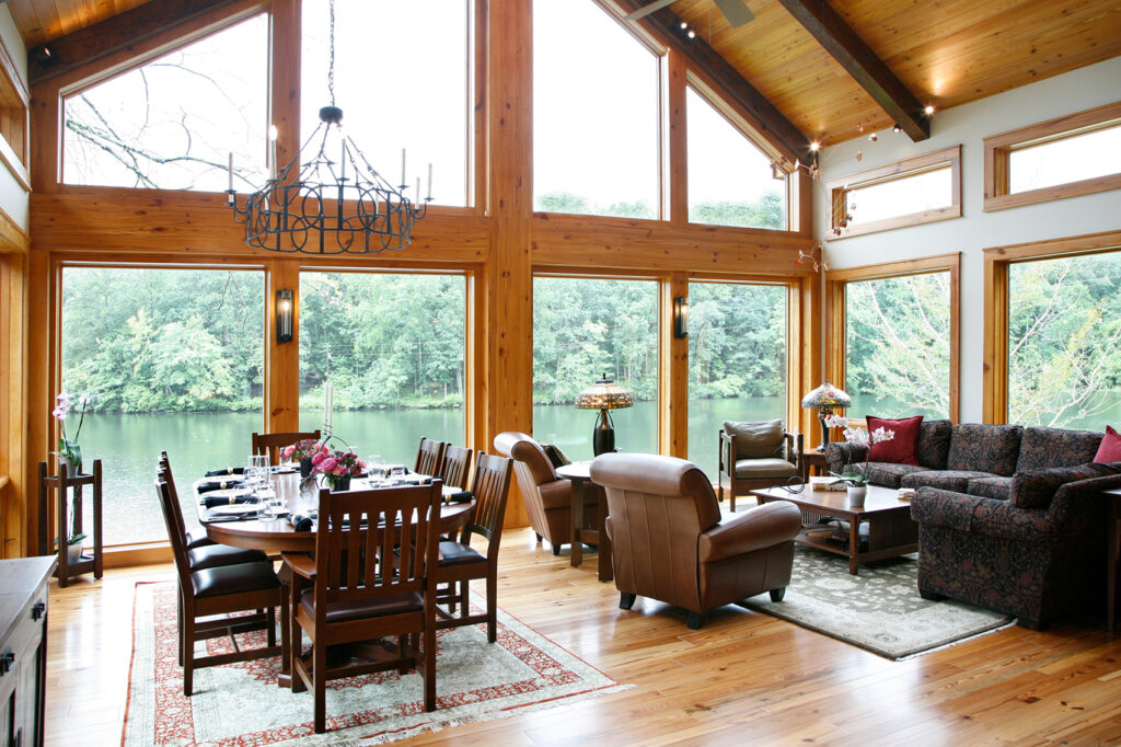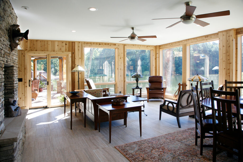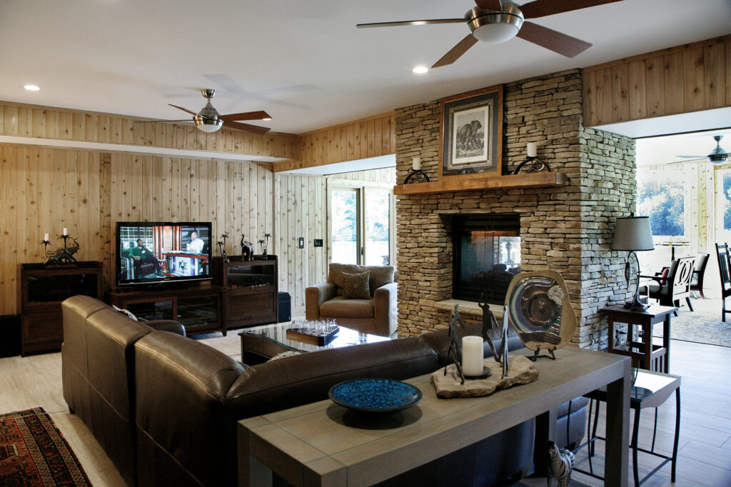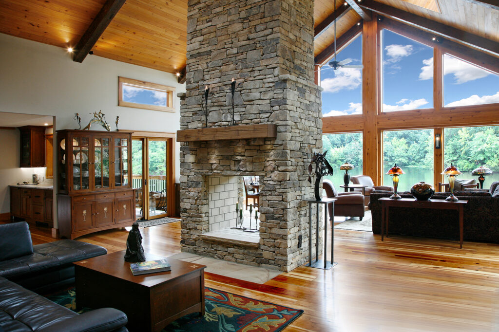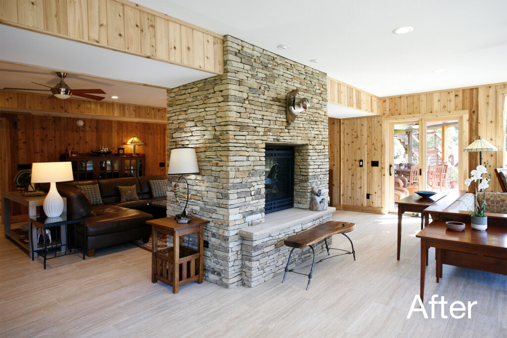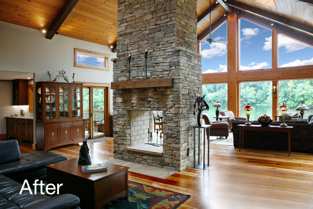 The clients’ newly purchased 2-story lakefront home was dated. They wanted an addition to modernize and expand the home enhancing the lake views, without making the house look “pretentious”. An extensive update with many special features included kitchen and bath renovations and the construction of two massive, stacked-stone fireplaces. The centerpiece is an expanded, 38’ x 25’ Great Room with 270-degree lake views, a 19’ cathedral ceiling, and a three-story-high exterior glass wall. The open floor plan features wide walkways of warm, reclaimed pine connecting a dining room, family room, and fireside library with amazing lake views drawing the eye from every corner. The update also included taking full advantage of their beautiful surroundings by adding several outdoor living spaces; decking, covered patios, stone steps and pathways, a boat house, and an IPE wood dock.