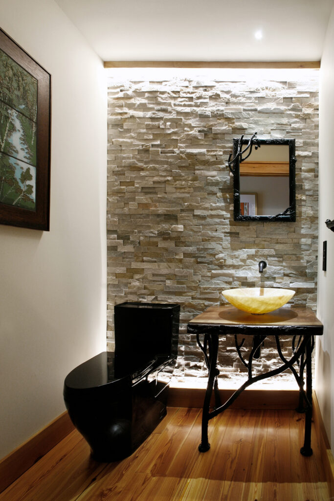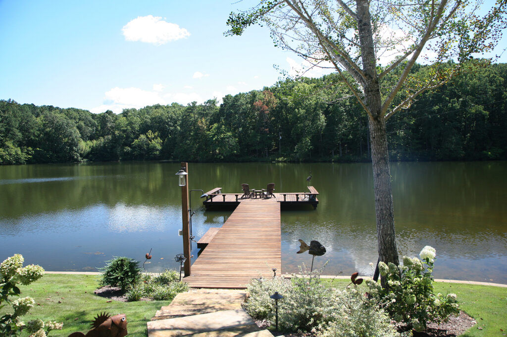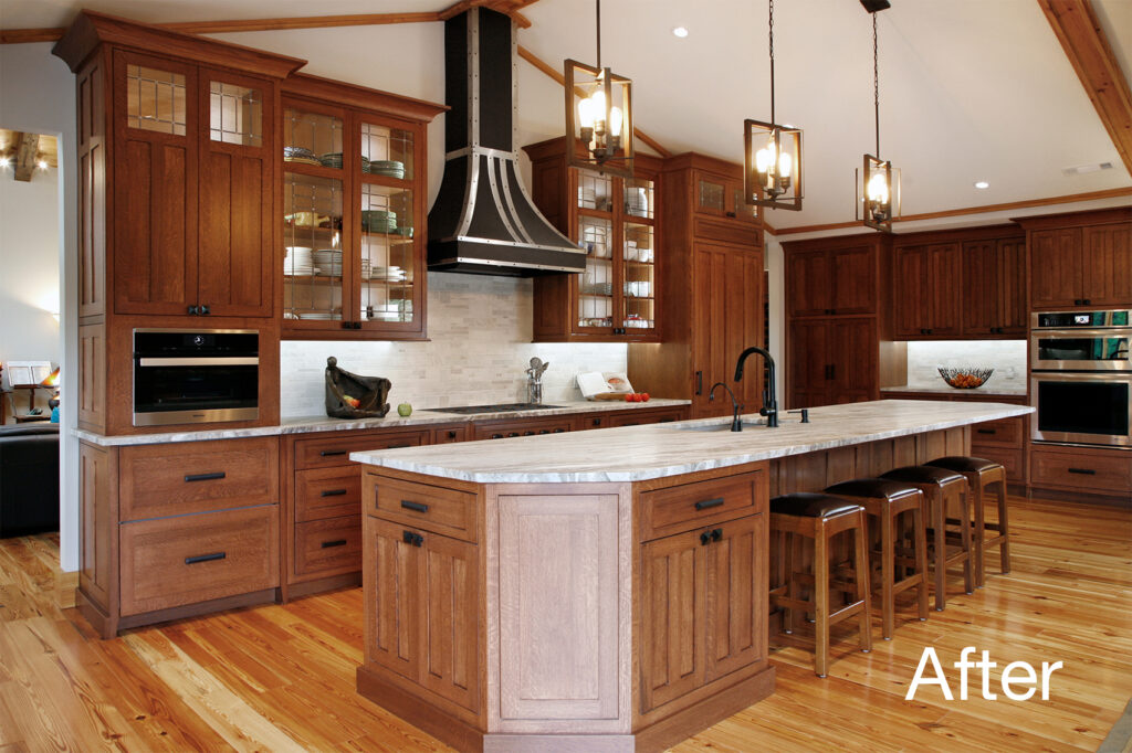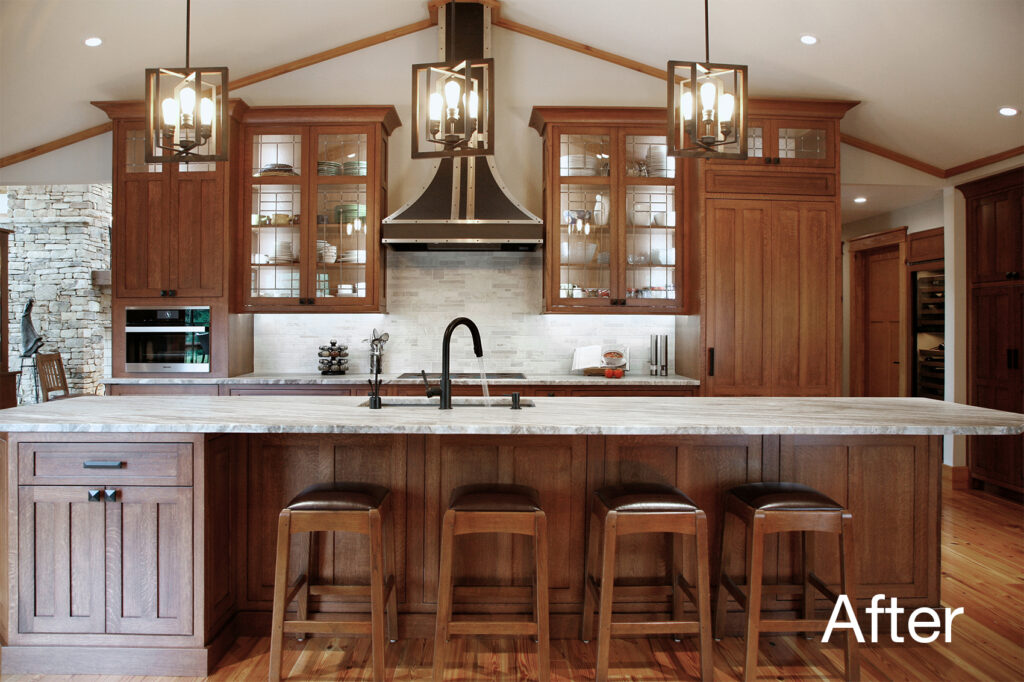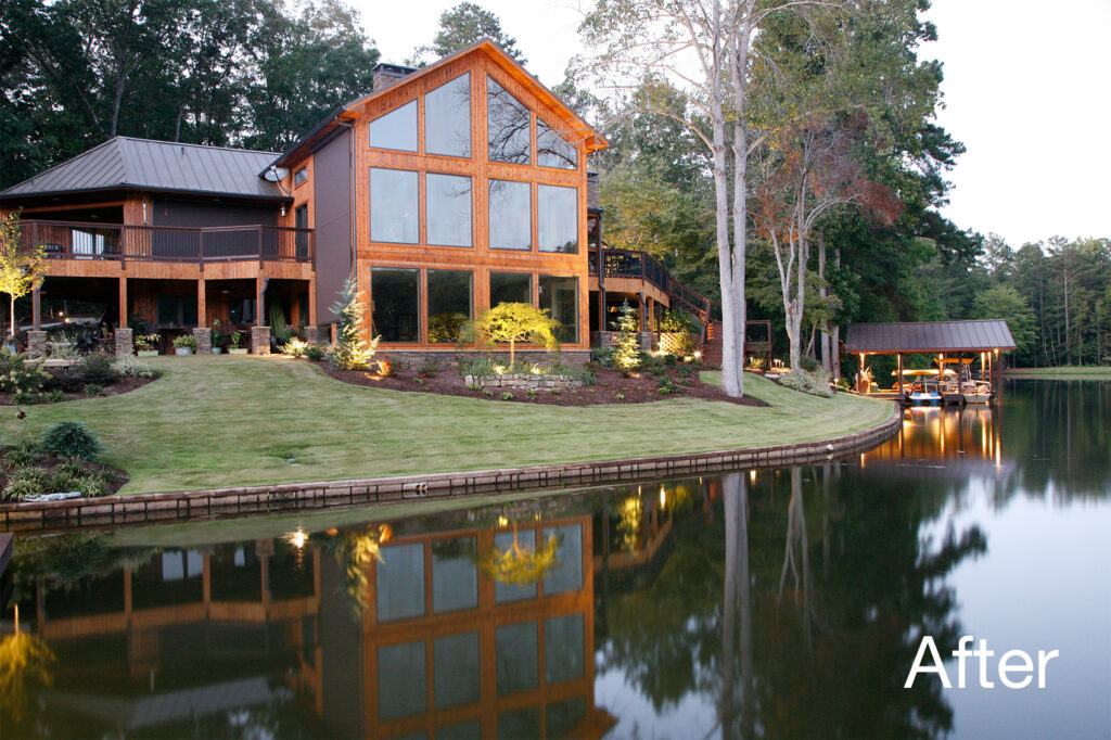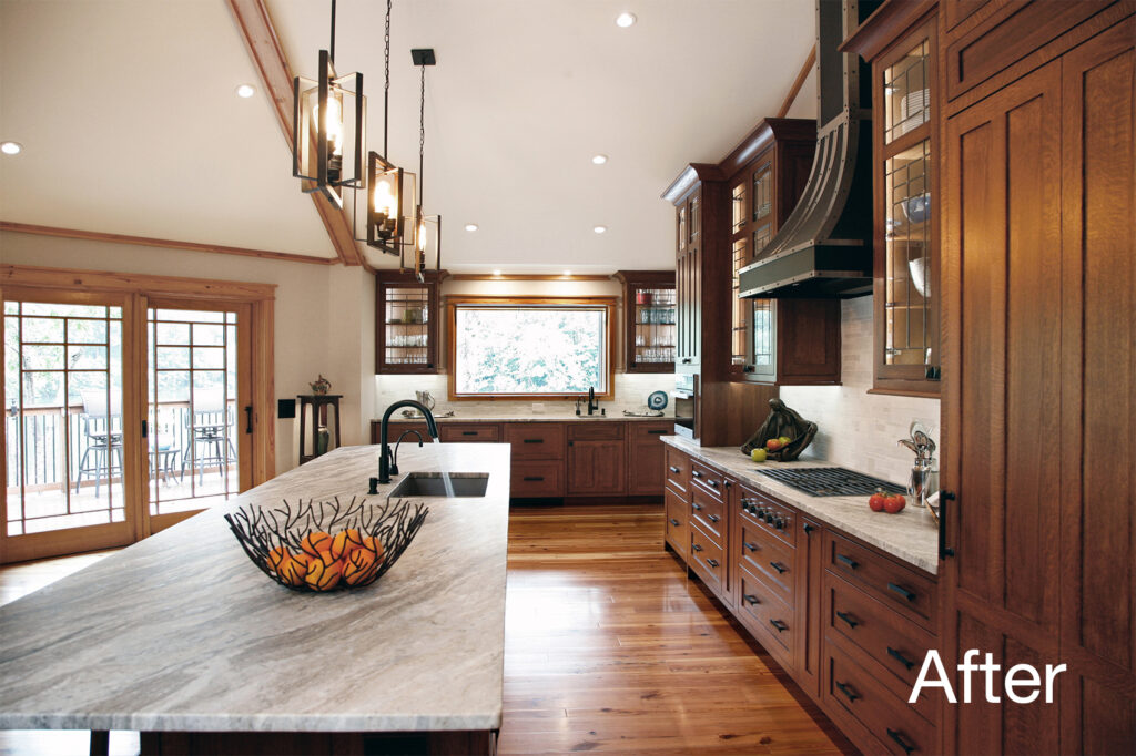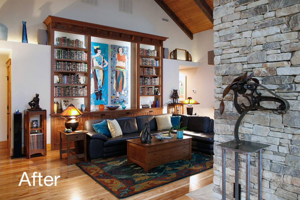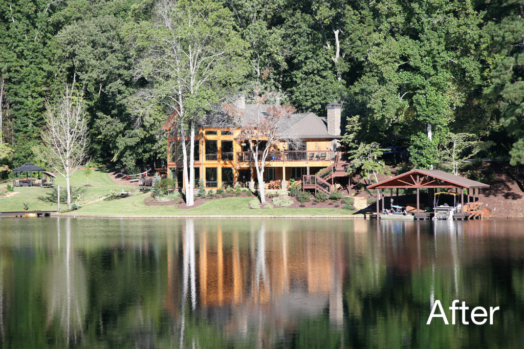 The clients’ newly purchased 2-story lakefront home was dated. They wanted an addition to modernize and expand the home enhancing the lake views, without making the house look “pretentious”. An extensive update with many special features included kitchen and bath renovations and the construction of two massive, stacked-stone fireplaces. The centerpiece is an expanded, 38’ x 25’ Great Room with 270-degree lake views, a 19’ cathedral ceiling, and a three-story-high exterior glass wall. The open floor plan features wide walkways of warm, reclaimed pine connecting a dining room, family room, and fireside library with amazing lake views drawing the eye from every corner. The update also included taking full advantage of their beautiful surroundings by adding several outdoor living spaces; decking, covered patios, stone steps and pathways, a boat house, and an IPE wood dock.