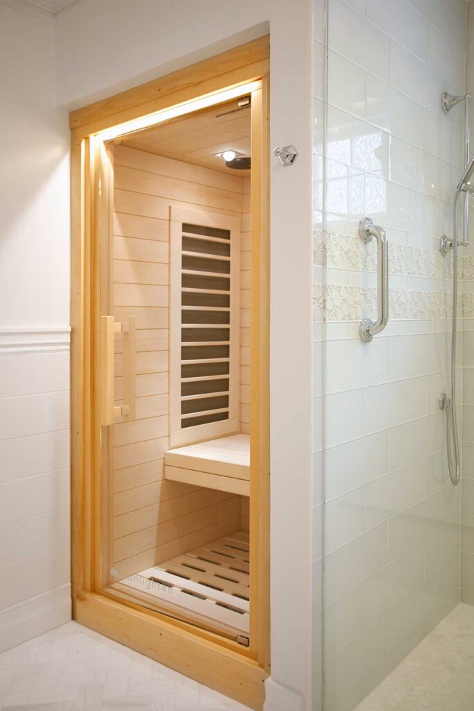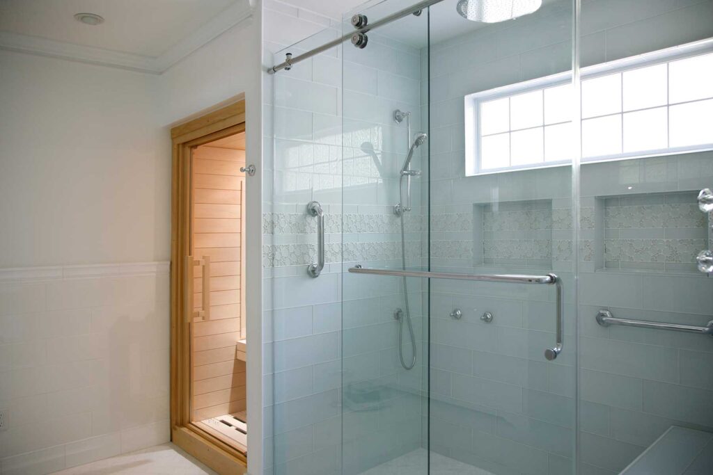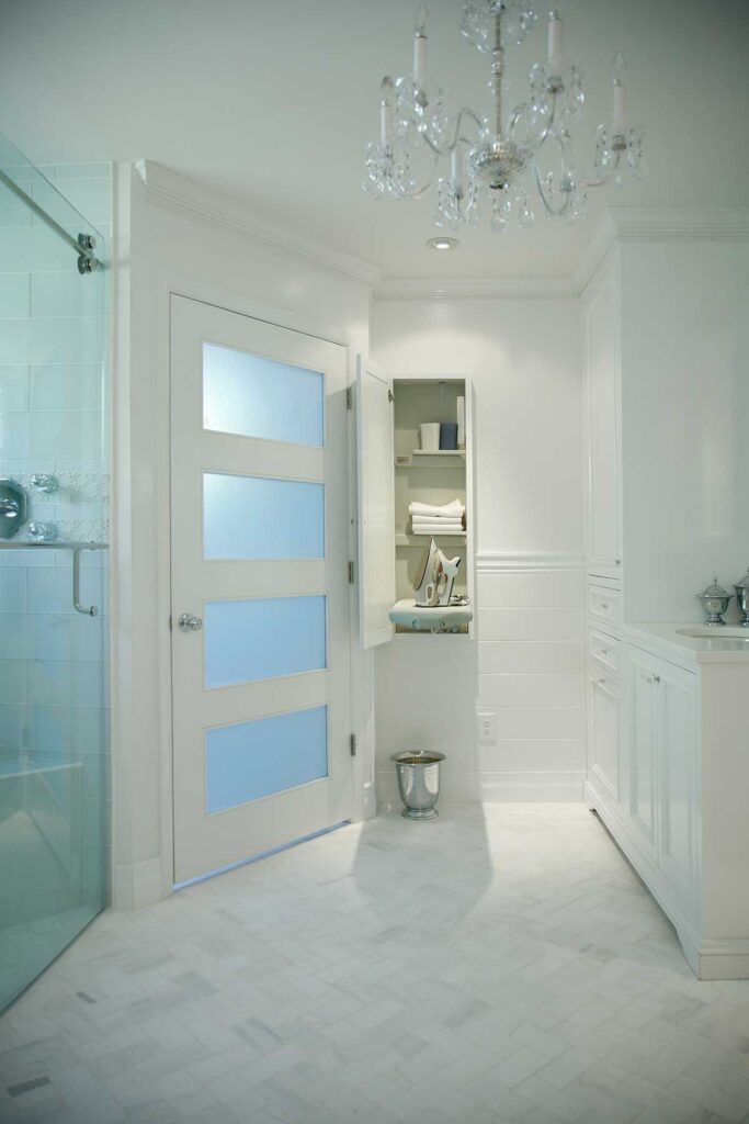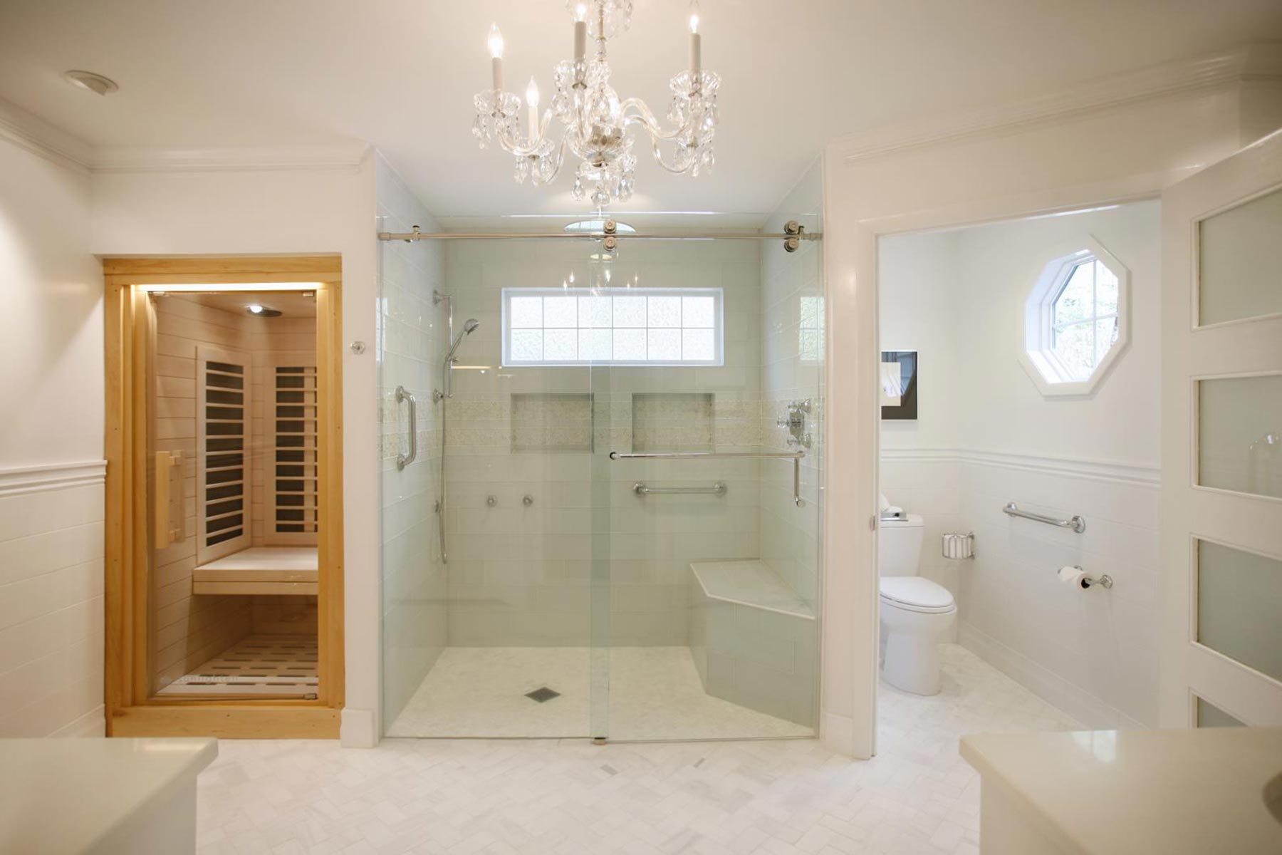 This Master Suite Addition containing Universal Design elements for Aging in Place is accessed a short 15’ walking distance from the front door via a “hidden door” in the dining room. Contrasting color and texture of bedroom wood flooring and white marble bath, with an artistic blend of glass tiles in the shower and ceramic tiles in the bath Wainscot, exudes stately elegance. From custom closets, custom cabinetry with storage solutions, built-in ironing board, frosted-glass and mirrored by-pass doors, radiant heat sauna, heated tile floor, shower floor, niches, and bench to a crystal chandelier, this space is elegantly over the top!