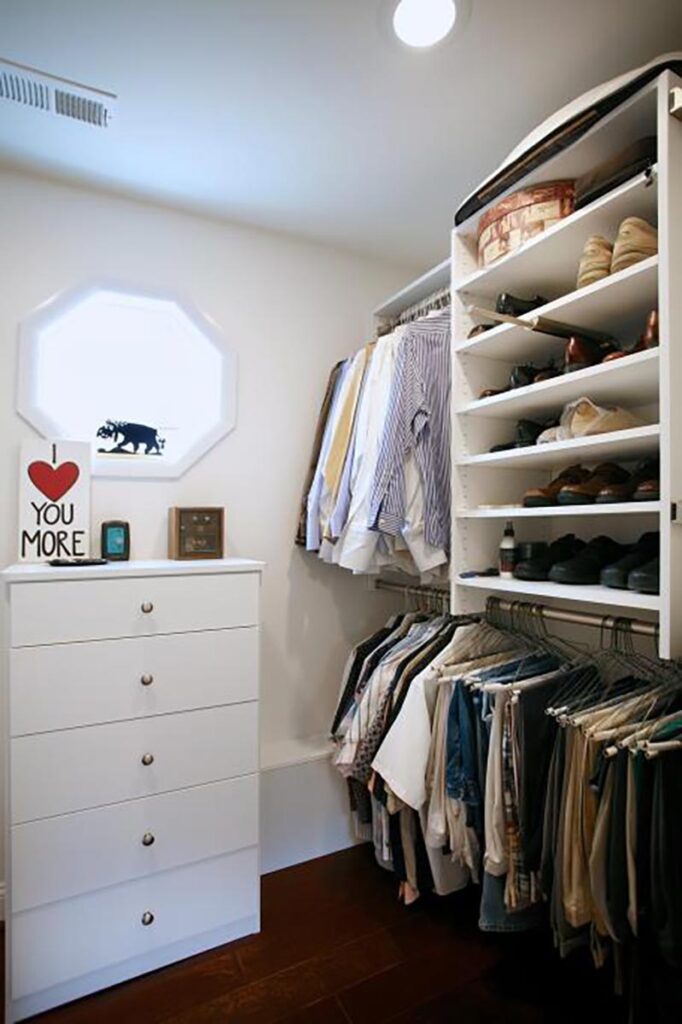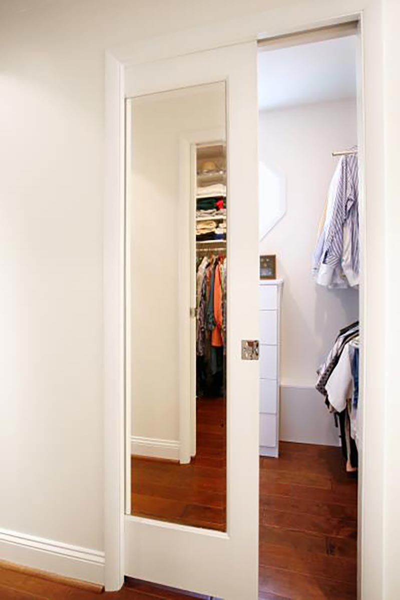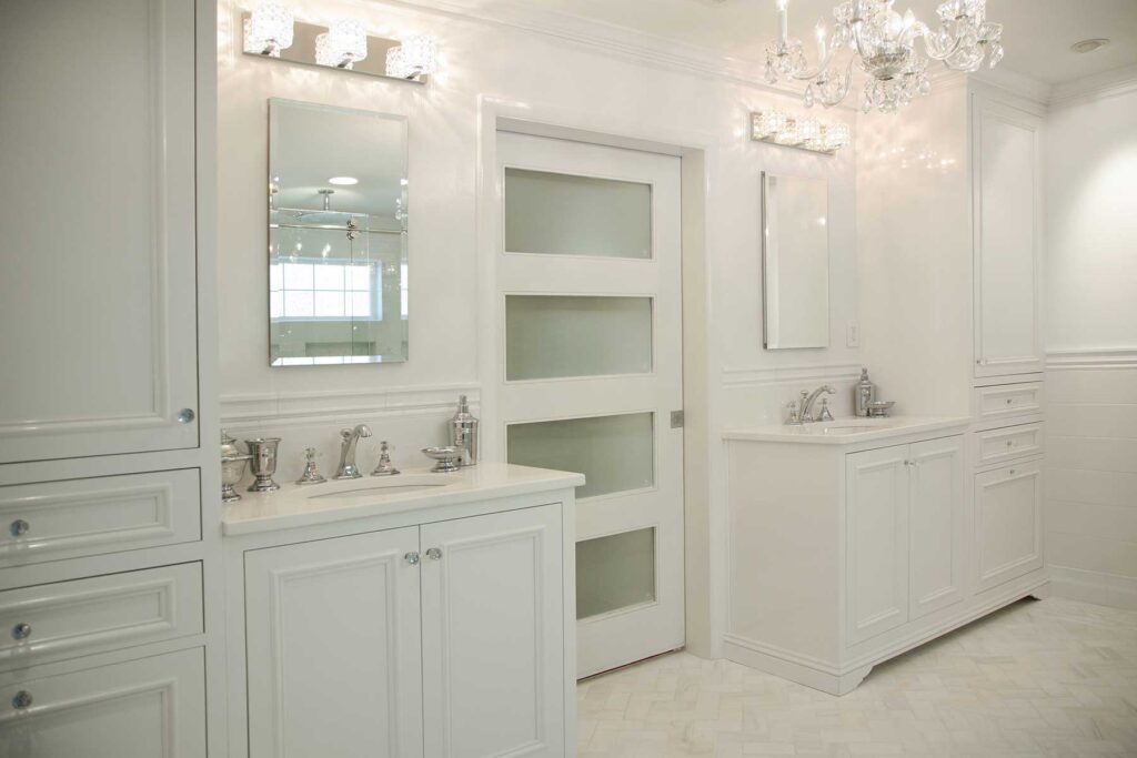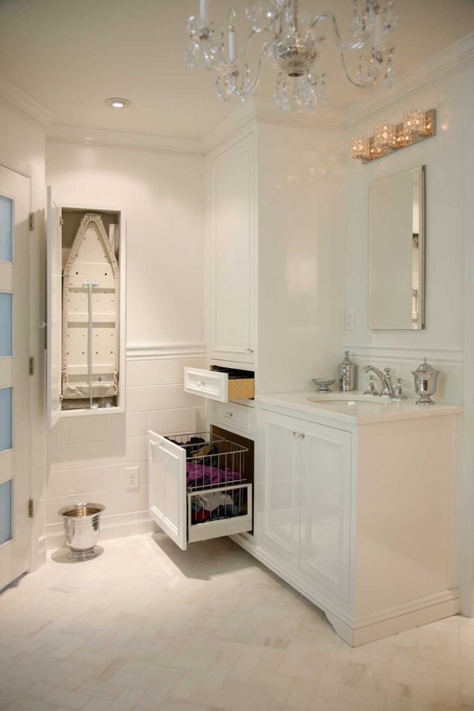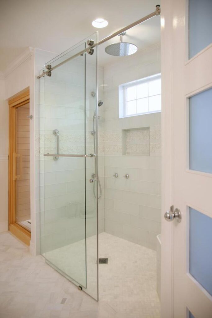 This Master Suite Addition containing Universal Design elements for Aging in Place is accessed a short 15’ walking distance from the front door via a “hidden door” in the dining room. Contrasting color and texture of bedroom wood flooring and white marble bath, with an artistic blend of glass tiles in the shower and ceramic tiles in the bath Wainscot, exudes stately elegance. From custom closets, custom cabinetry with storage solutions, built-in ironing board, frosted-glass and mirrored by-pass doors, radiant heat sauna, heated tile floor, shower floor, niches, and bench to a crystal chandelier, this space is elegantly over the top!