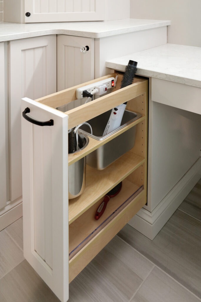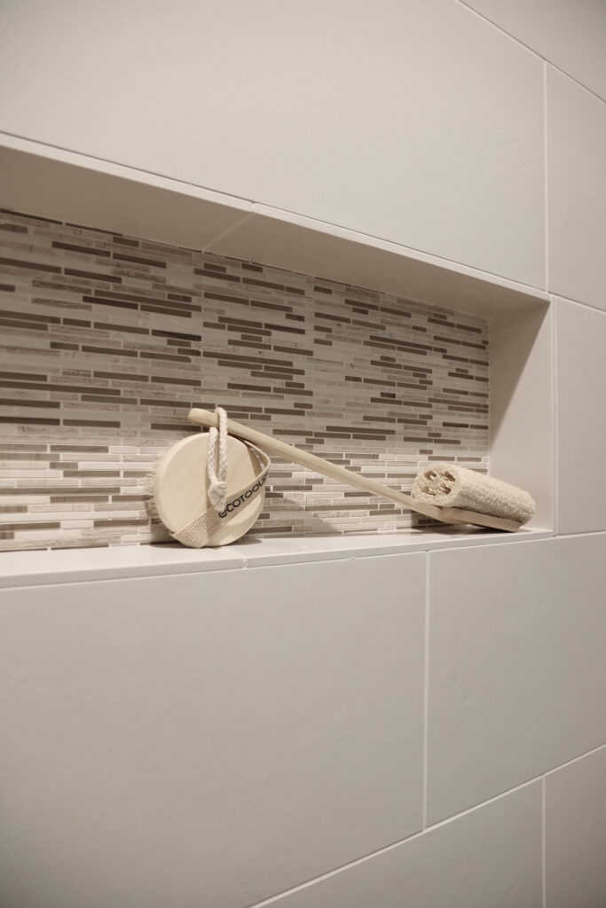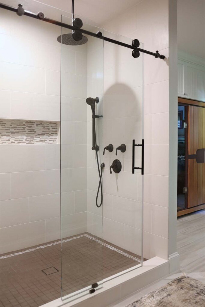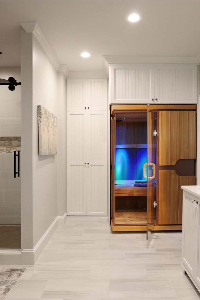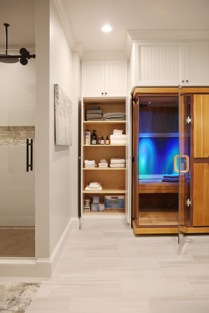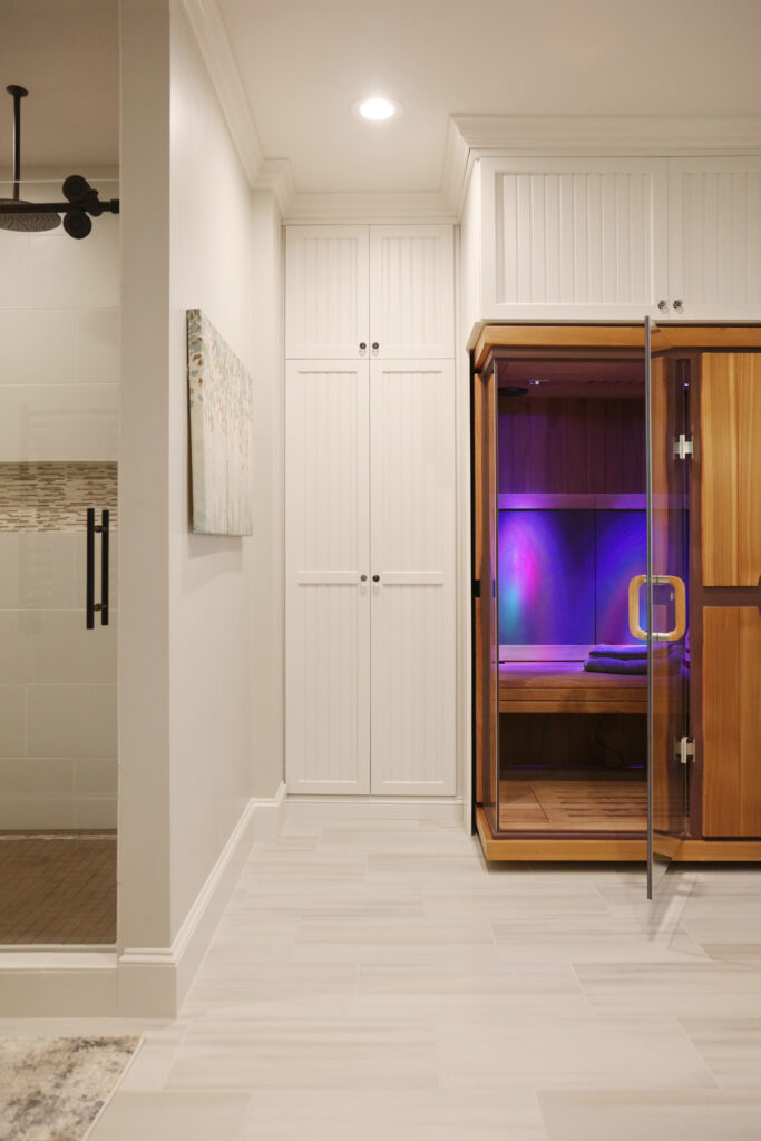 The infrared sauna for two is snuggled as an elegant focal point beside a roomy linen closet and affords vast storage above it as well. Redesigning the bedroom’s bulky wall that previously contained one of their closets created a direct entrance to their new spa-like master bath. Using our HOMEStyle System™’s INSPIREDDesign™, we were able to execute a redesign on this space to transform our clients’ home and enrich their lives!