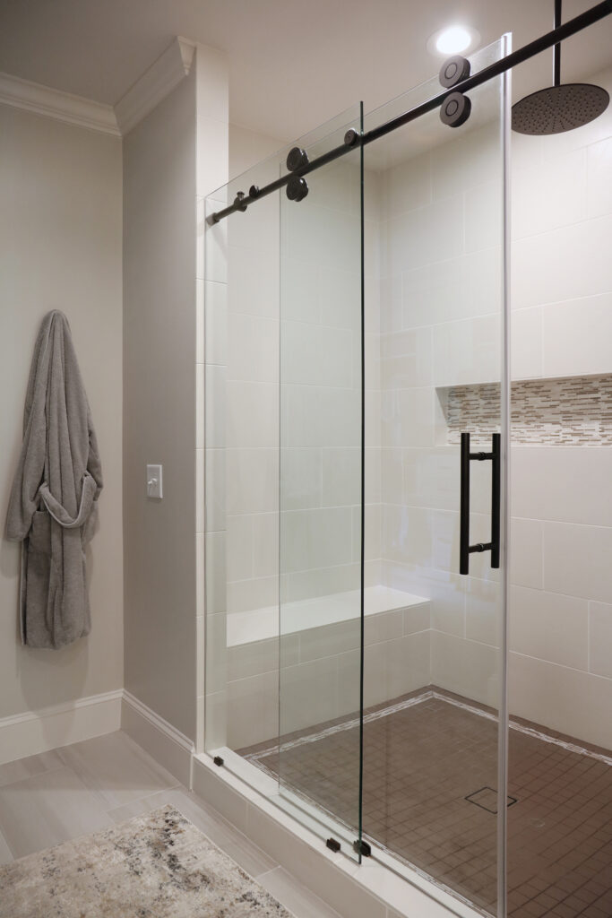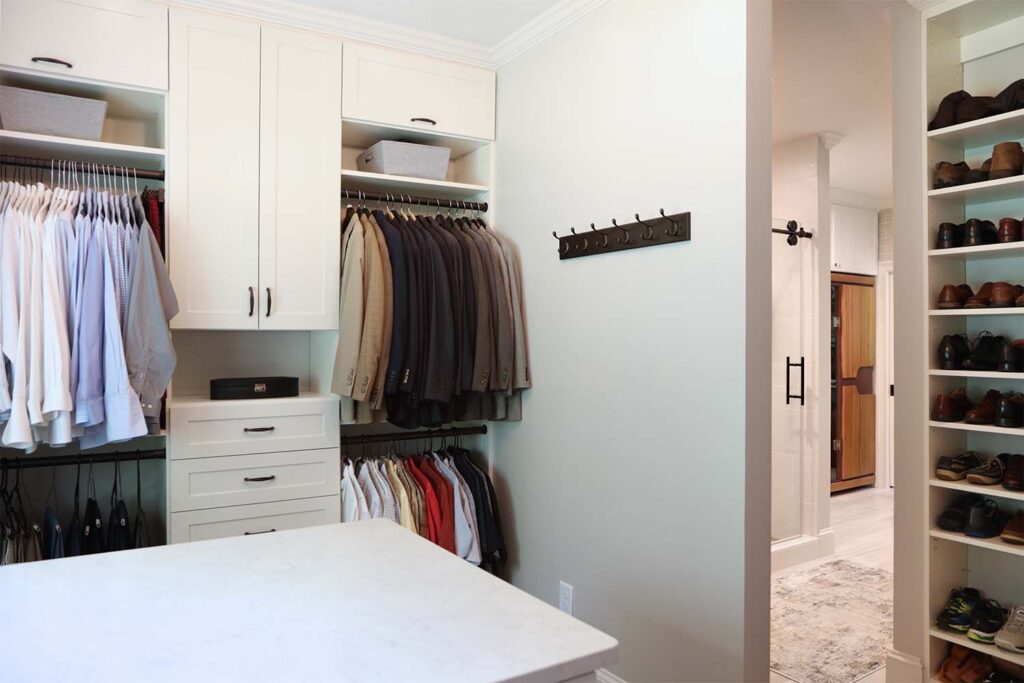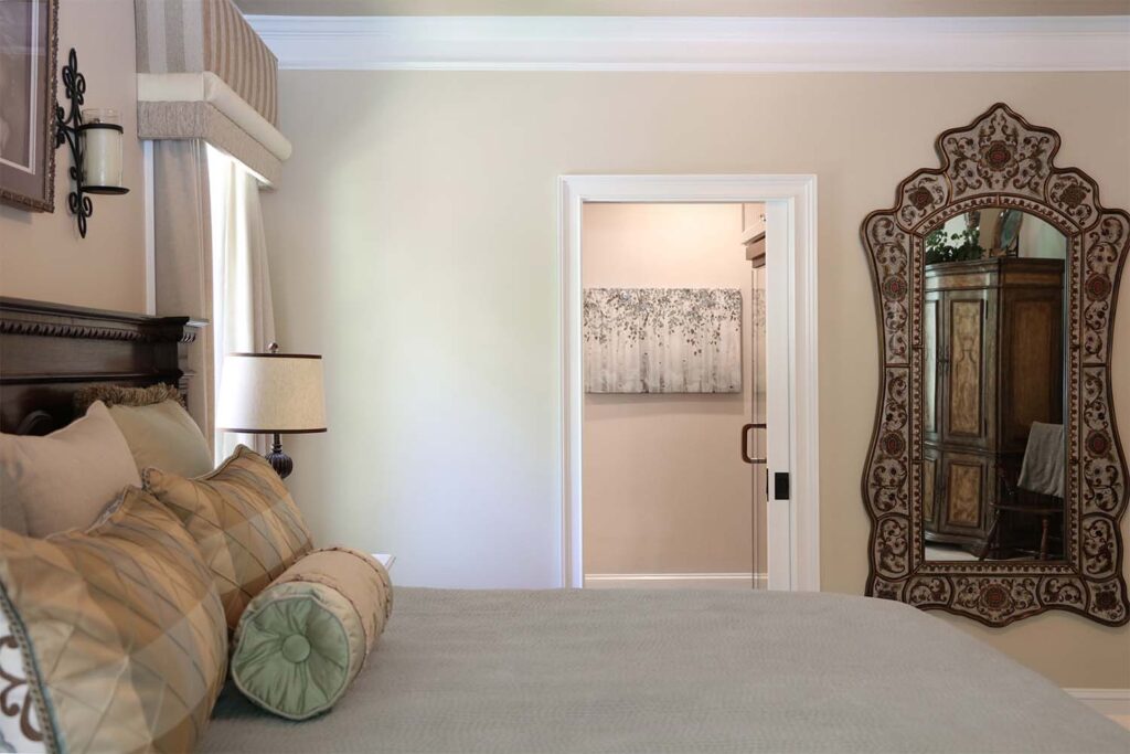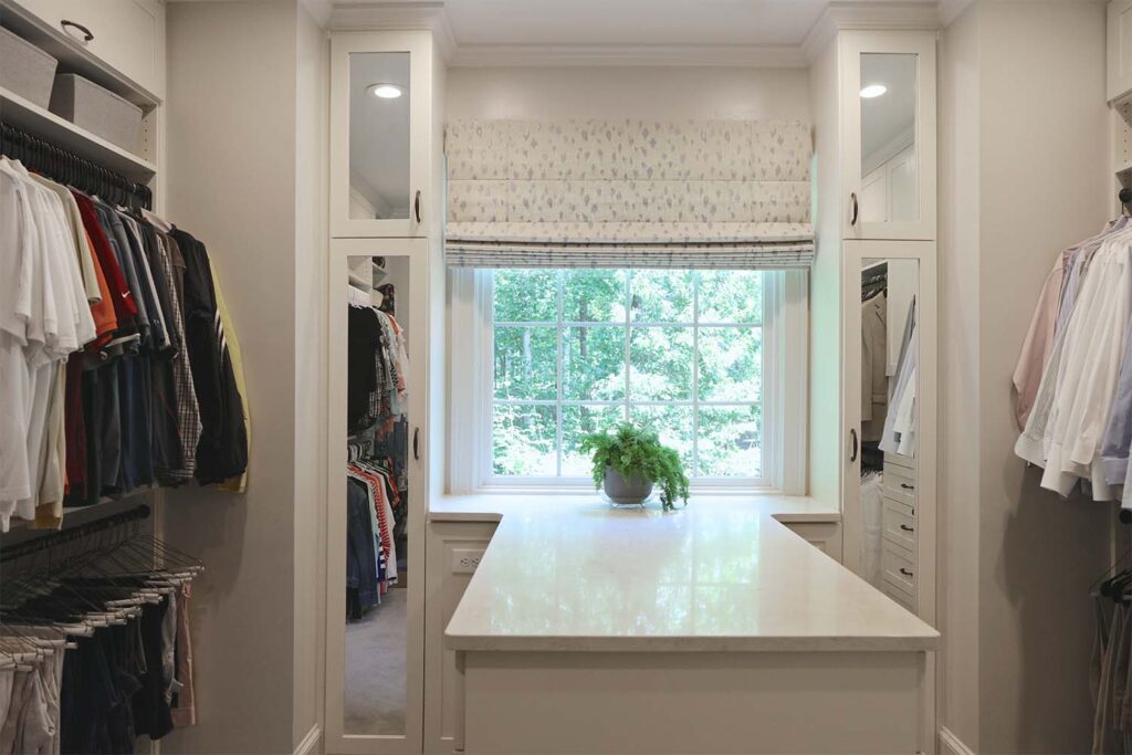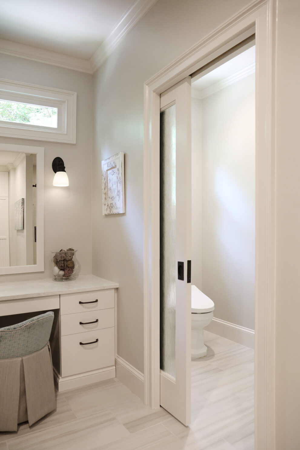 This Wynthrop Manor home had a dated bathroom with an awkward layout. The couple had to walk down a narrow hallway, past their separate walk-in closets, in order to access the bathroom. We changed the layout to lead from the master bedroom, through a rain-glass pocket door, and right into their spacious master bathroom. Behind the bathroom we built an expansive custom closet for two.