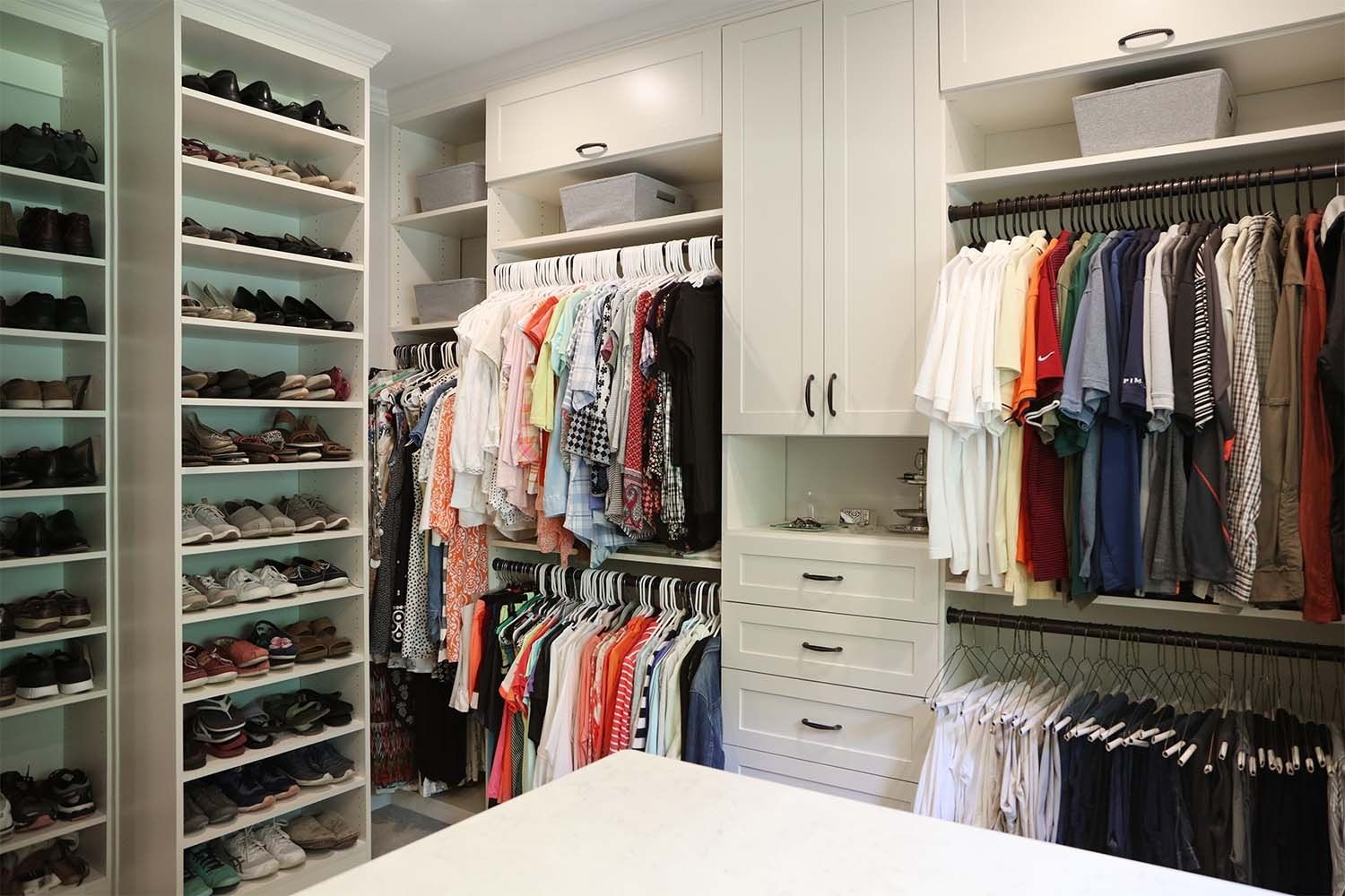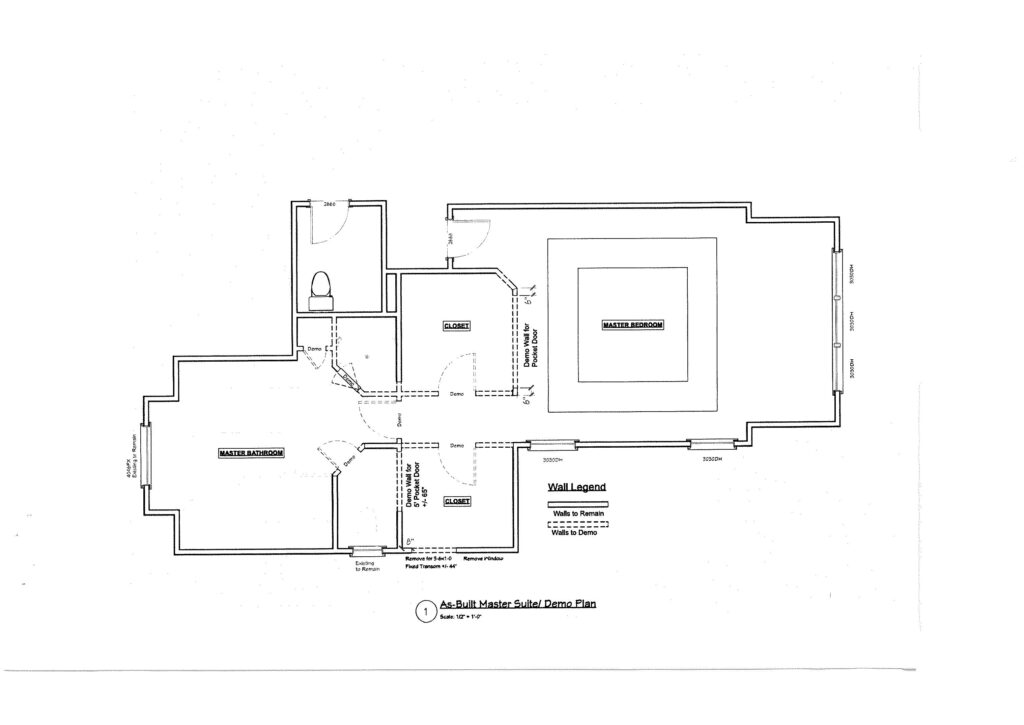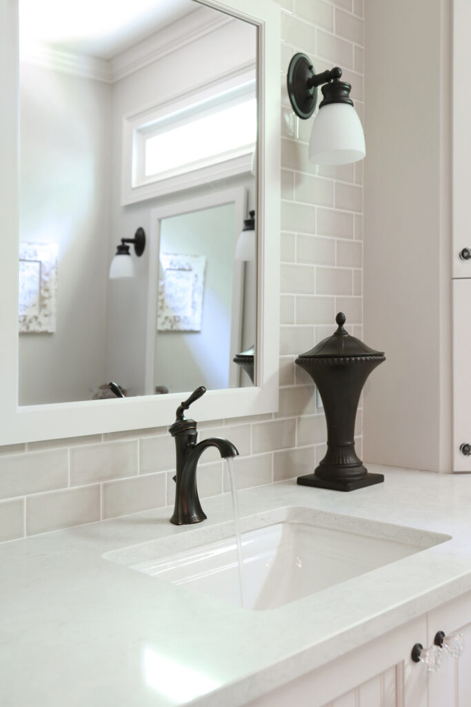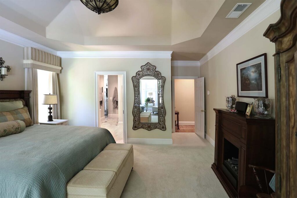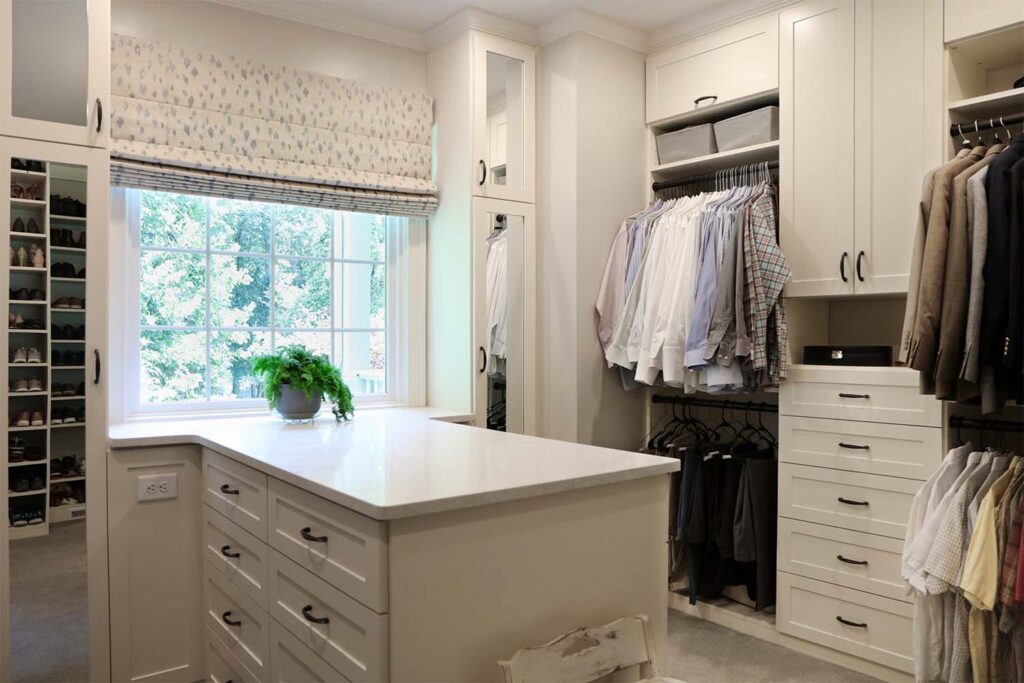 This Wynthrop Manor home had a dated bathroom with an awkward layout. The couple had to walk down a narrow hallway, past their separate walk-in closets, in order to access the bathroom. We changed the layout to lead from the master bedroom, through a rain-glass pocket door, and right into their spacious master bathroom. Behind the bathroom we built an expansive custom closet for two.