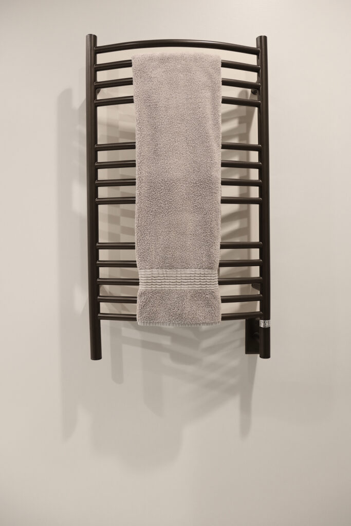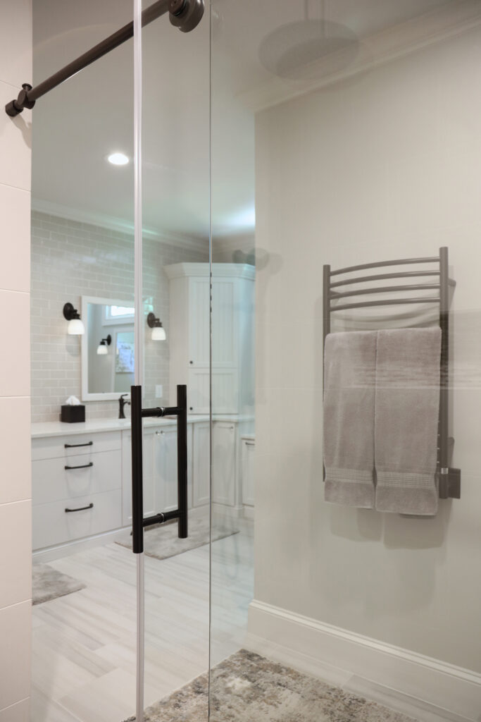 The bathroom boasts a heated tile floor, a heated towel rack, and a luxurious walk-in shower. The prominently featured dark bronze hardware compliments the abundance of white and pearl tiles used. Gleaming pearl subway tiles create a lovely backsplash/accent wall behind the white double vanity. There is storage galore with white custom cabinetry, including ample storage solutions.