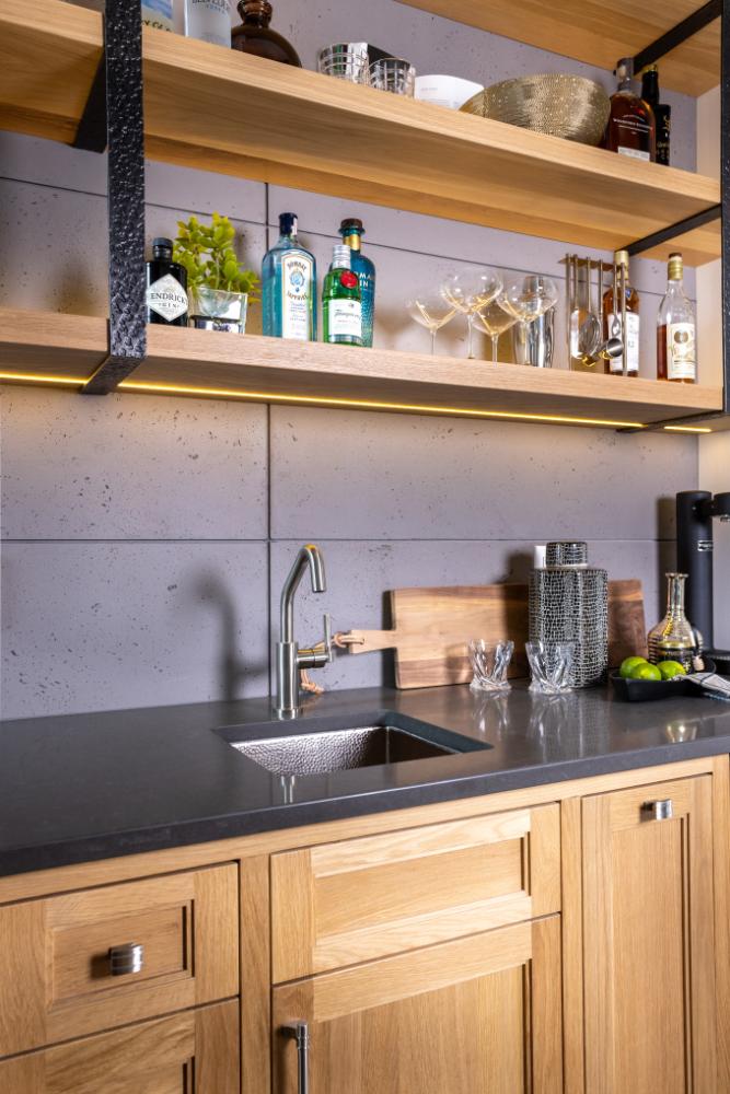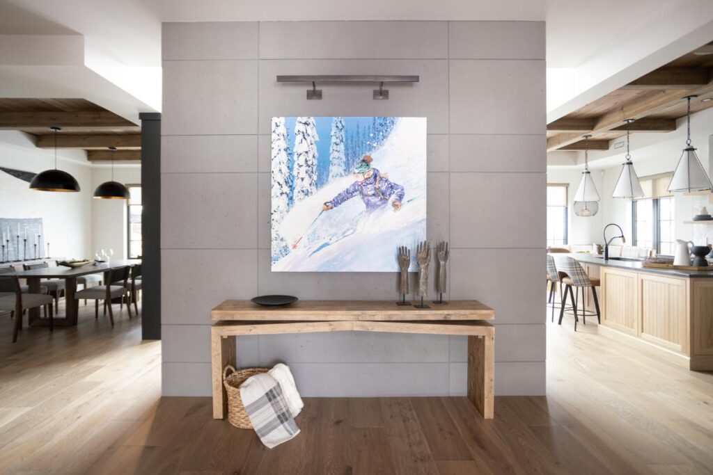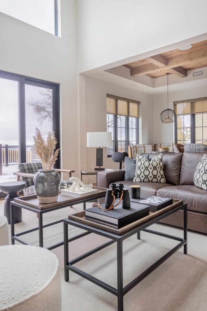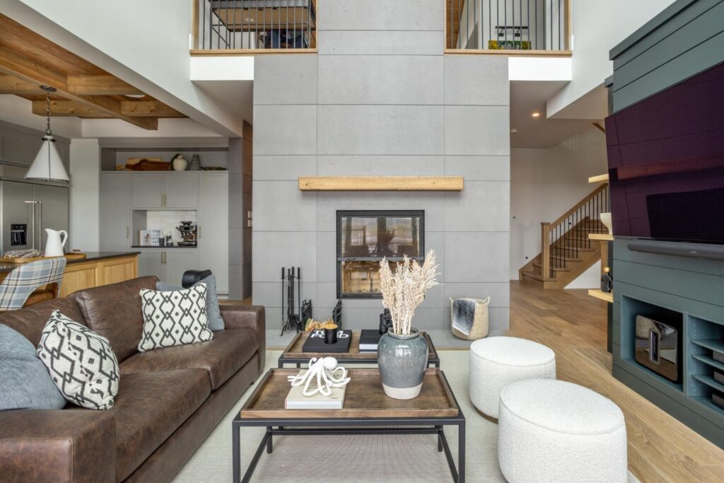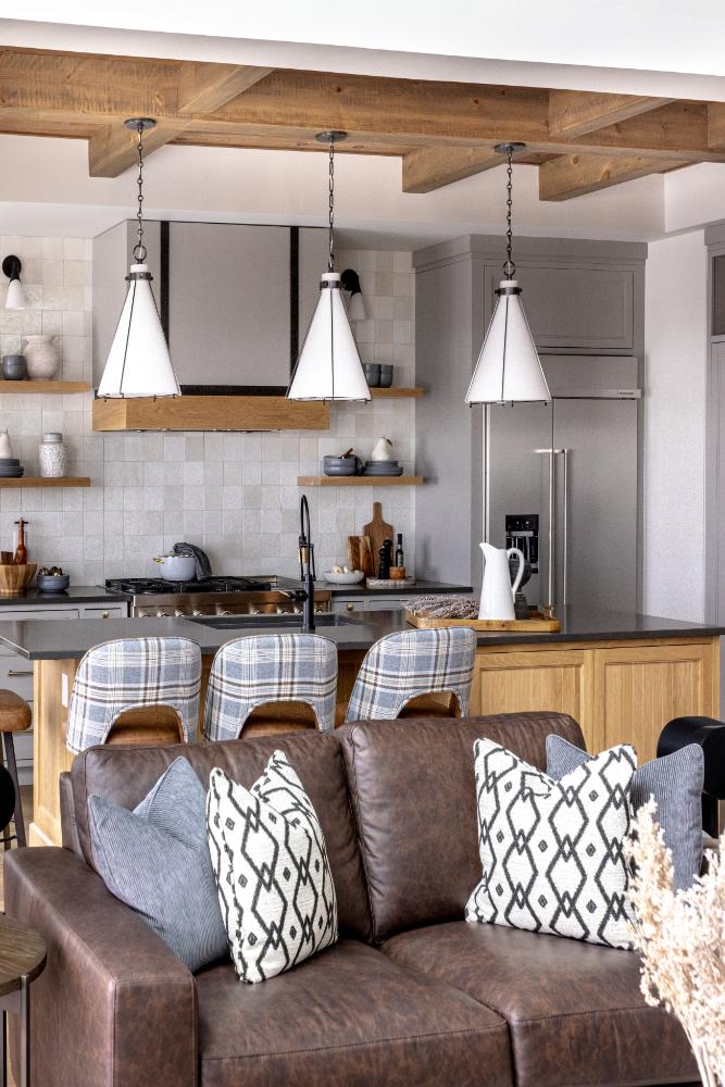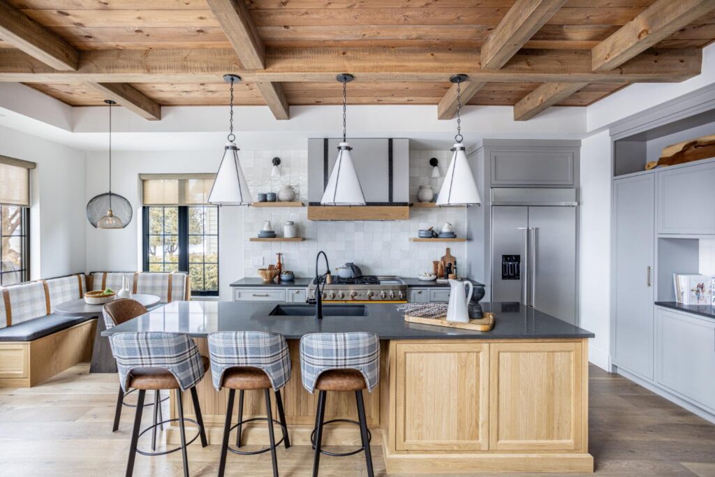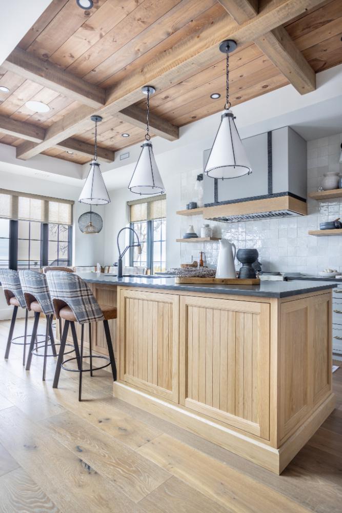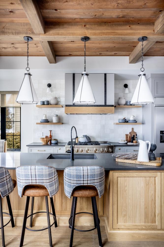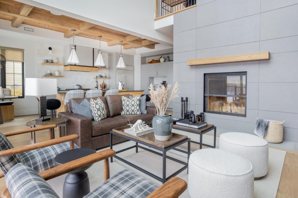 As you step into this cozy retreat, you’ll immediately be captivated by the unique blend of modern luxury and charm. Details like the coffee bar, adorned with a meticulously tiled backsplash, add a touch of sophistication to your morning routine. Wooden ceilings soar overhead, infusing the space with warmth and character, while intriguing light fixtures cast a soft glow, creating an inviting ambiance.