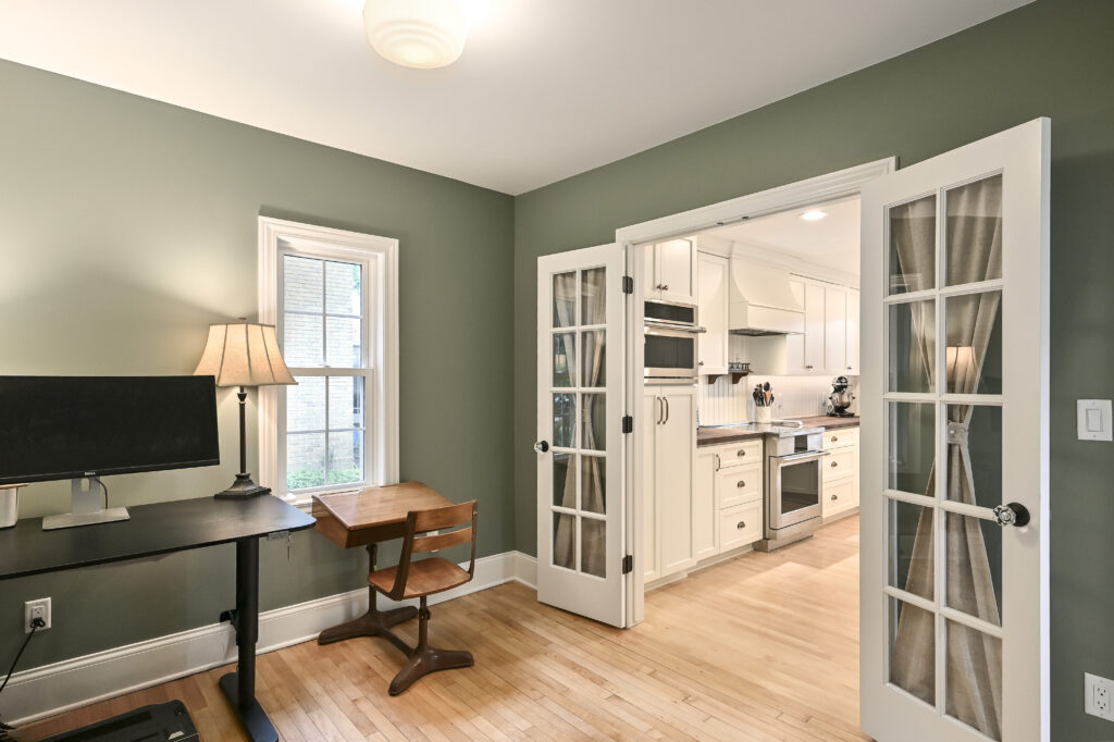 The former kitchen became a bright, focused home office. The existing windows make the space feel intentional. Not leftover.
