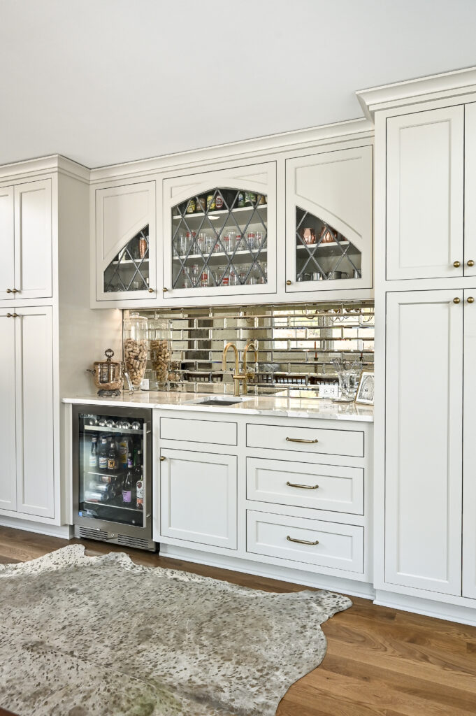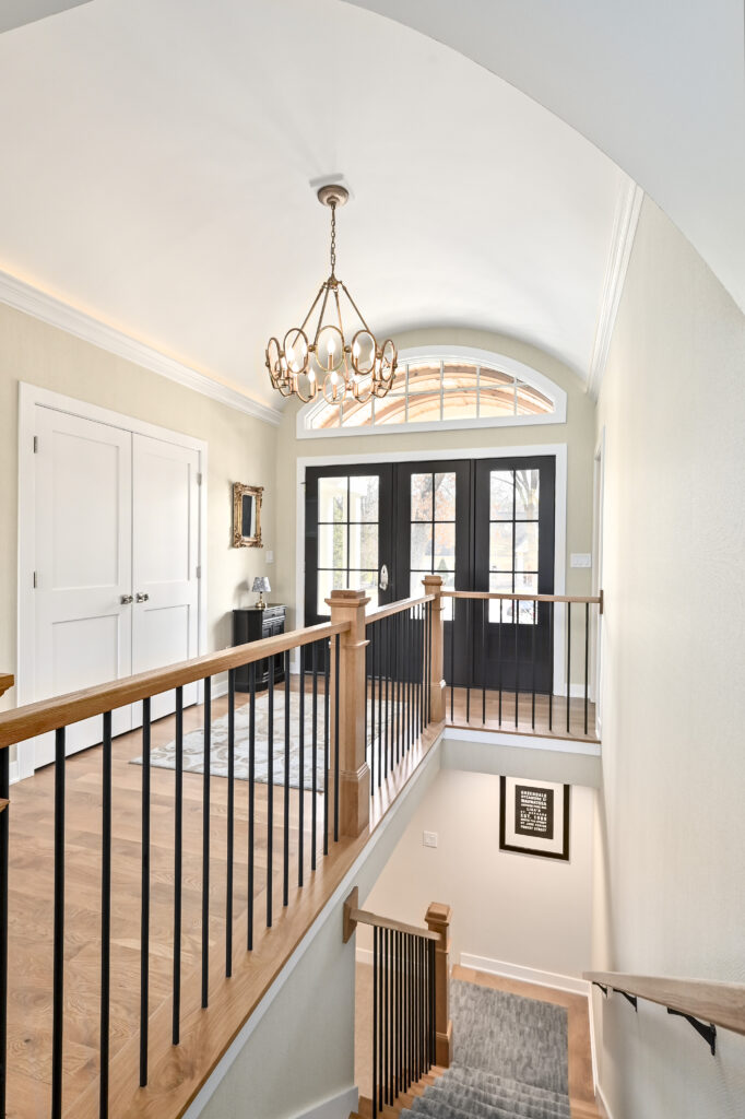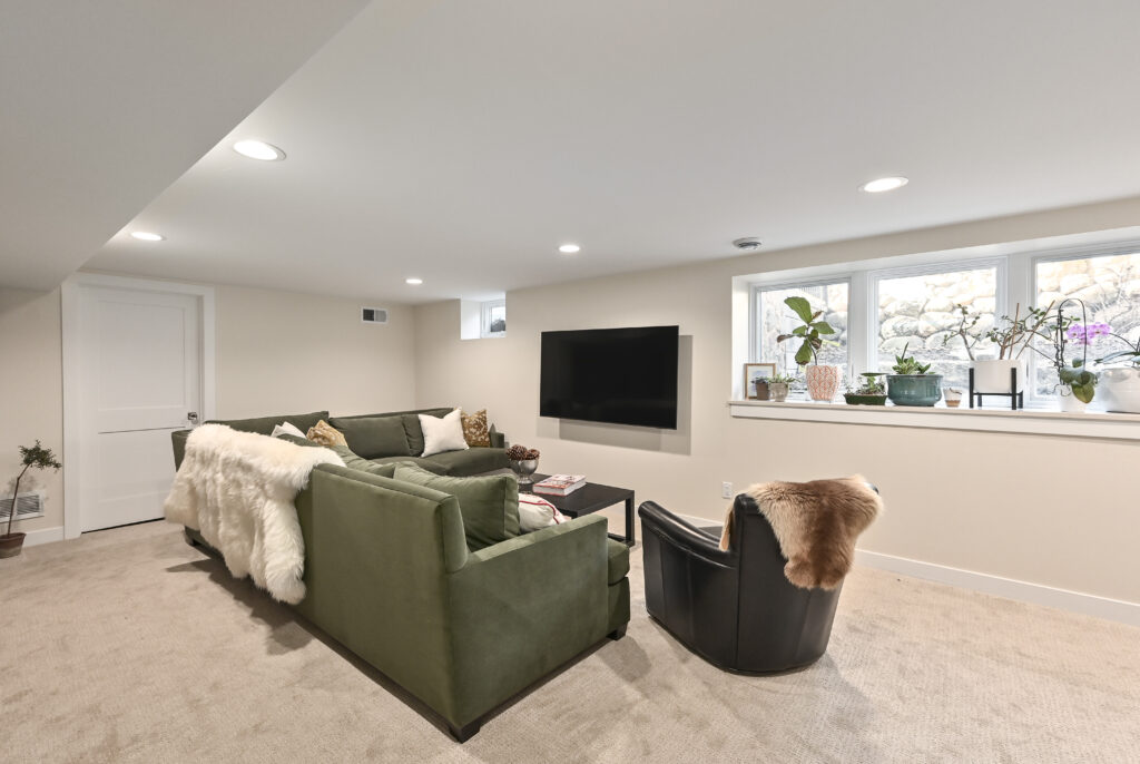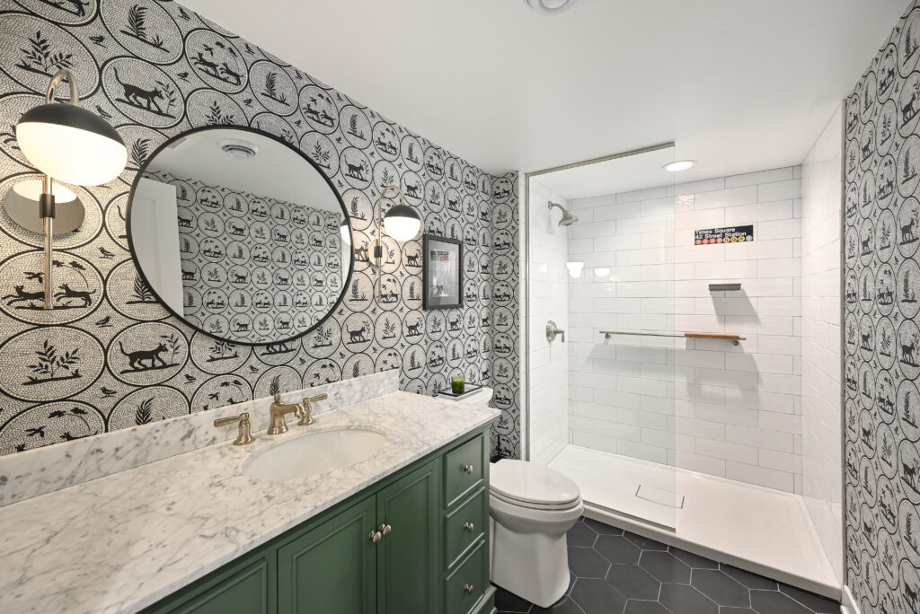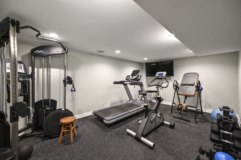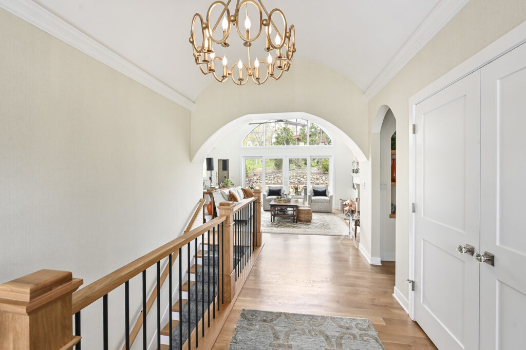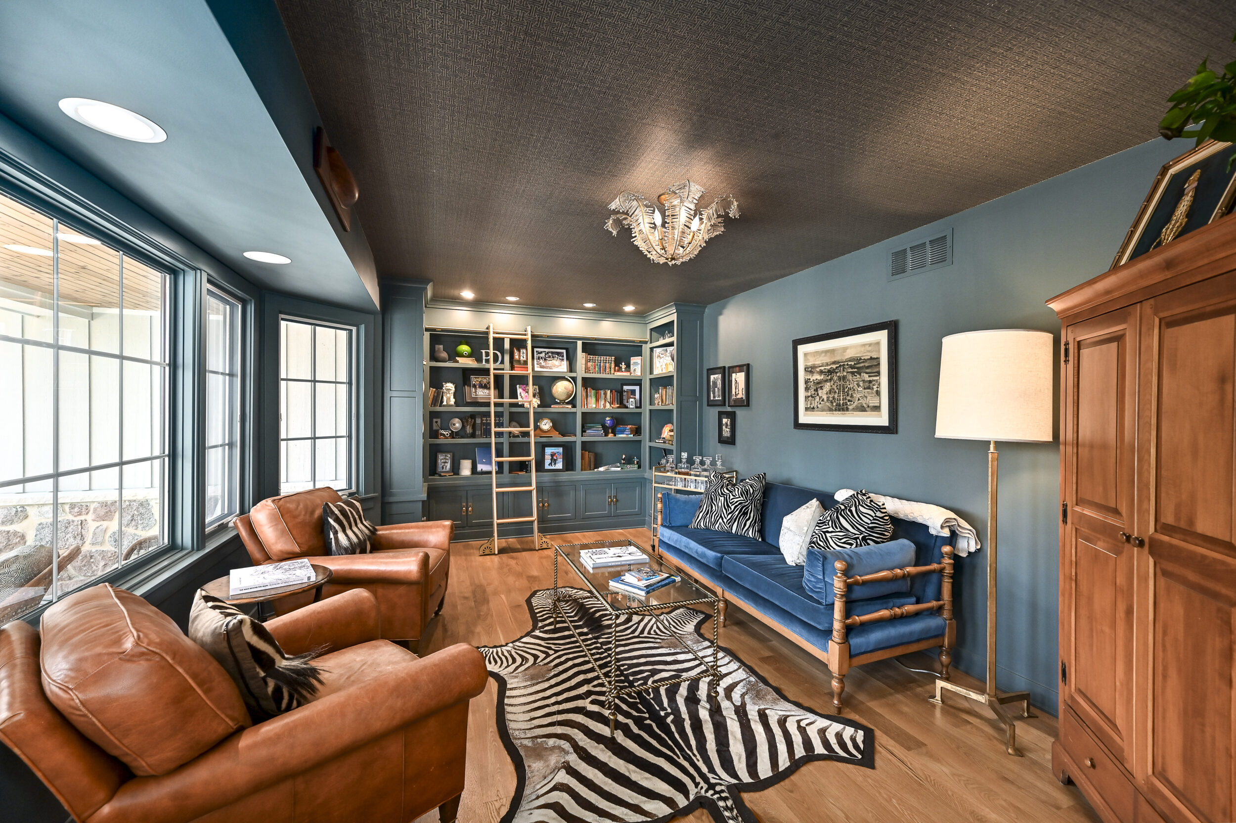 The lower level was fully finished to support family gatherings, with dedicated children’s areas and a workout room. Throughout the home, custom details—including a library with built‑in shelving, a rolling ladder, and wallpapered walls and ceilings—add character and depth.