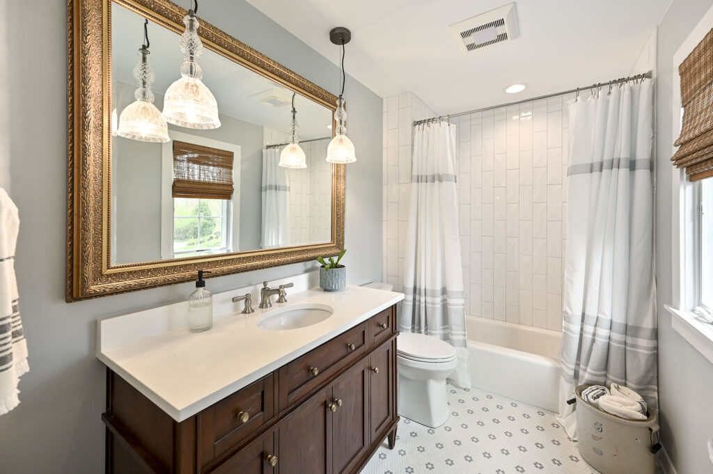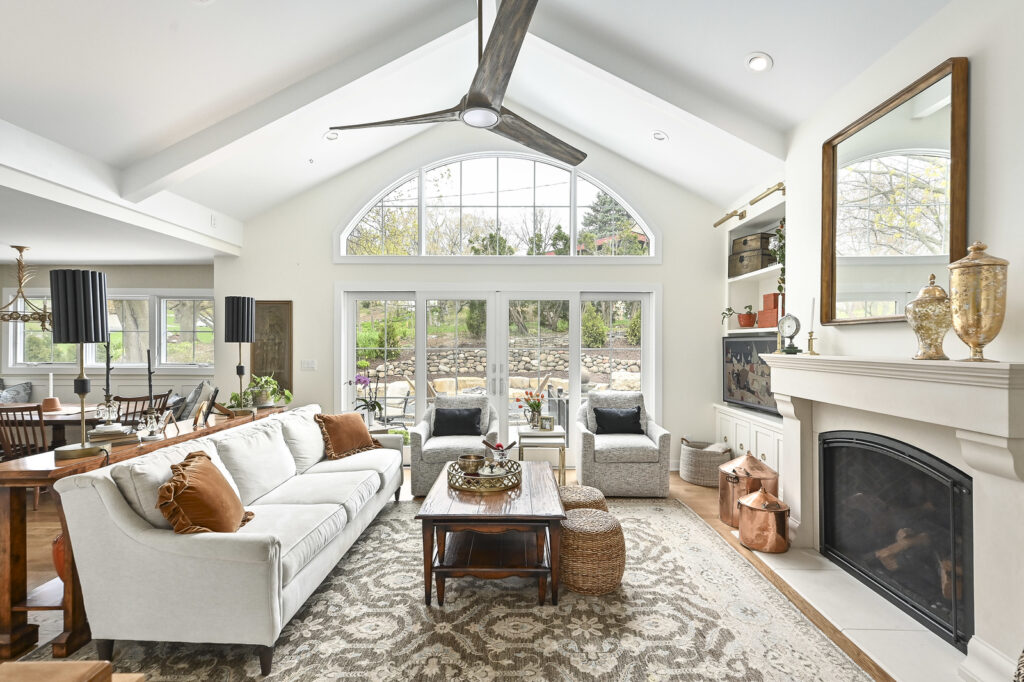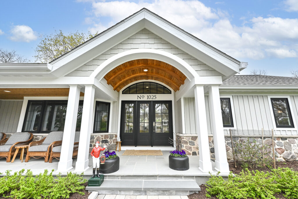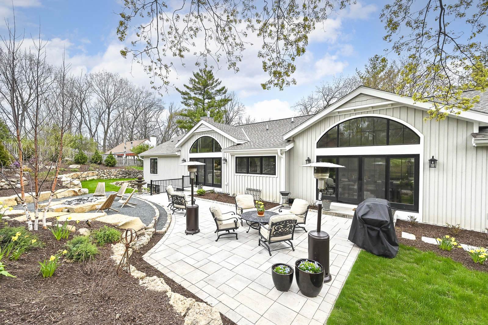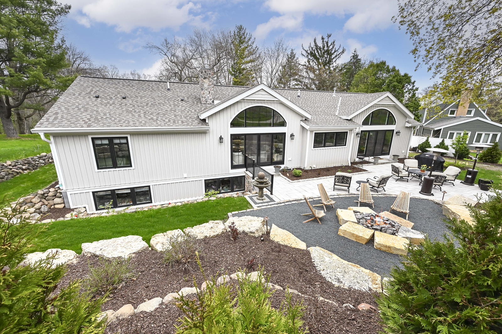 Outside, original stone was thoughtfully salvaged and reused, complemented by all‑new siding and trim. A restored cupola from a neighboring property adds a distinctive architectural touch. The new bluestone patio and raised natural‑gas firepit create an inviting four‑season outdoor living space.
