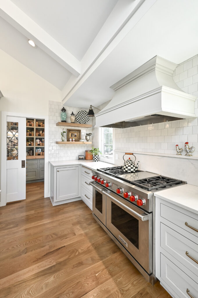 A tired 1960s ranch was transformed into a warm, modern home designed for multigenerational living. A full roof rebuild allowed for vaulted ceilings throughout, including a dramatic barrel‑vaulted foyer that continues onto a matching natural‑cedar porch. A light‑filled kitchen addition features a custom range wall, Wolf and Sub‑Zero appliances, and a private pantry that keeps everyday living organized and elevated.