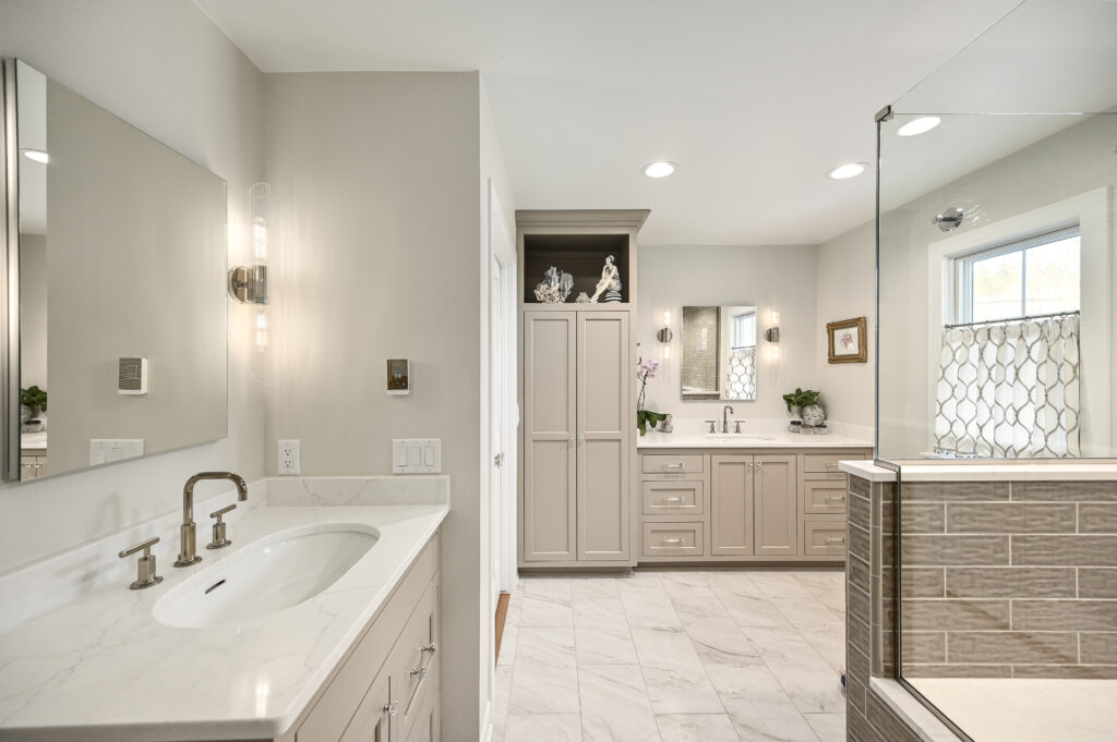 - Primary bathroom with dual vanities, barrier‑free shower, and heated floors