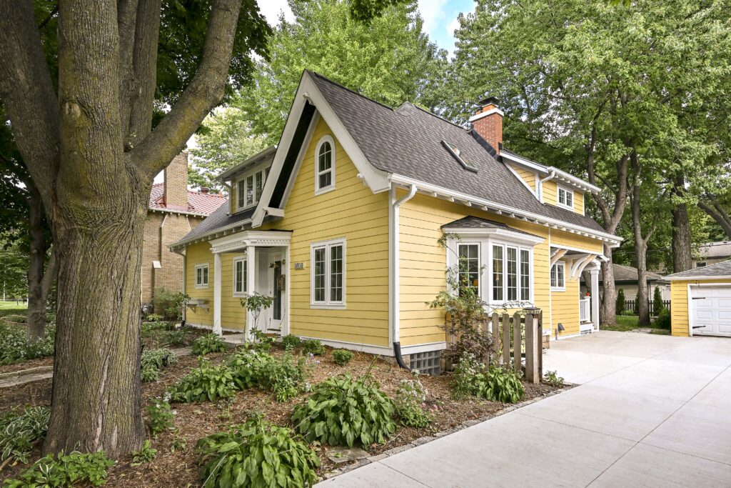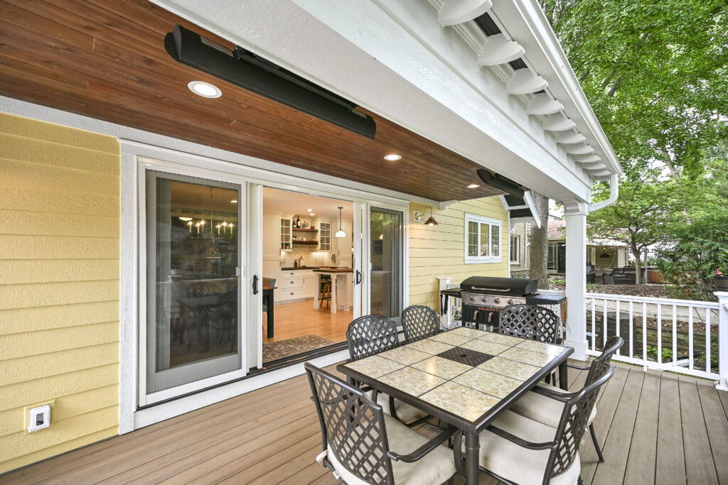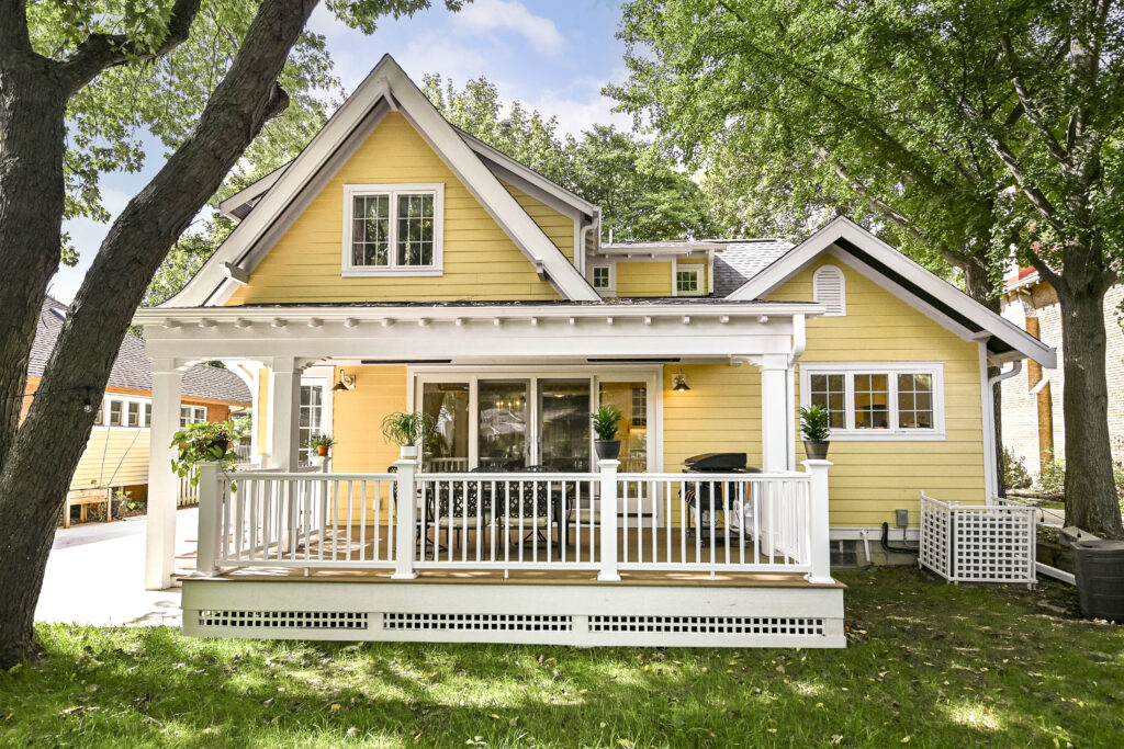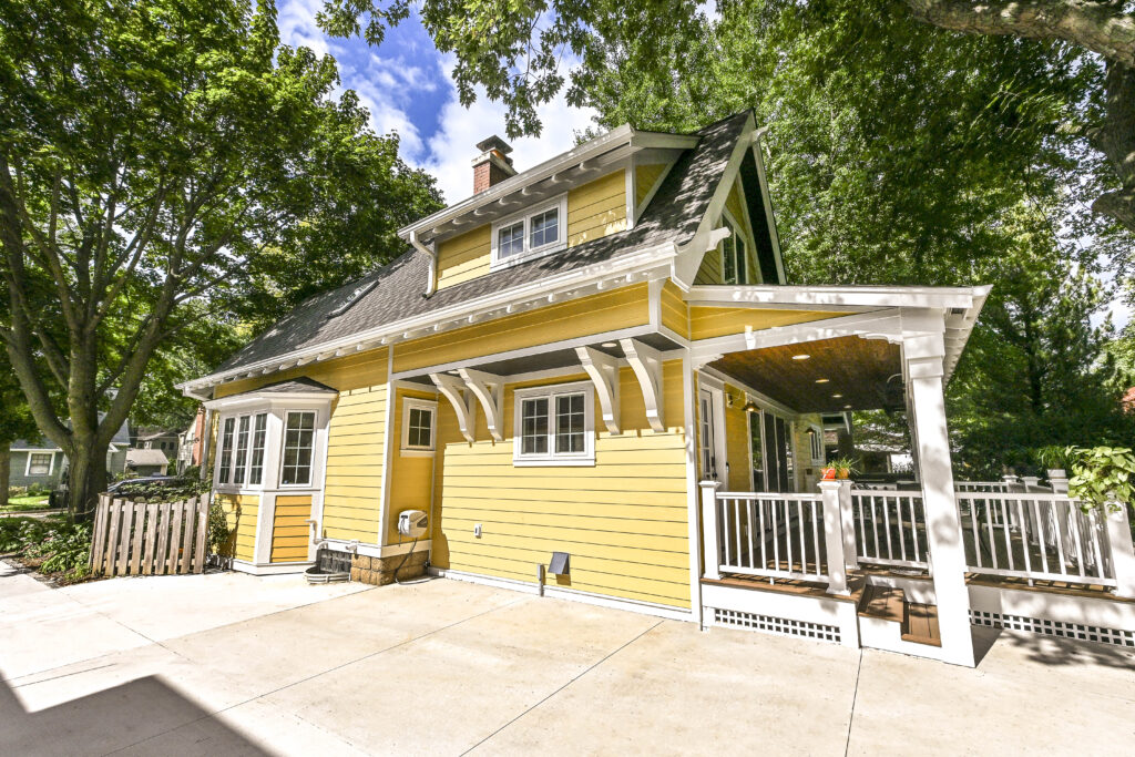 A full exterior overhaul included new siding, custom rafter tails, corbels, brackets, and a rebuilt front porch that replaced the sagging original entry. The back of the home gained a walk‑out porch, a new deck, and a rear addition that ties into the home’s architecture. A new concrete driveway completed the exterior refresh.