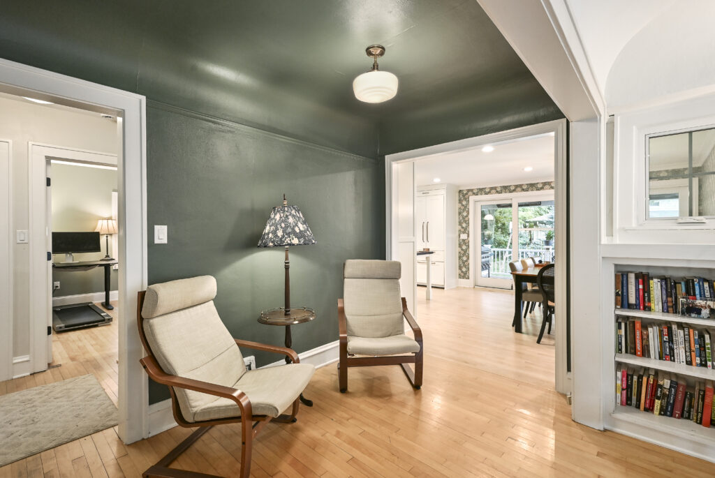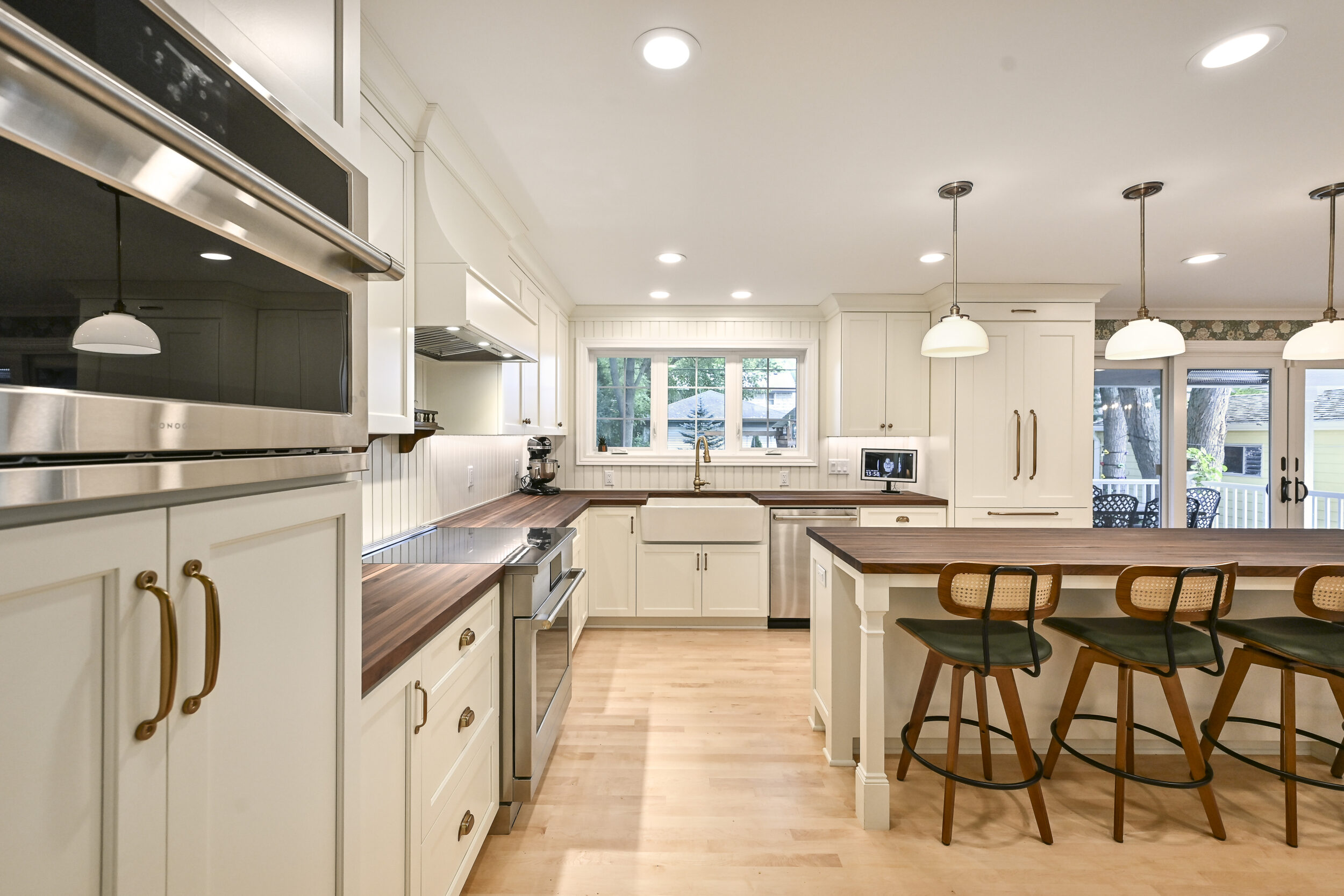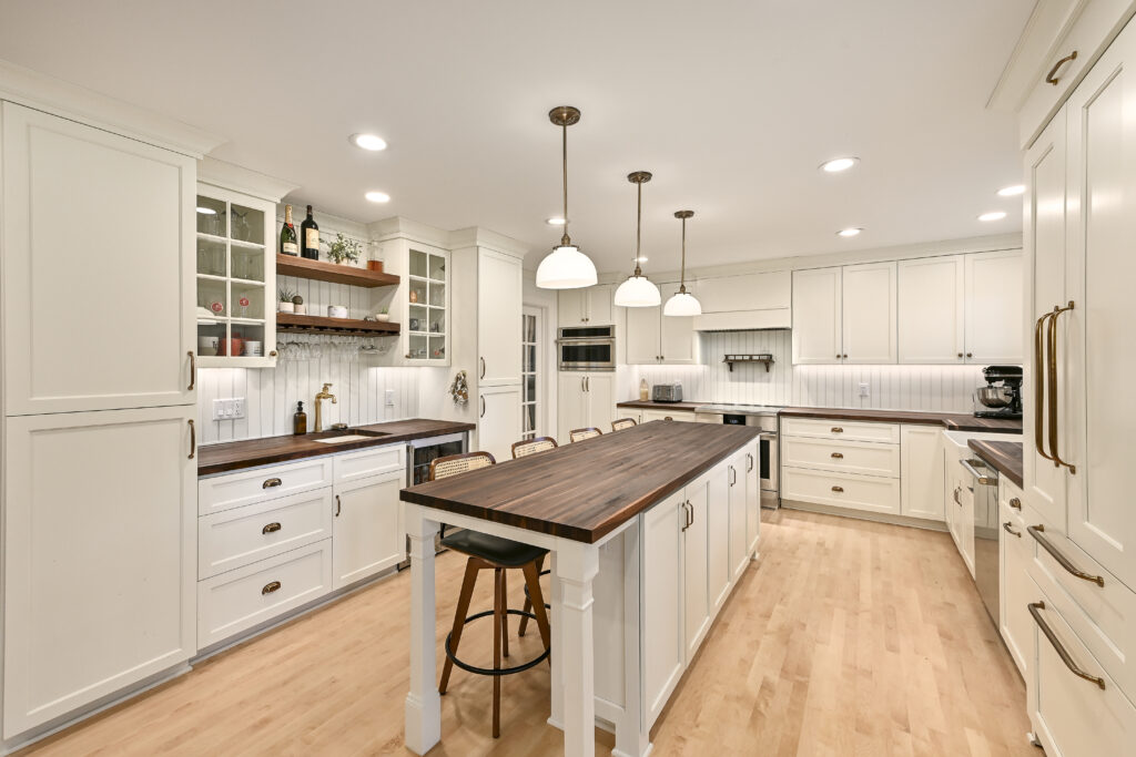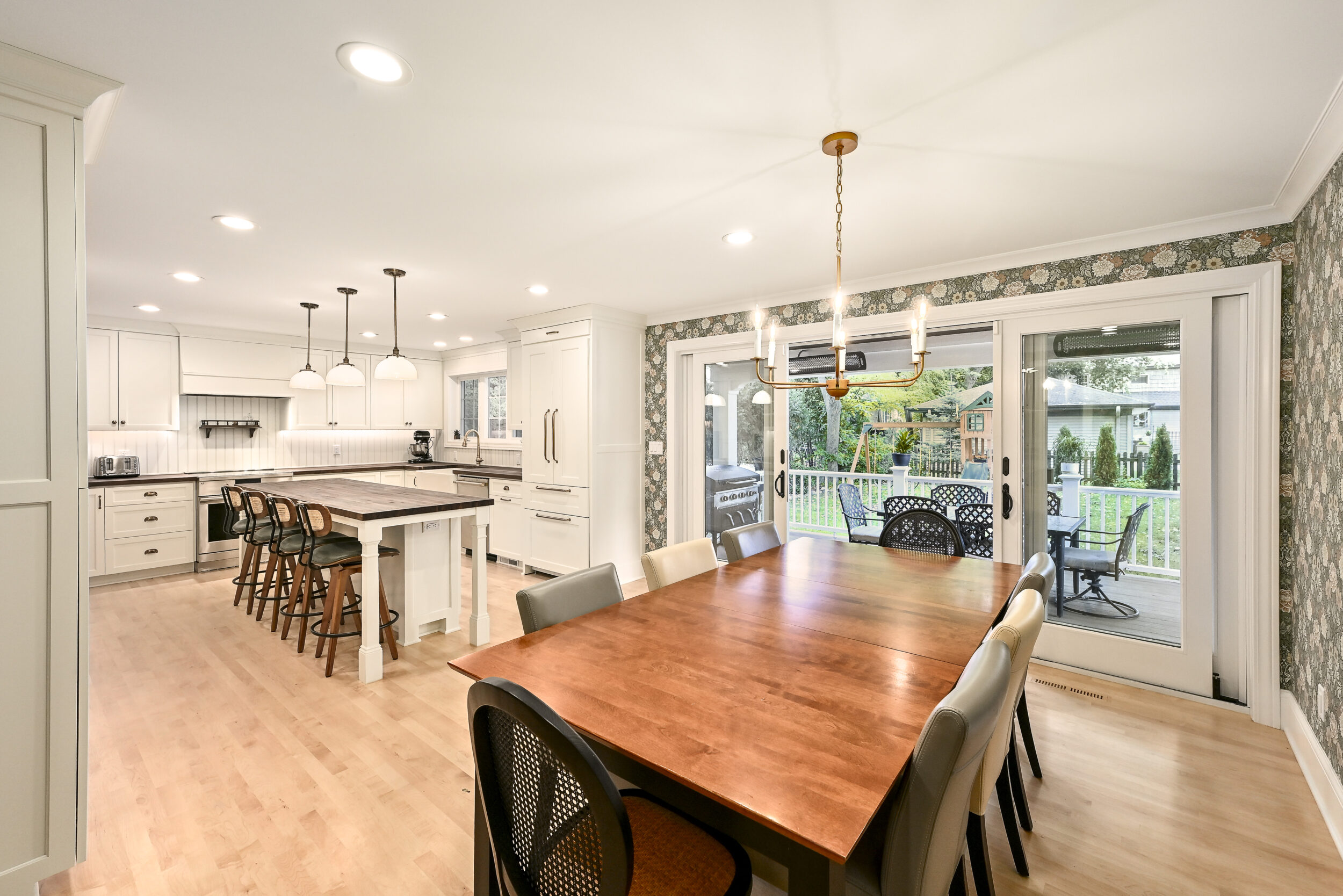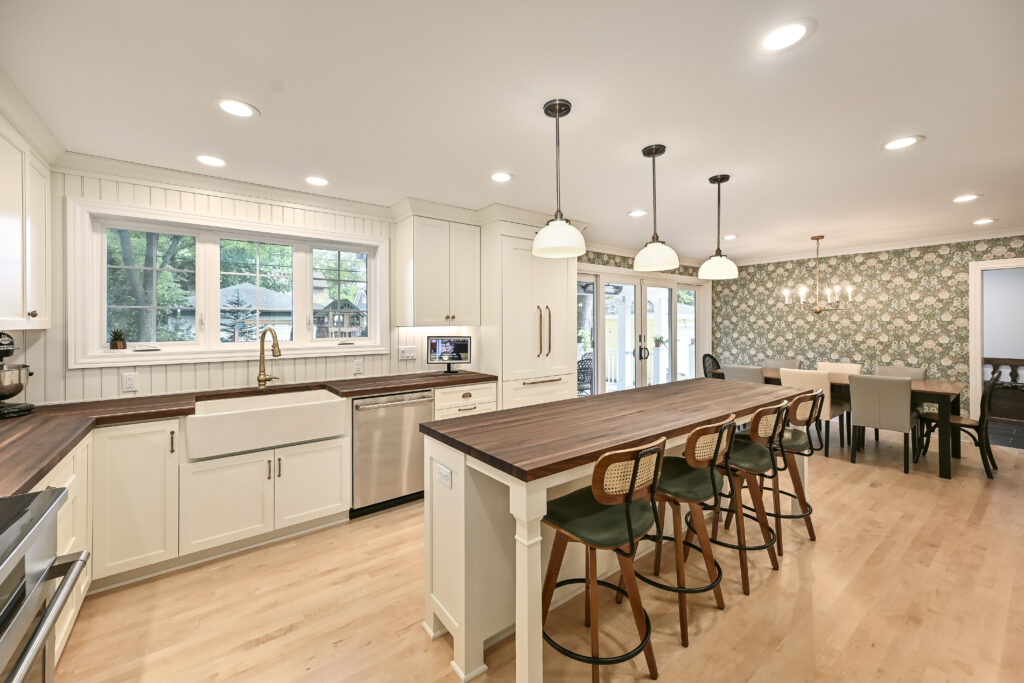 Inside, the layout was reworked to improve function and connection. The original small kitchen was converted into an office, and the former dining room addition was tied cleanly into the new space. A large new kitchen now serves as the center of the home, featuring walnut cabinetry, natural walnut countertops, maple flooring, a custom wood backsplash, a separate bar area, wallpaper accents, and an open connection to the living room.