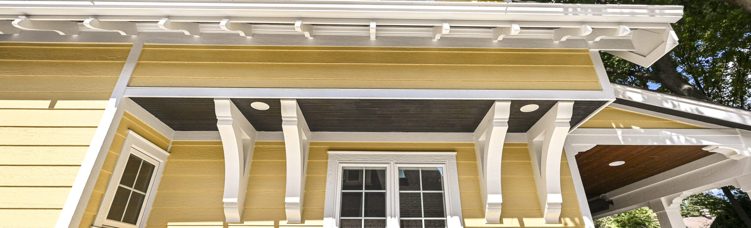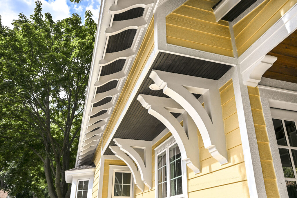 - Custom Douglas fir rafter tails, corbels, brackets, and water‑table skirt installed