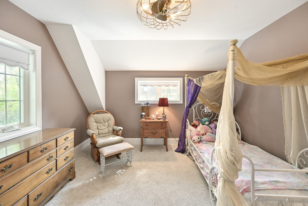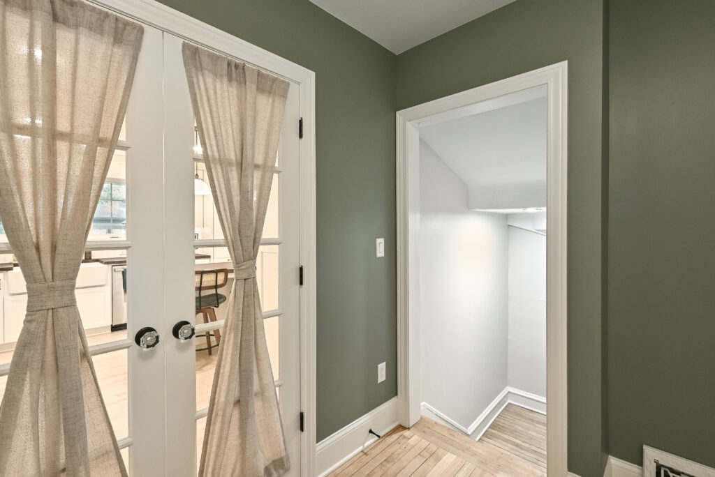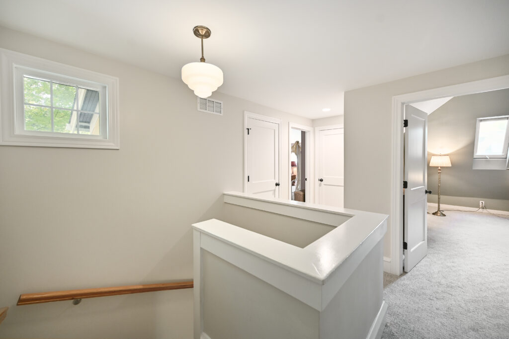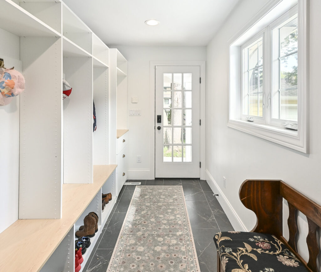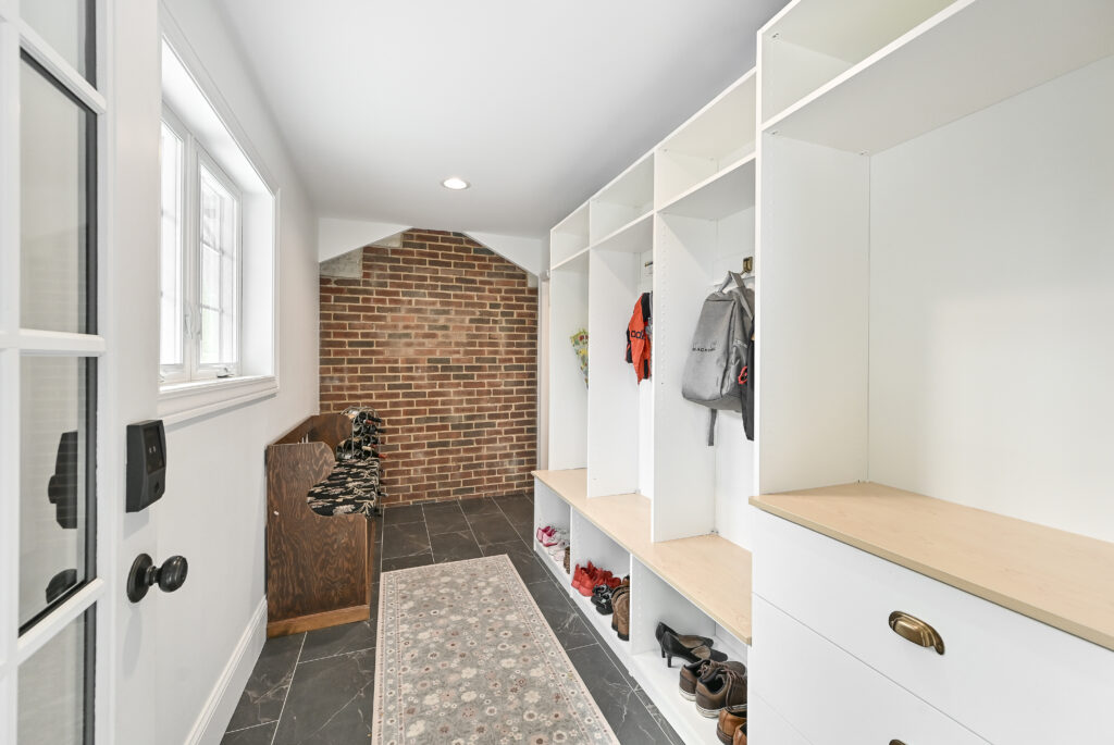 A new mudroom was added, showcasing a section of the original chimney as a built‑in architectural feature. On the second floor, an expanded stairwell leads to a new bedroom and a small kids’ bathroom, allowing the entire family to be together upstairs.