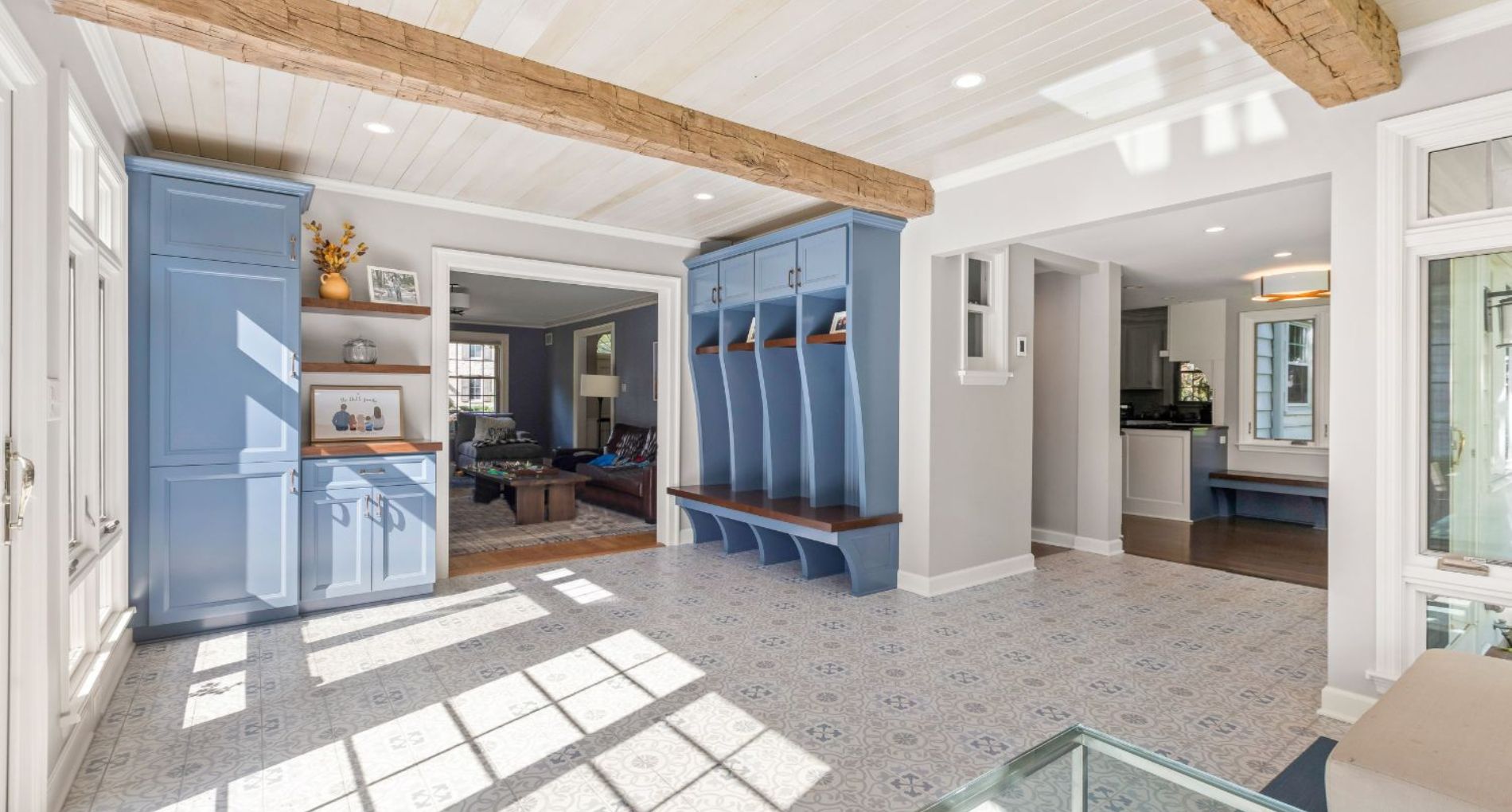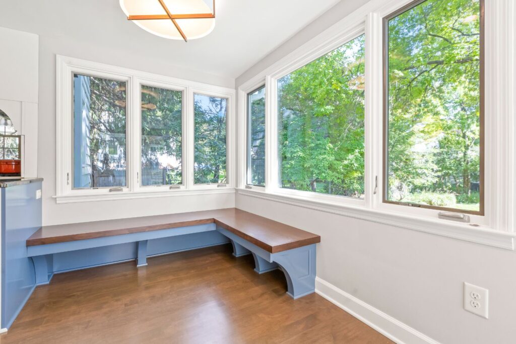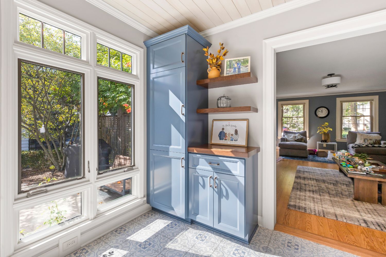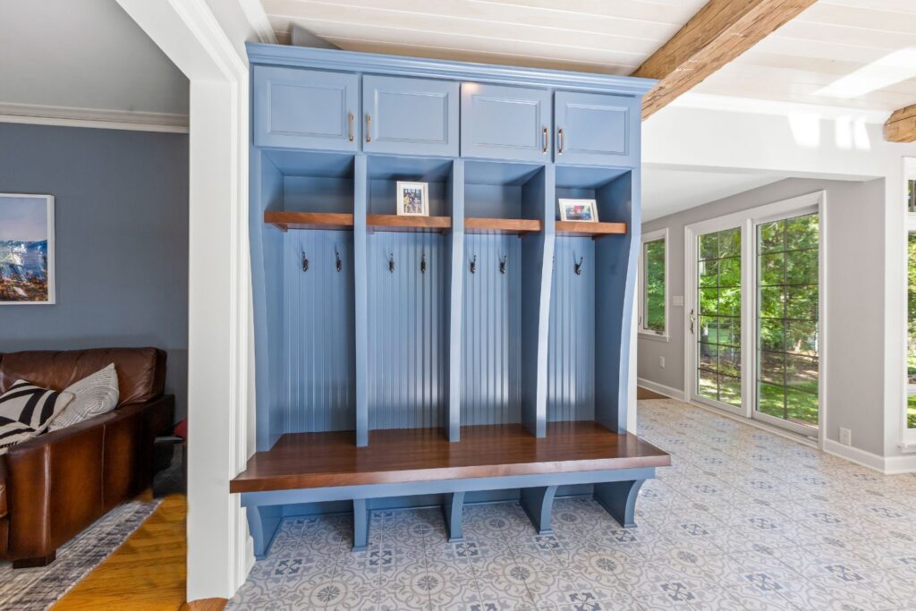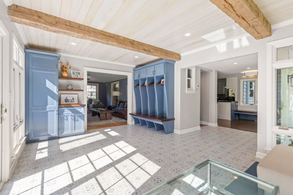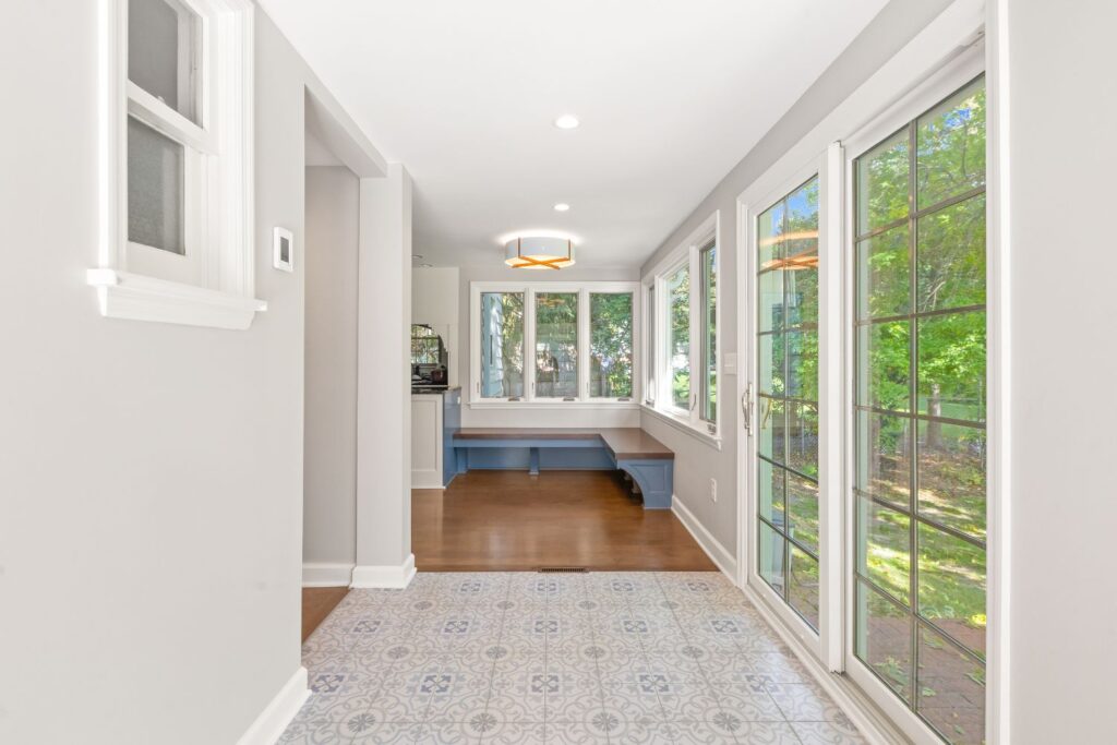 This 1934 Georgian Colonial is roughly 2400 square feet, with about 250 square feet of it being an addition that was built before this couple bought the home in the 2010’s. The addition was used as a sunroom, as it got warm sunlight all morning and afternoon. As this couple started remodeling other parts of their home, the sunroom addition quickly began to feel outdated. A major problem was that the sunroom didn’t have any forced air, so during fall and winter it was too cold to enjoy. The sunroom also felt closed off due to the doors and walls. This couple wanted a transitional remodel to make the space feel like it belonged in the home. With two children, they also wanted cubbies to keep jackets, backpacks, and shoes organized. Our solution was to open up this space and take out the doors and some of the wall, allowing anyone in the sunroom to be able to see into the family room or kitchen with ease.