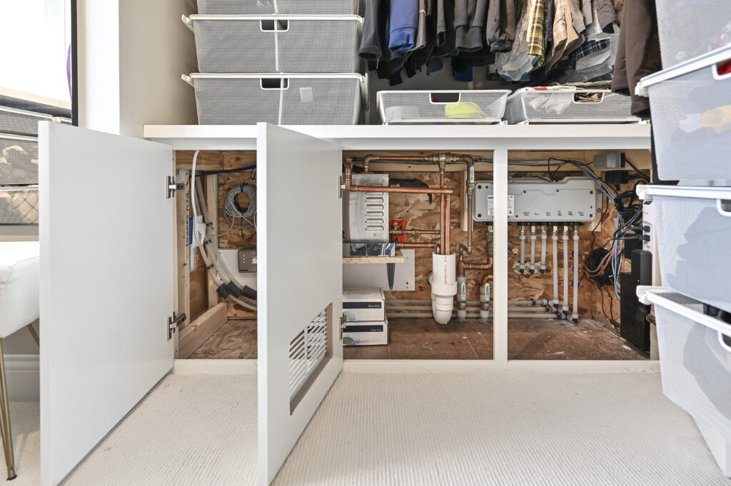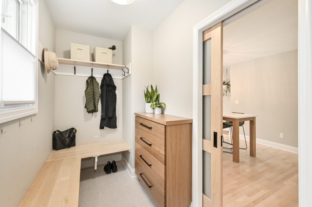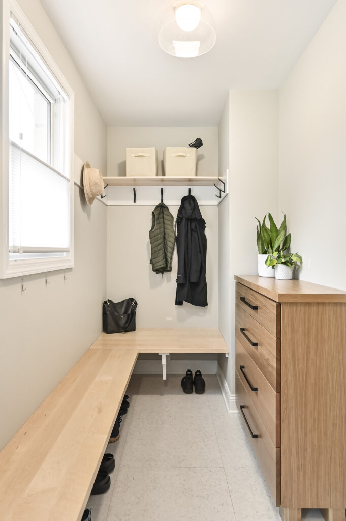 A custom mudroom with sensible storage enhances functionality, while walls were removed to create a connected living space on the first floor.