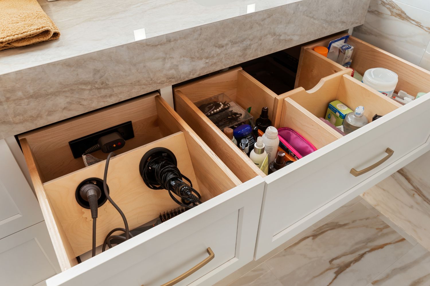 Floating Vanity, Drop Edge Countertop, Porcelain Tile Walls, Electric Outlet in Vanity Drawer