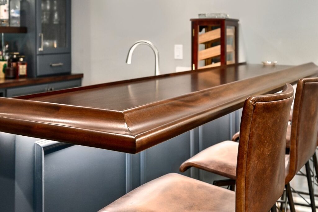 Gold Bar Foot Rail, Reclaimed and Refinished Mahogany Bar Top, Custom Walnut Bar