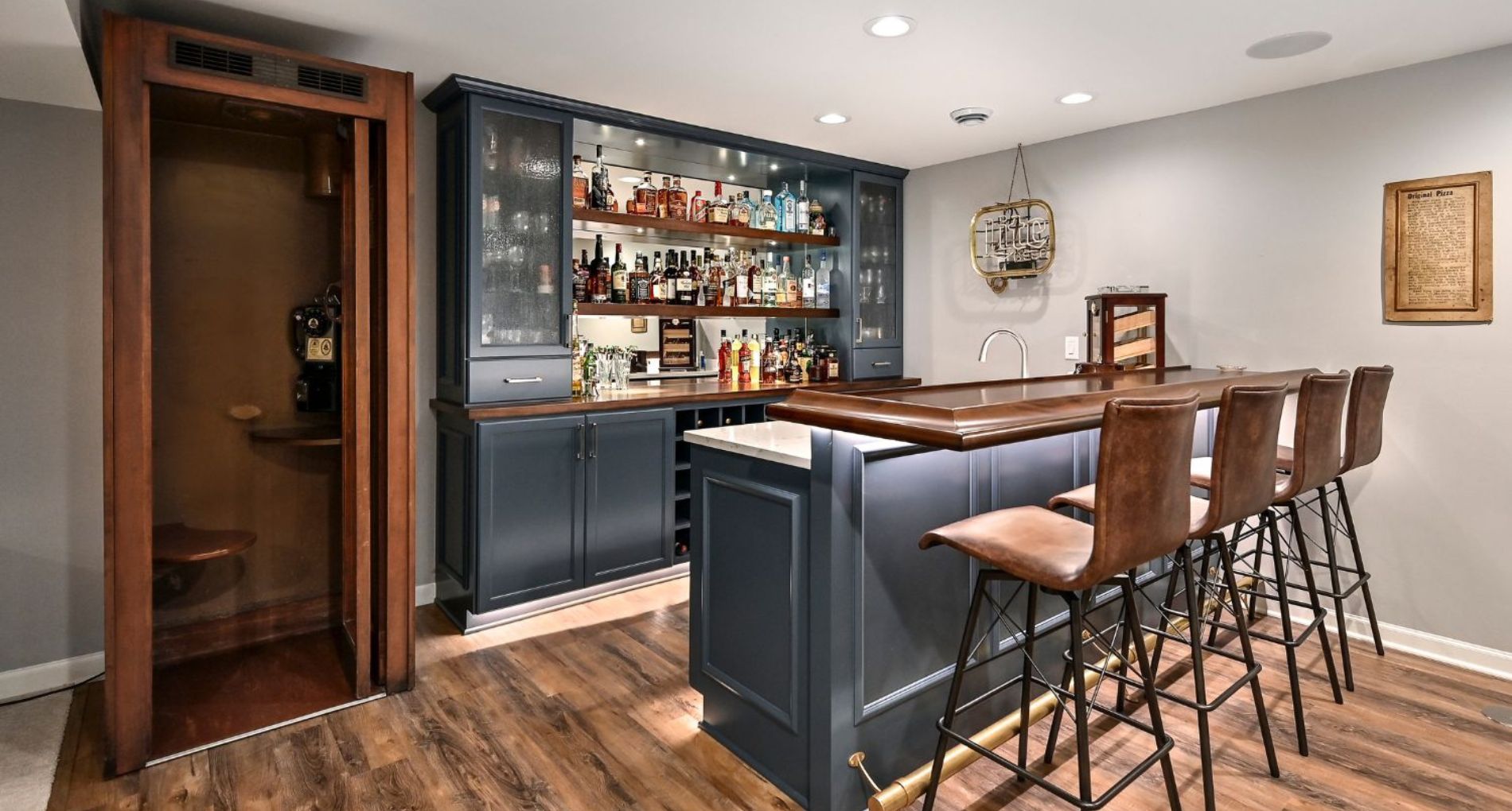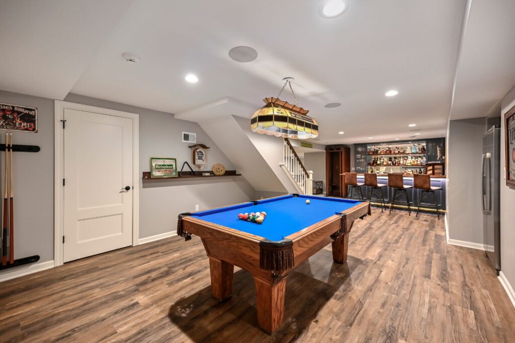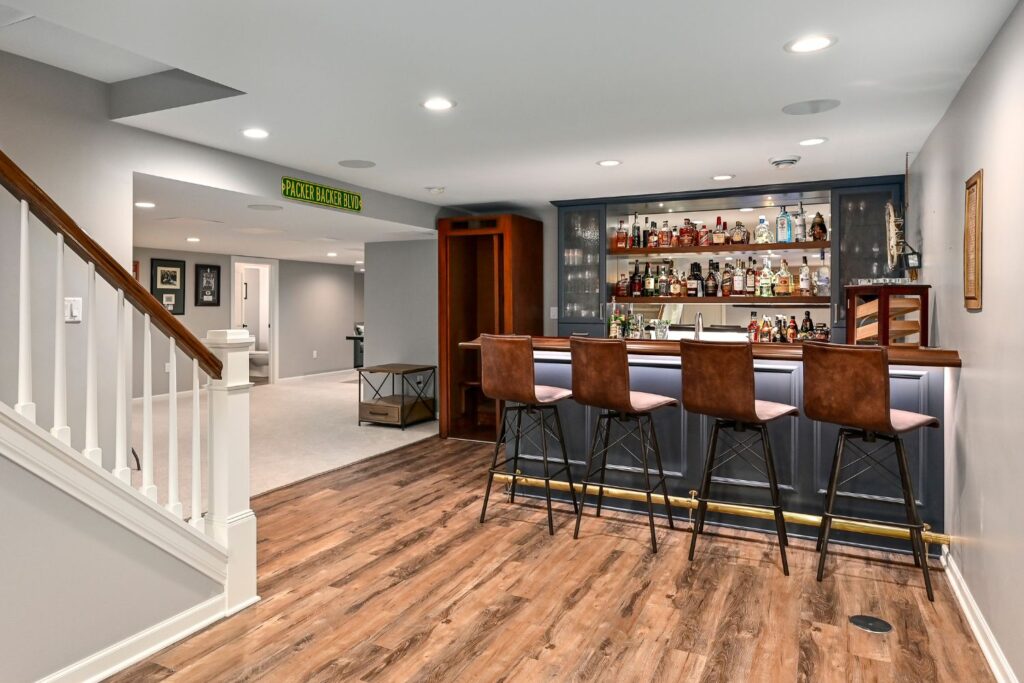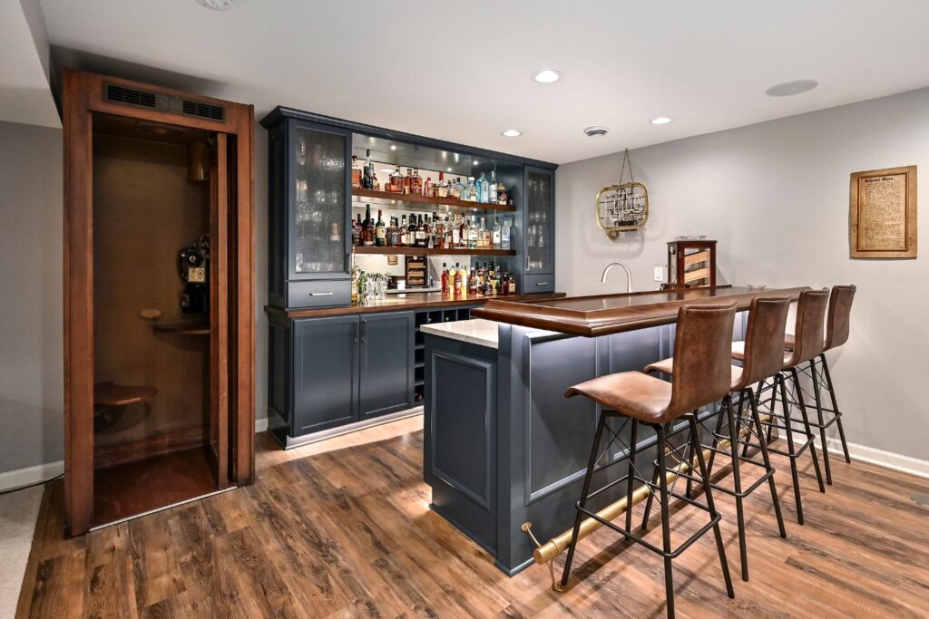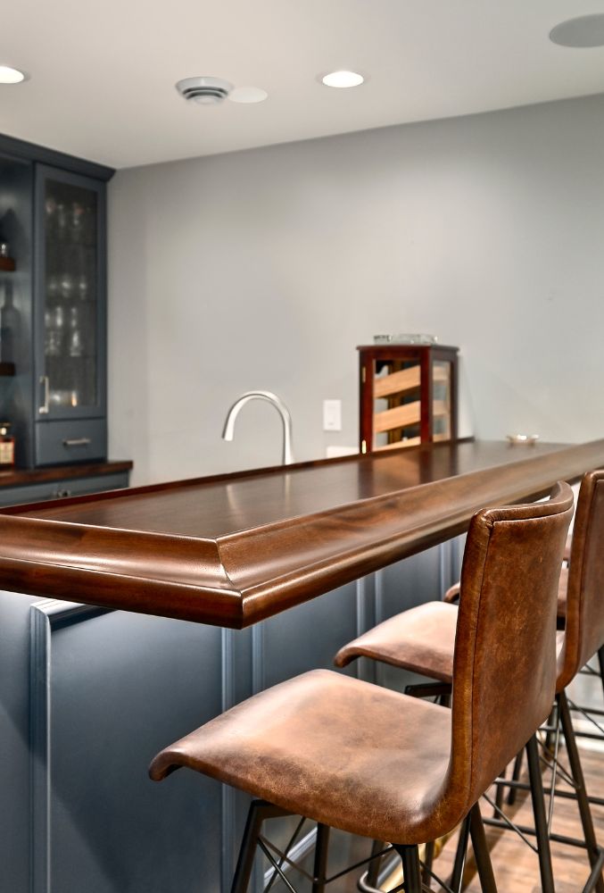 While we were in the middle of substantially remodeling the first and second floor of this home, the homeowners realized that they didn’t want to neglect the lower level and keep it hidden. The lower level was fully updated, with the addition of a powder room, rec room, living room, and custom walnut bar, featuring a reclaimed and refinished mahogany top which had specific sentimental value to our client. Finishes and fixtures throughout this home are of the highest quality and are intended to create an atmosphere of comfort and luxury throughout.