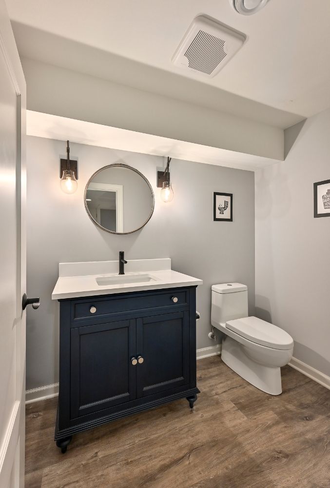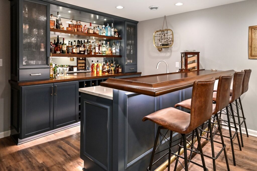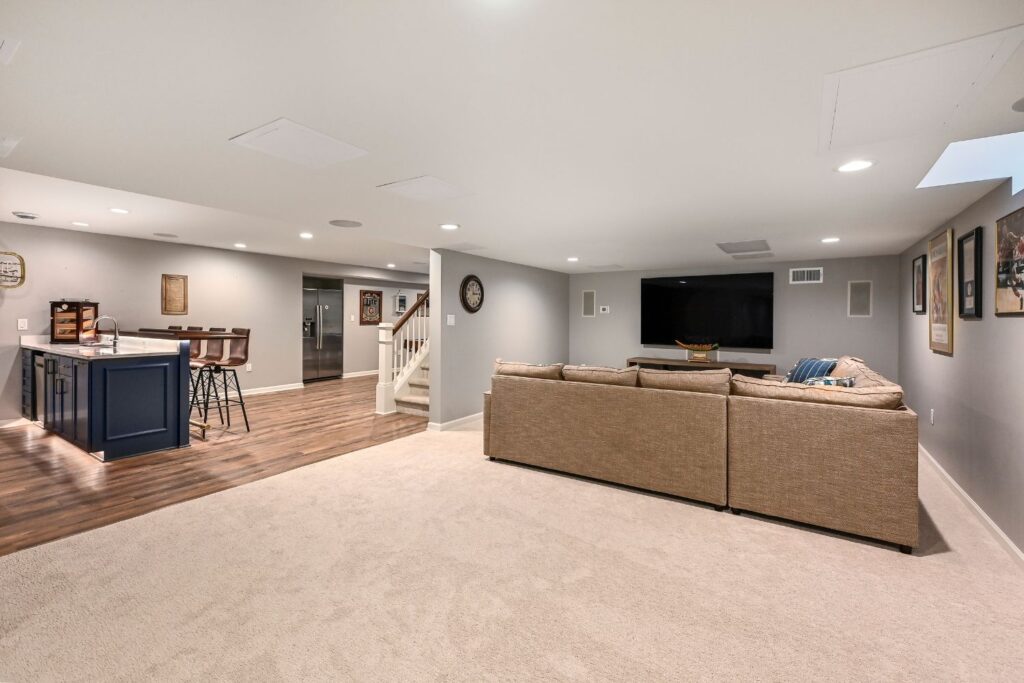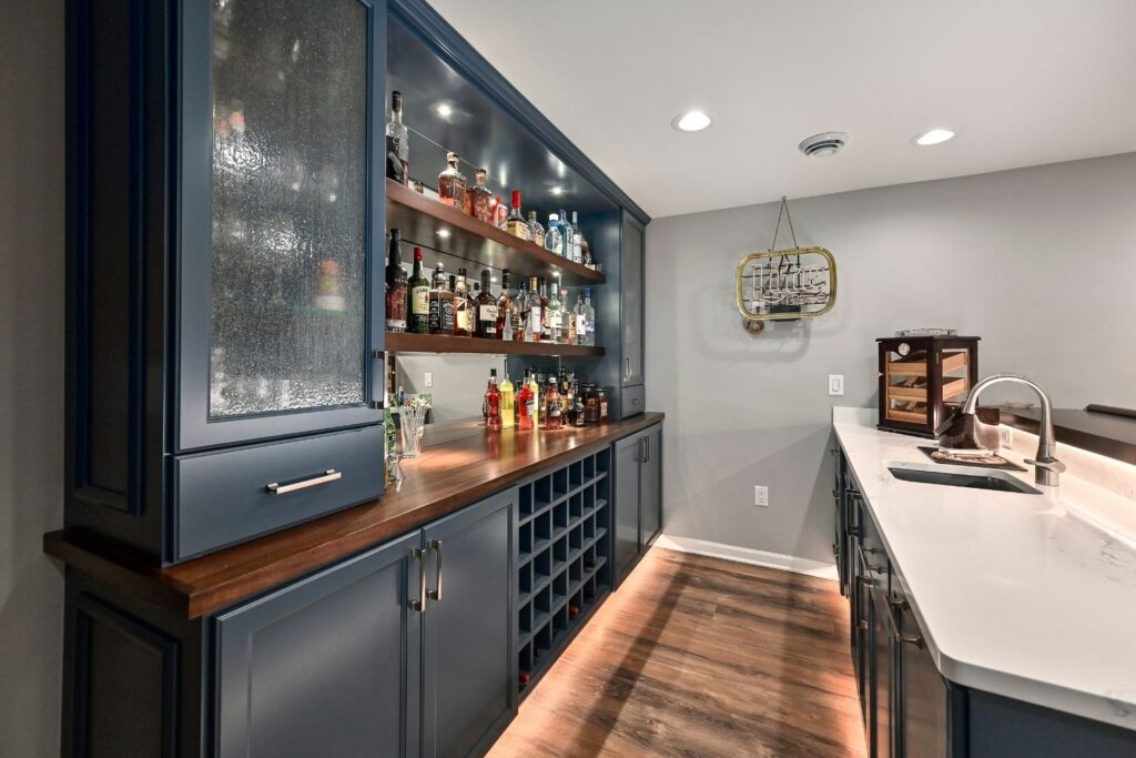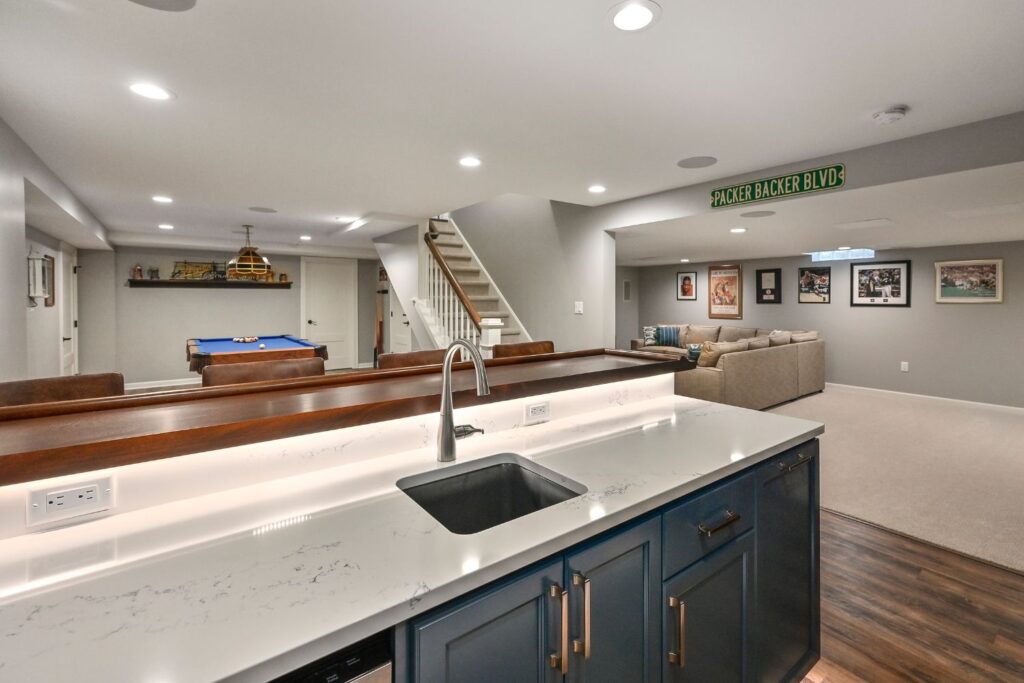 While we were in the middle of substantially remodeling the first and second floor of this home, the homeowners realized that they didn’t want to neglect the lower level and keep it hidden. The lower level was fully updated, with the addition of a powder room, rec room, living room, and custom walnut bar, featuring a reclaimed and refinished mahogany top which had specific sentimental value to our client. Finishes and fixtures throughout this home are of the highest quality and are intended to create an atmosphere of comfort and luxury throughout.