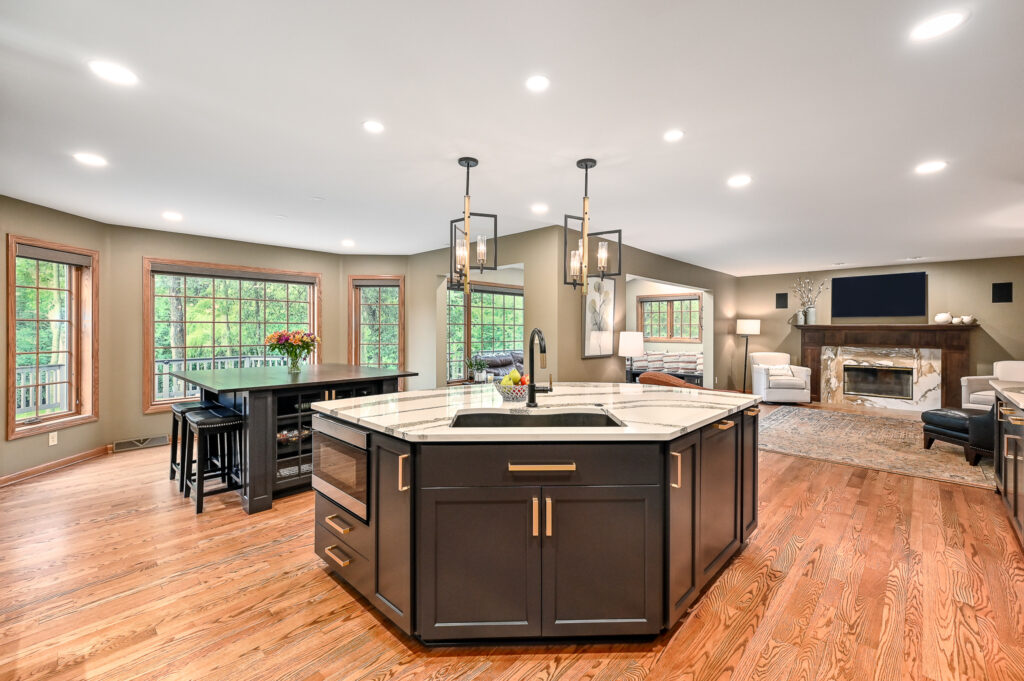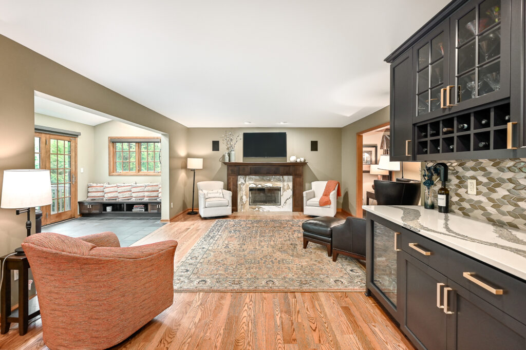 In 2021, we completed a remodel for this family by opening the kitchen to the dining room, allowing both spaces to communicate and function together. We also updated the family room fireplace and reoriented that room so that the kitchen and family room felt like a combined space.