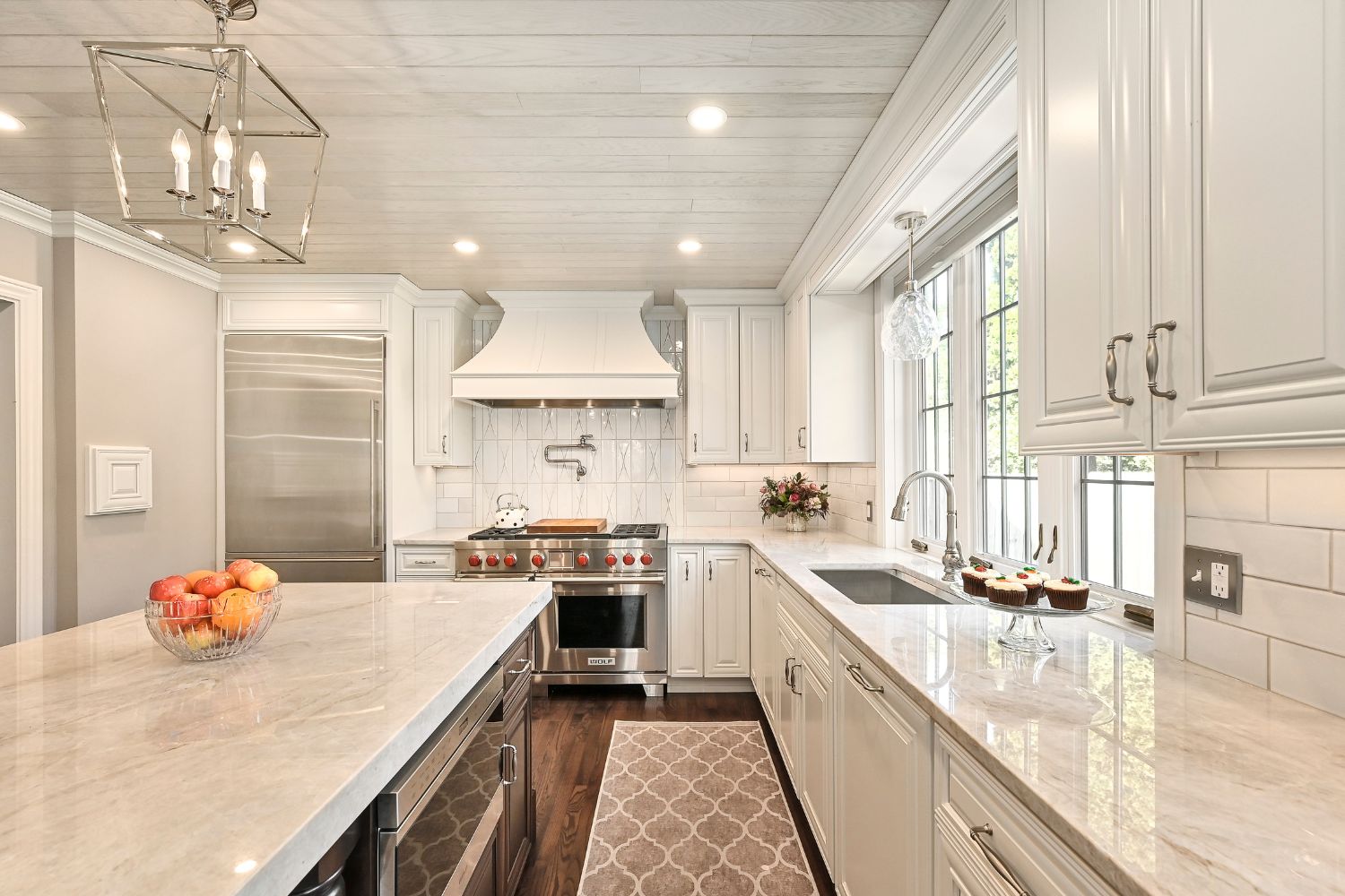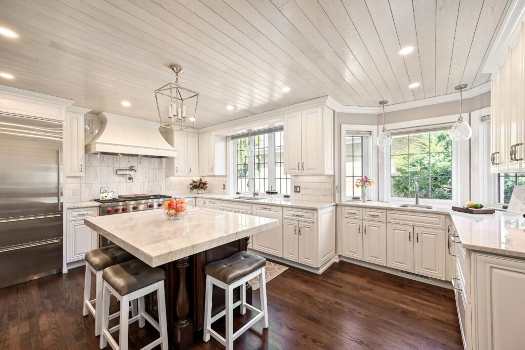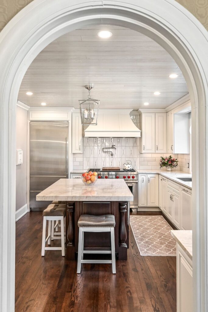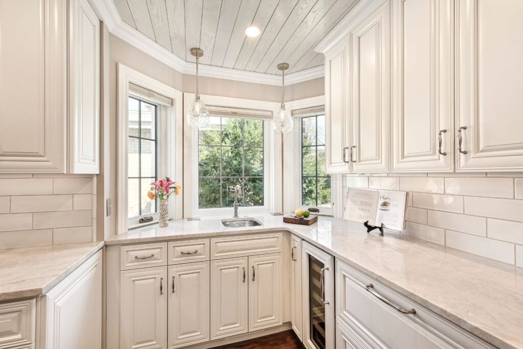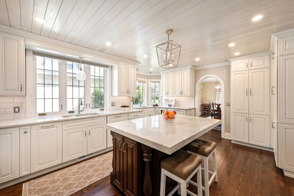 The kitchen previously felt like a maze due to a peninsula that cut off the flow of the space. The dark colors throughout the kitchen made it feel really cramped and cluttered. Our clients wanted bright, fresh, and crisp. The custom cabinetry is balanced perfectly with the white quartzite countertops and white oak ceiling. The peninsula was replaced with an island which created a natural flow where the family of 5 can cook and spend time with one another.