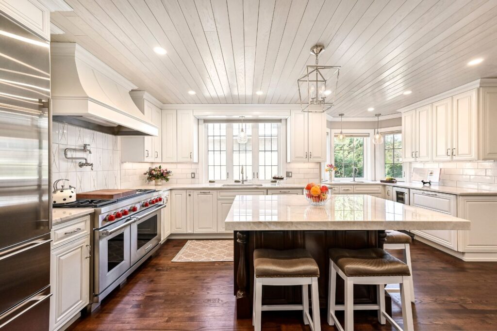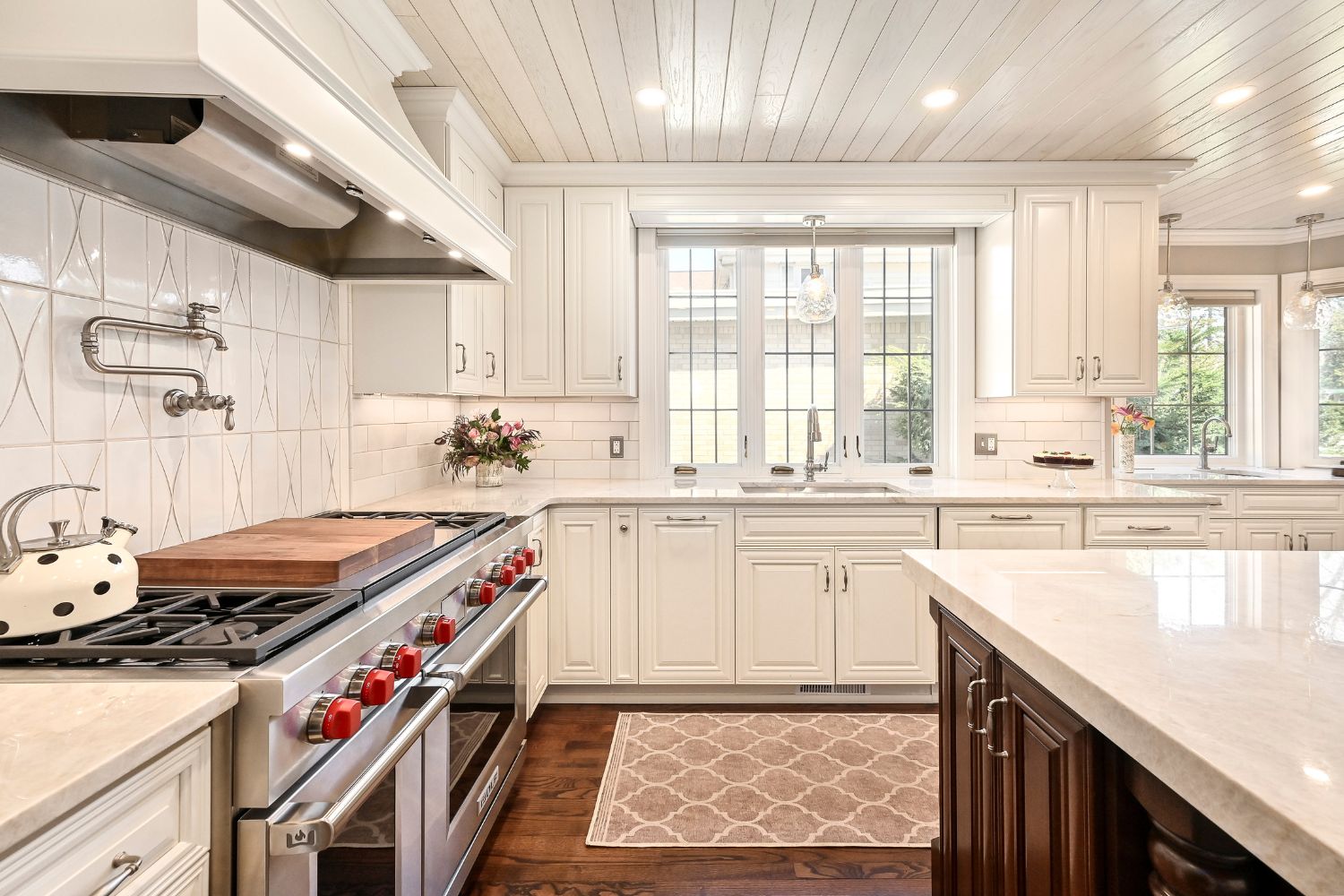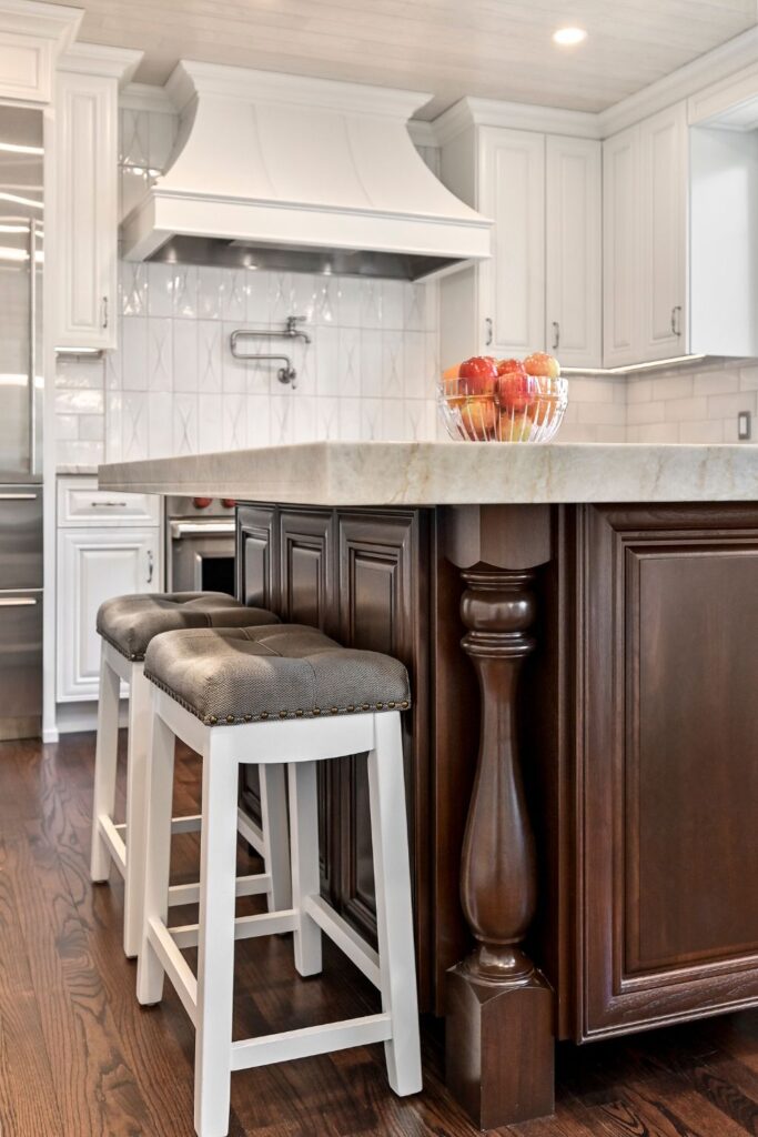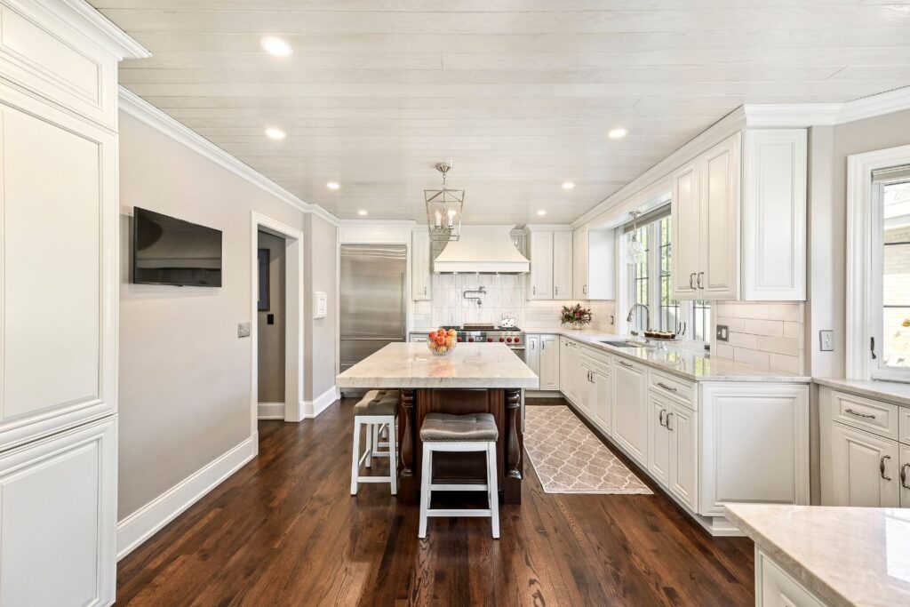 The kitchen previously felt like a maze due to a peninsula that cut off the flow of the space. The dark colors throughout the kitchen made it feel really cramped and cluttered. Our clients wanted bright, fresh, and crisp. The custom cabinetry is balanced perfectly with the white quartzite countertops and white oak ceiling. The peninsula was replaced with an island which created a natural flow where the family of 5 can cook and spend time with one another.