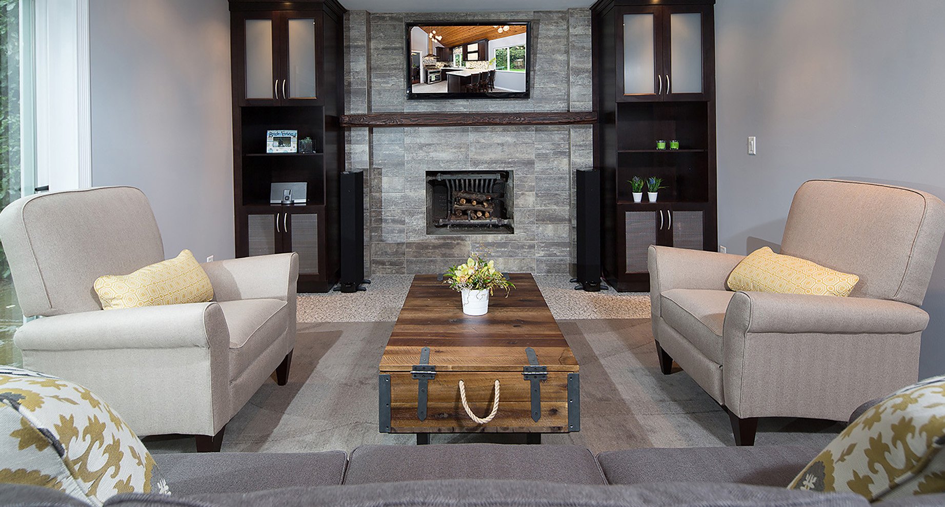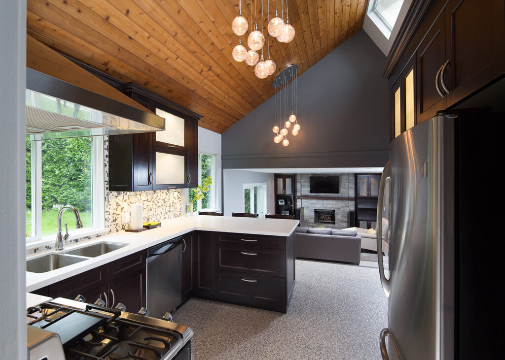 Renovation features a modern and functional update to the kitchen and sunken family room, laundry room, and powder room.