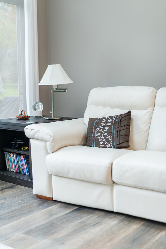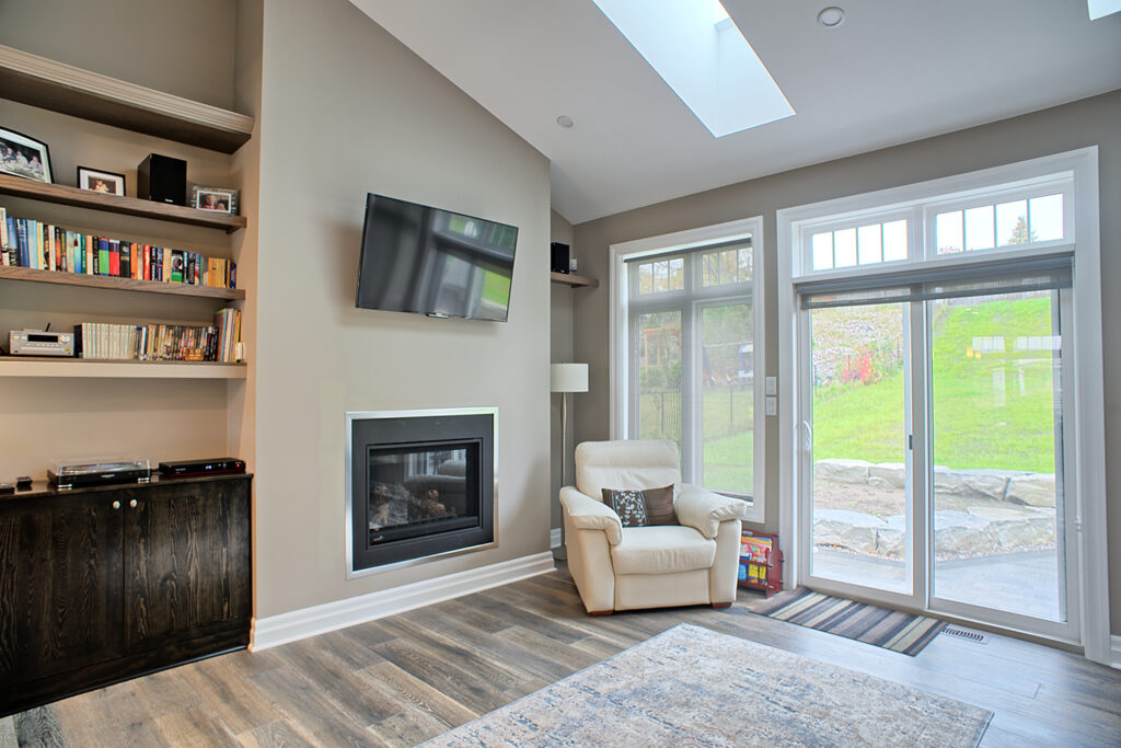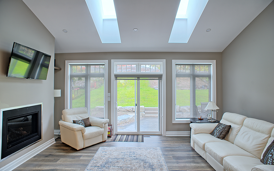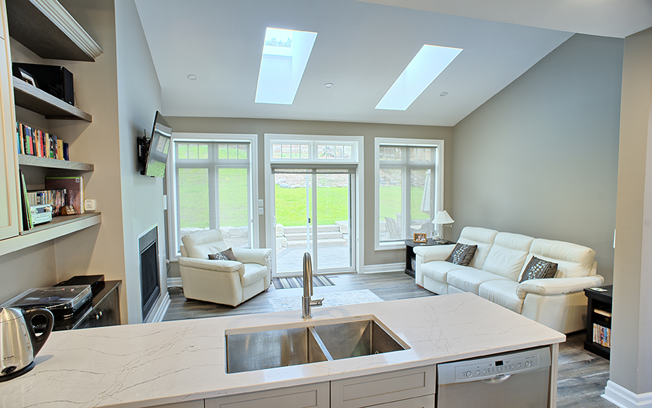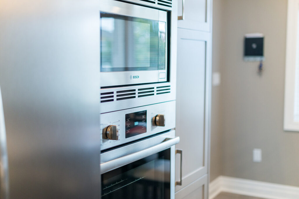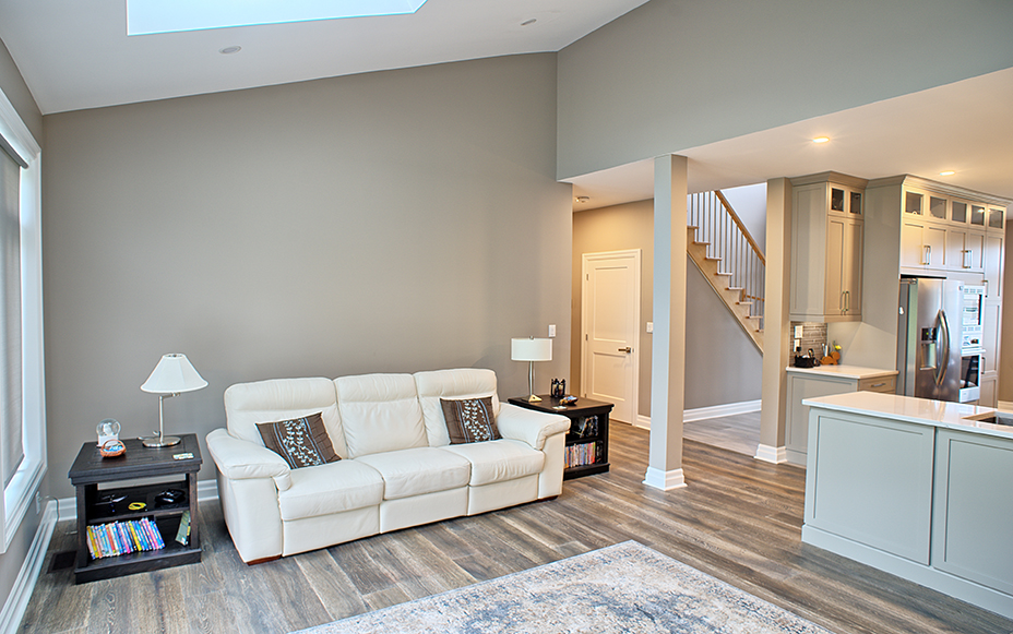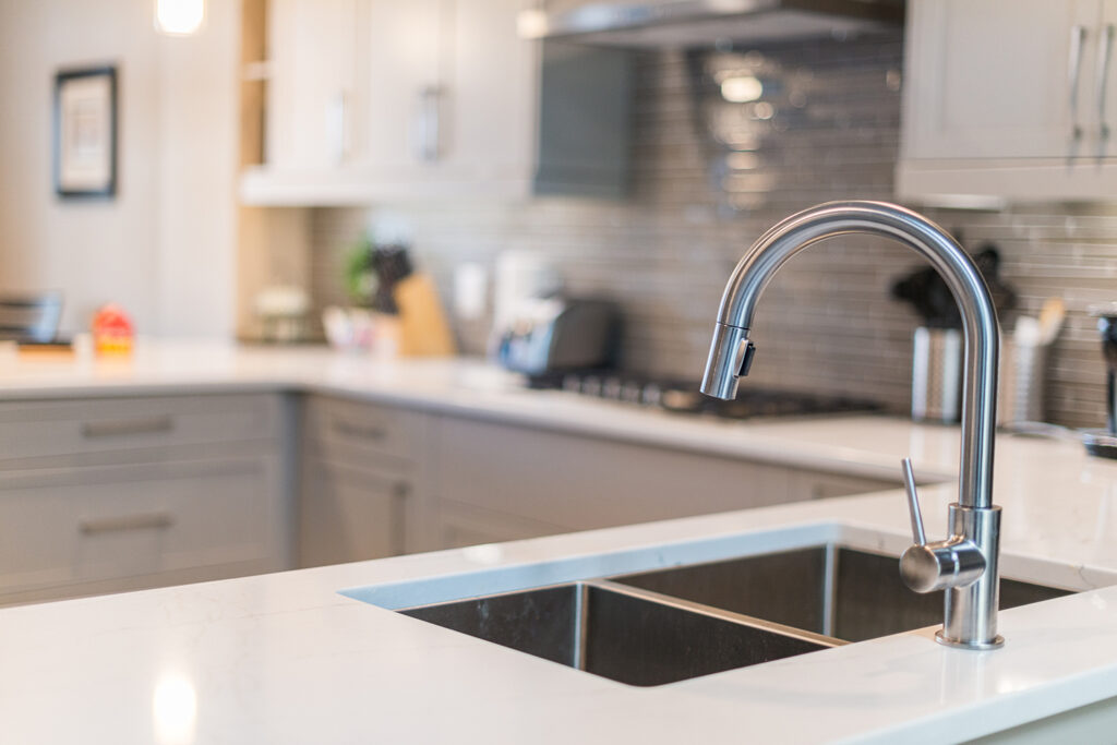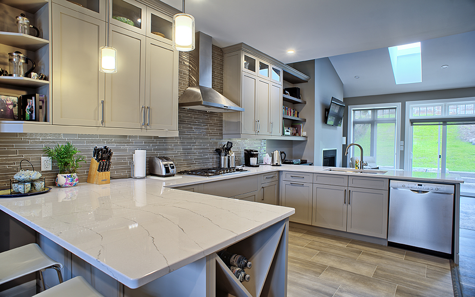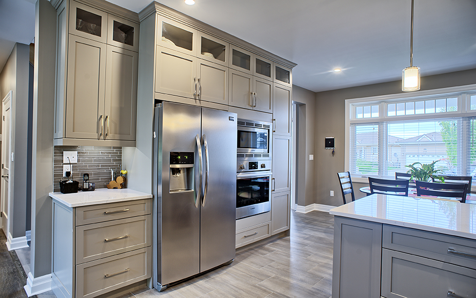 This custom home features an open-concept great room; joining the kitchen, dining, and living room together for a bright and open feel. The light greys and whites, coupled with glass tile backsplash in the kitchen, and other high-end finishes, brings together this modern design.