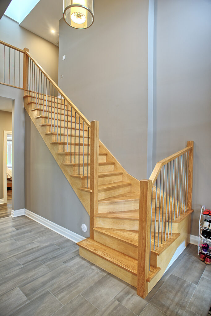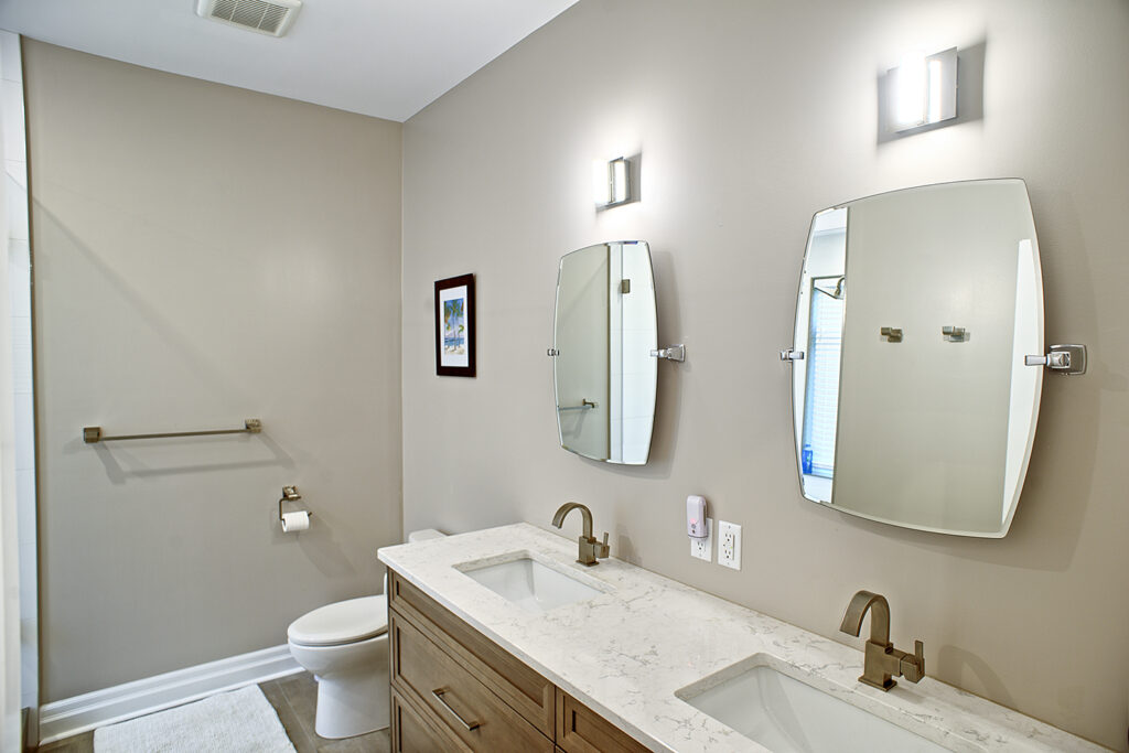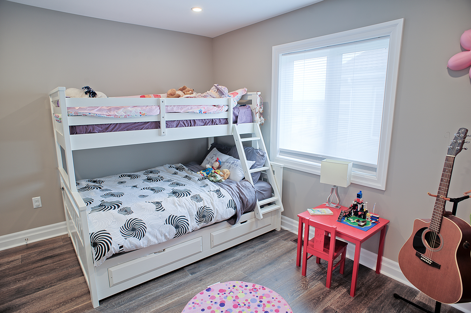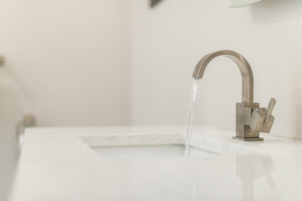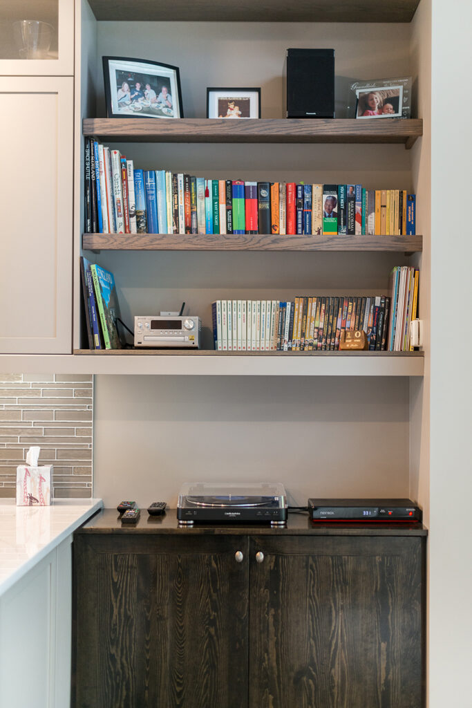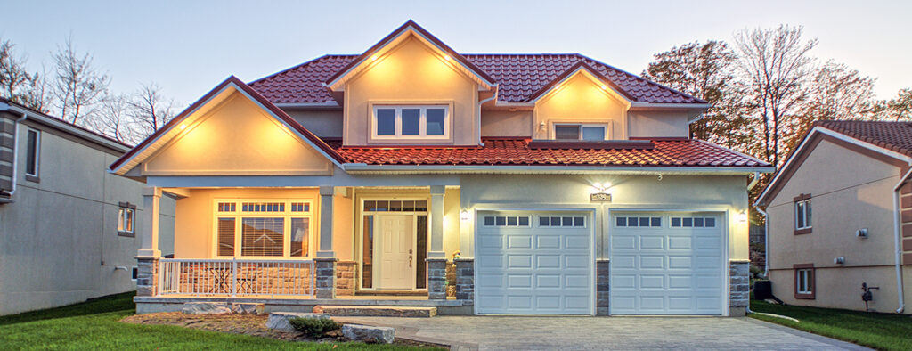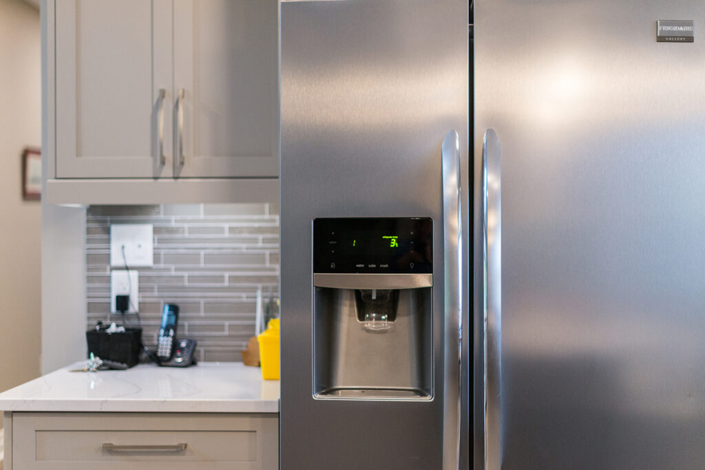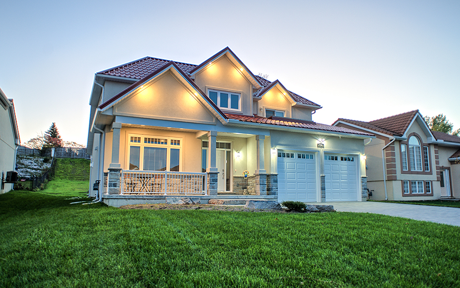 This custom home features an open-concept great room; joining the kitchen, dining, and living room together for a bright and open feel. The light greys and whites, coupled with glass tile backsplash in the kitchen, and other high-end finishes, brings together this modern design.