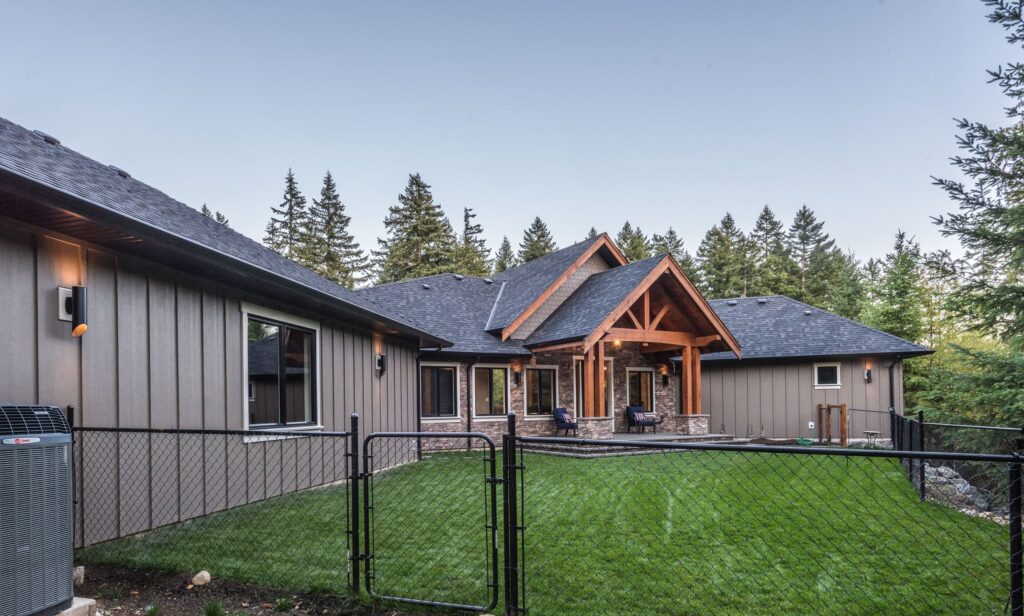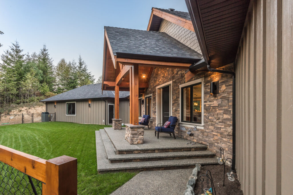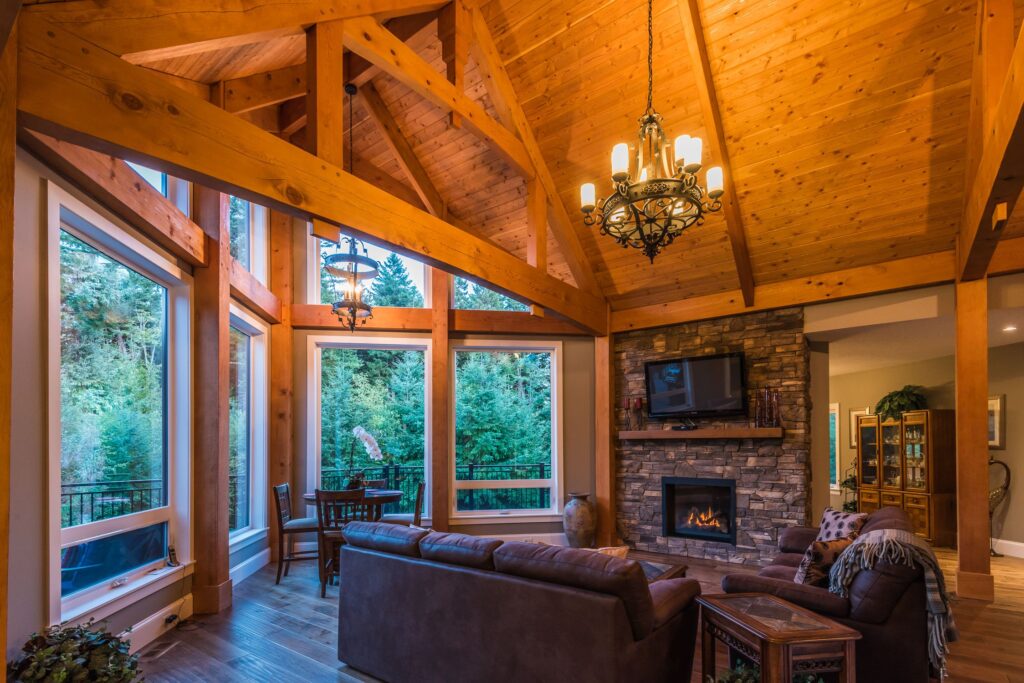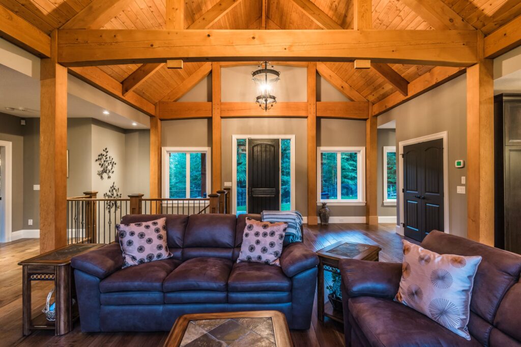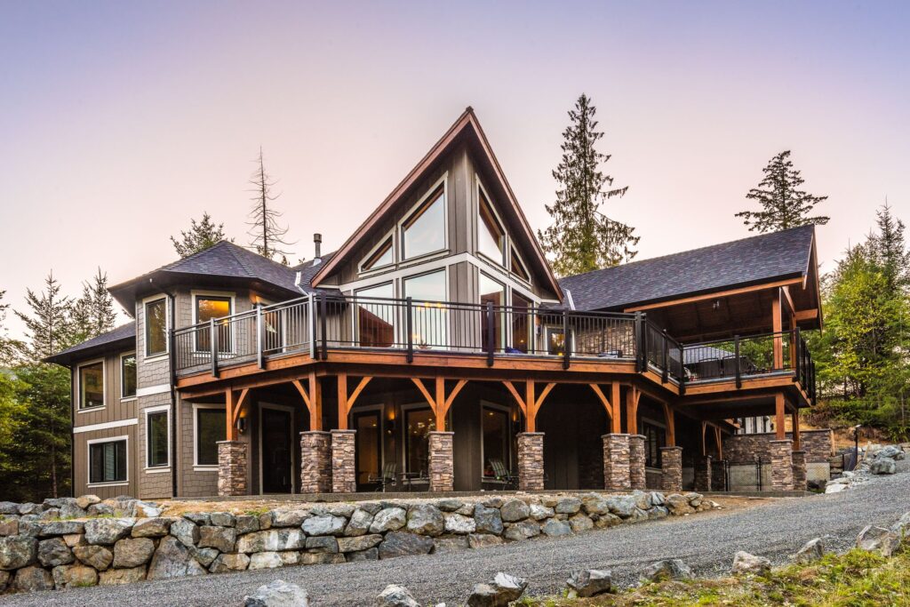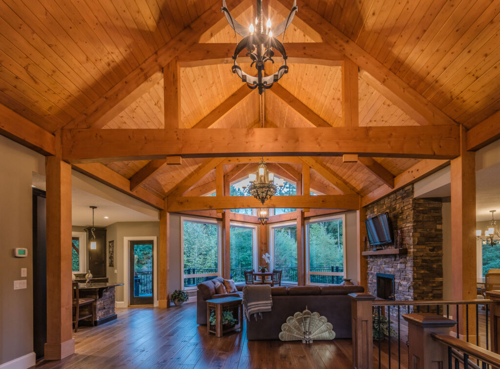 This 3 bedroom, 3 ½ bath custom home has a great rustic in-the-woods feel, with spectacular timber frame beams, an a-frame open concept great room, and a focus on natural elements and materials throughout the home. The homeowners didn’t want to cut down any of the surrounding trees on the property and chose to orient the home so that the forest was the primary view. The end result is a true “cabin in the woods” experience.