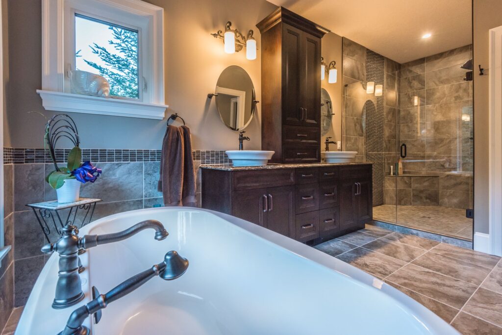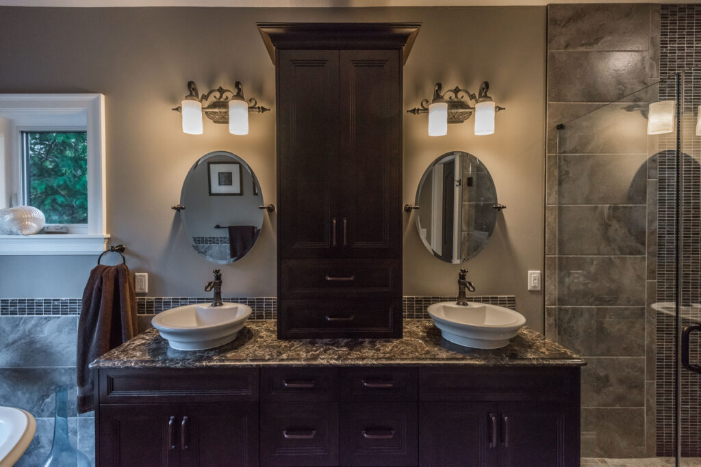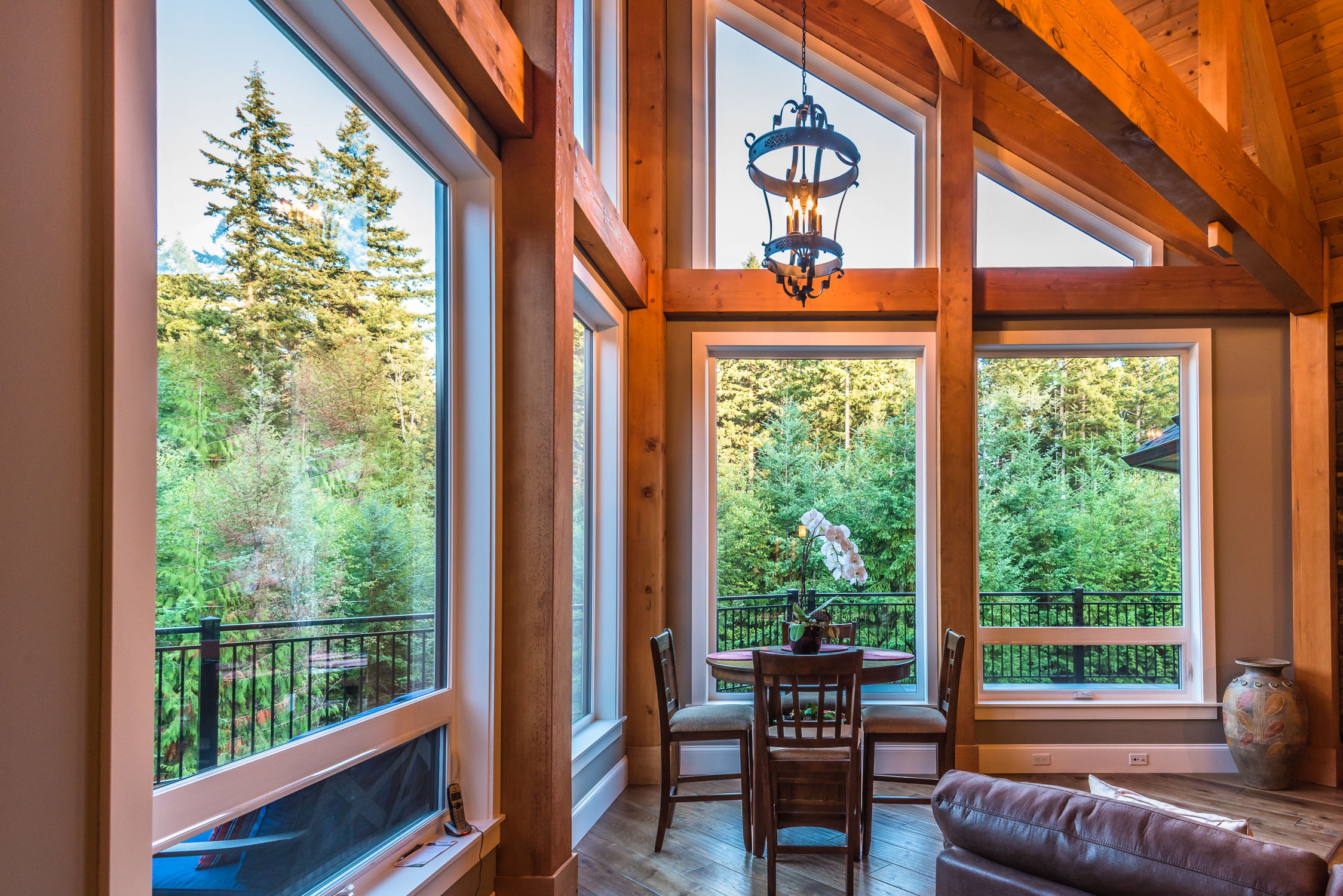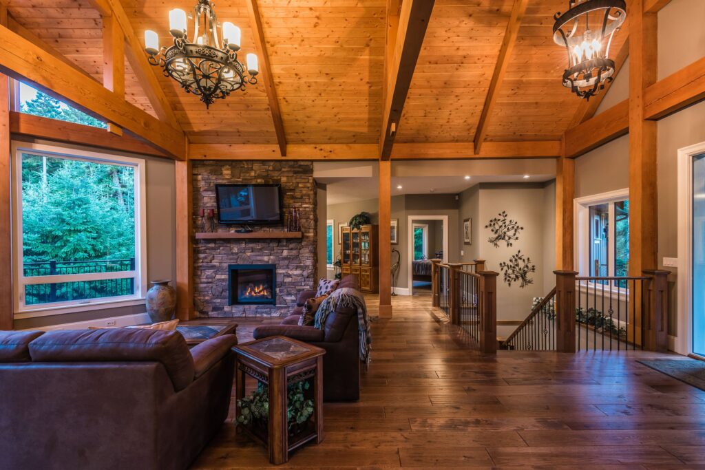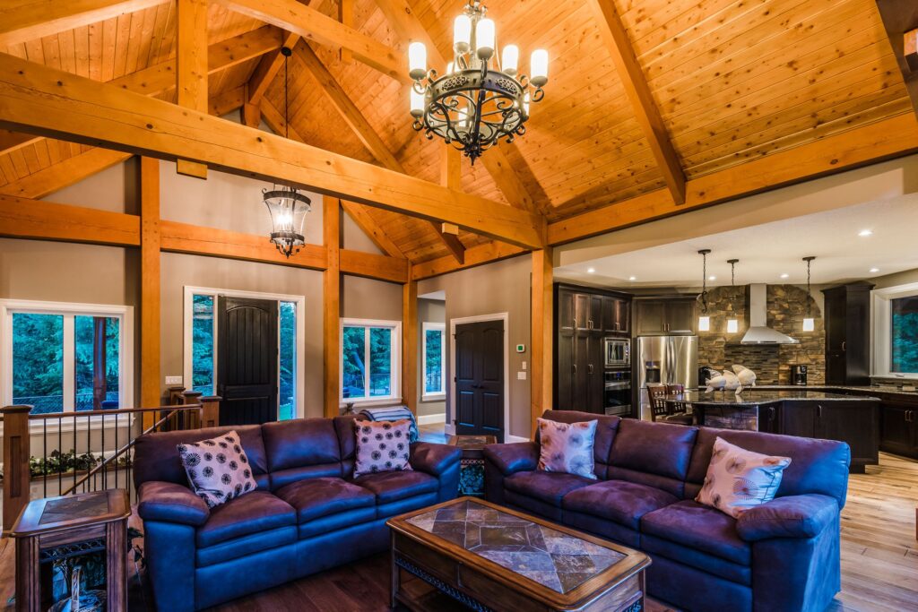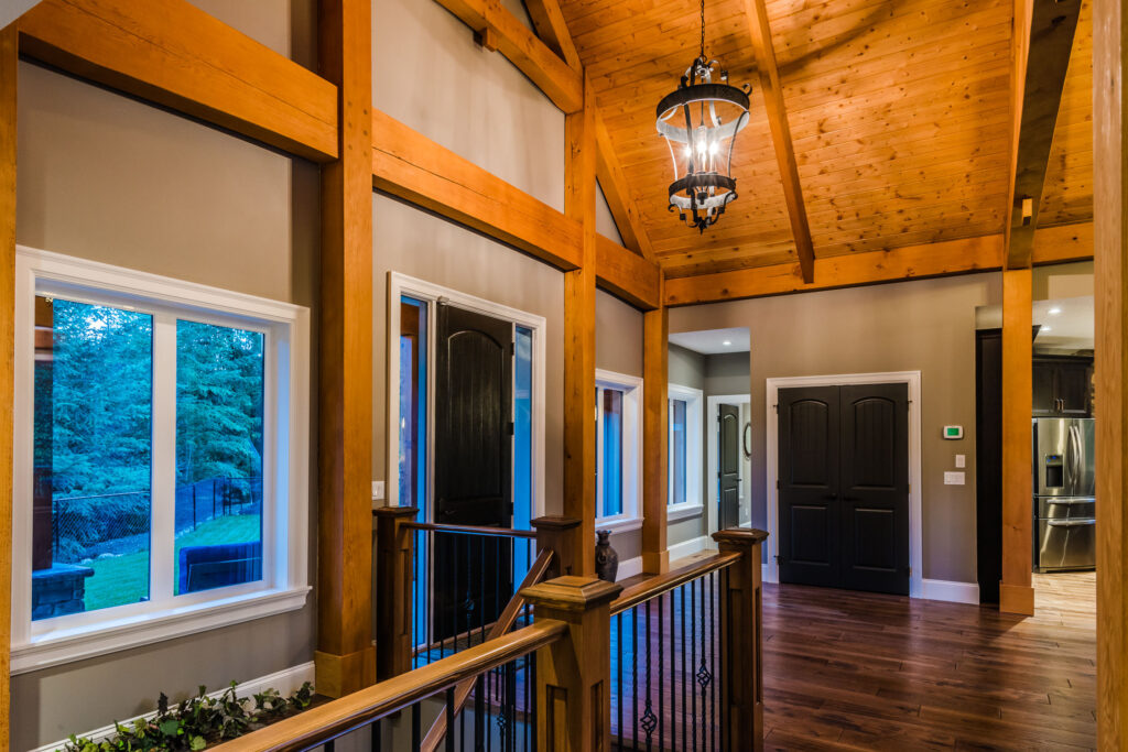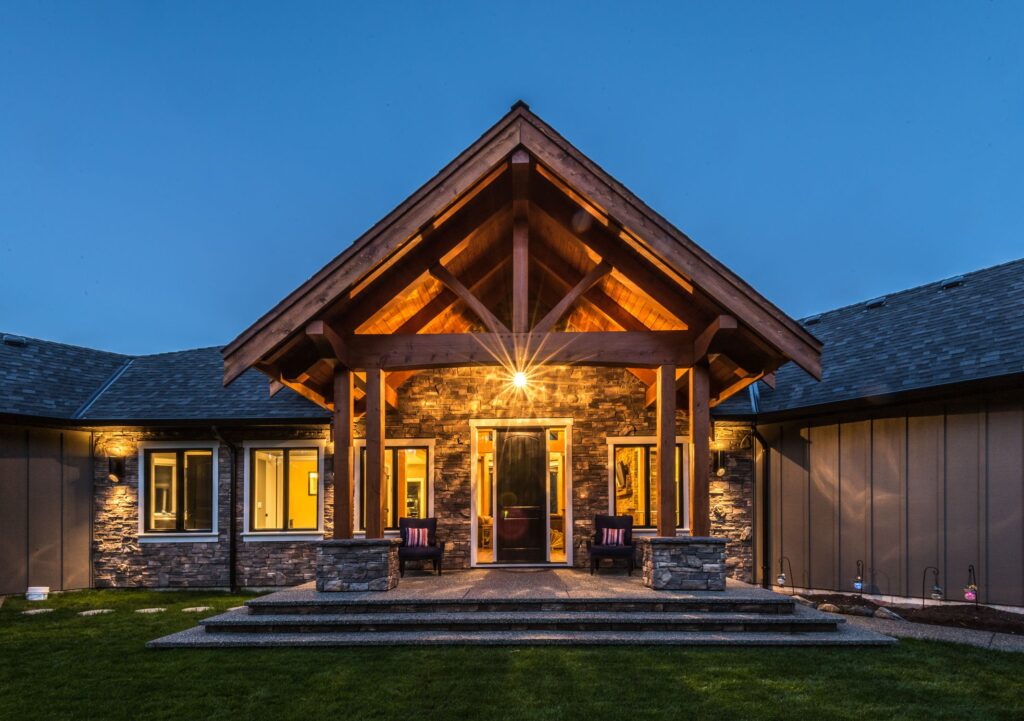 The finishes throughout the home are high end but rustic, including K2 Stone, Alder cabinetry, granite countertops, oil-rubbed bronze hardware, free standing soaker tubs in the bathrooms, hickory hardwood flooring, timber framing inside and out, and Hardie plank siding with cedar shingles.
